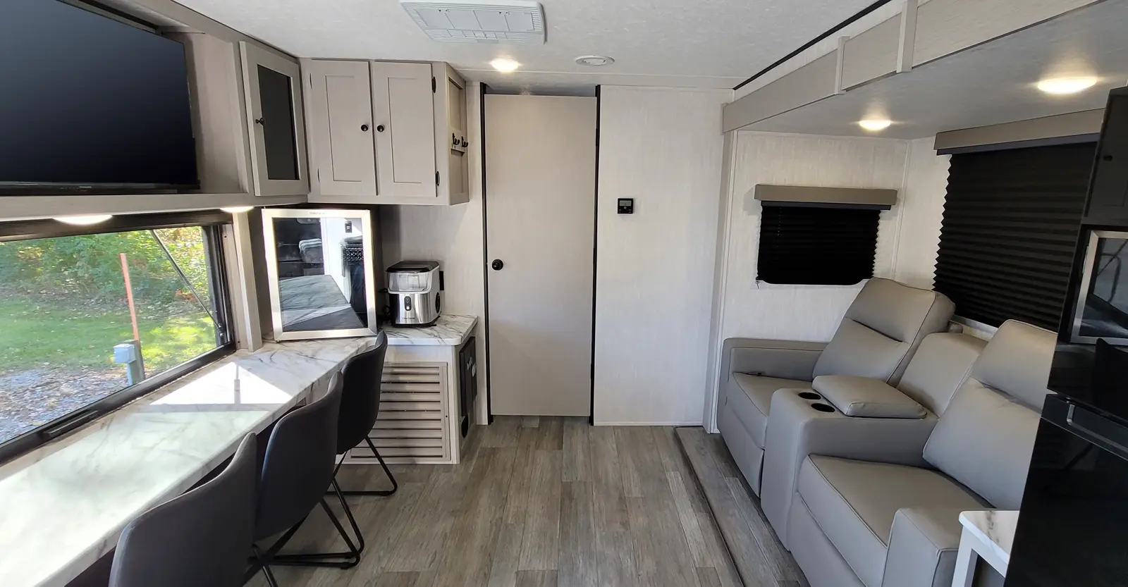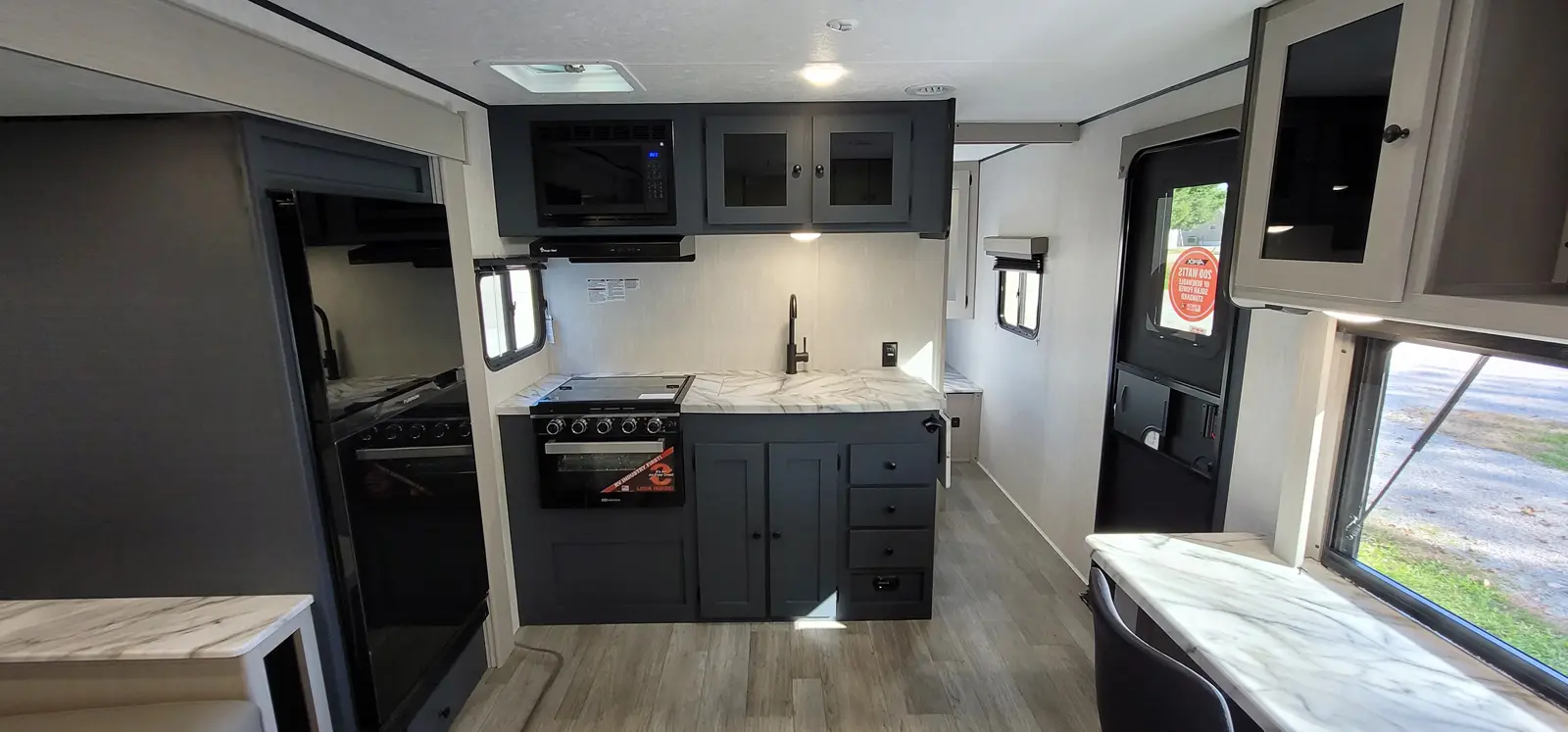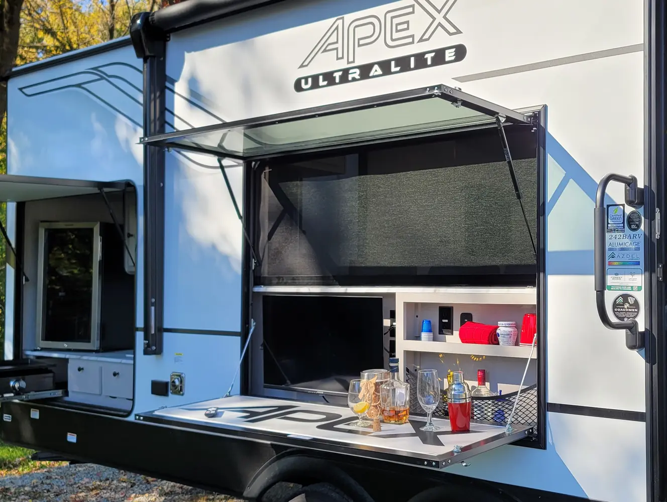 The Apex Ultra-Lite 242BARV floorplan has one entry and one slide out. Exterior features include: fiberglass exterior, 16' awning and outside kitchen. Interiors features include: front bedroom.