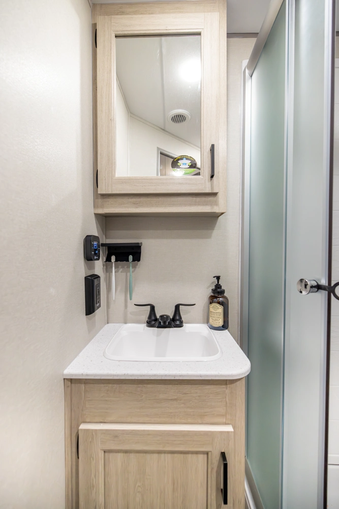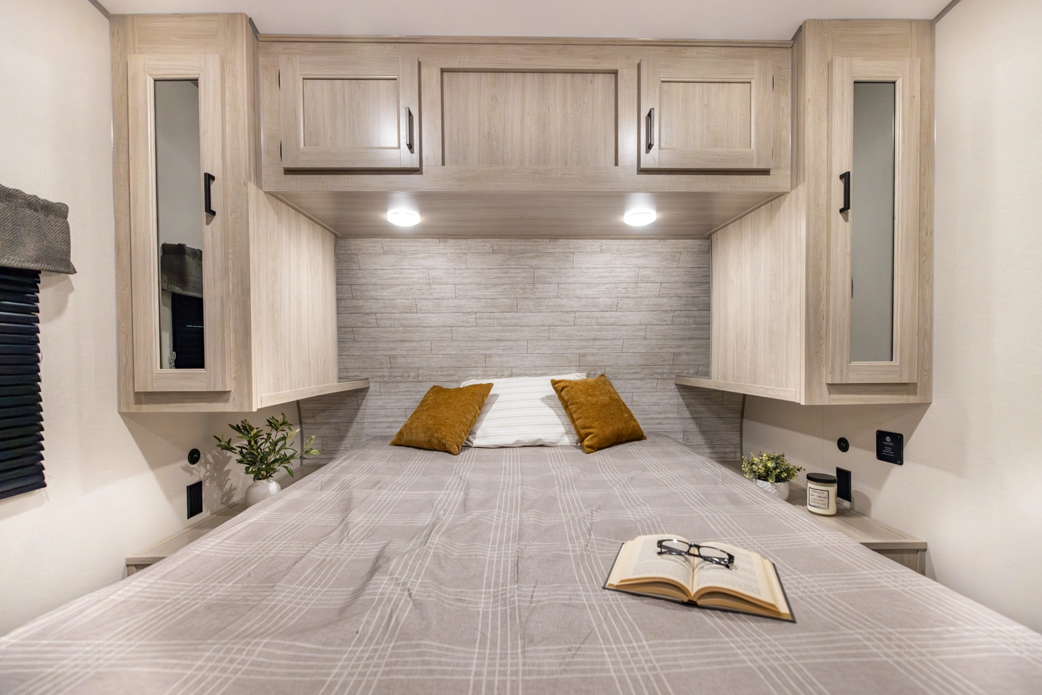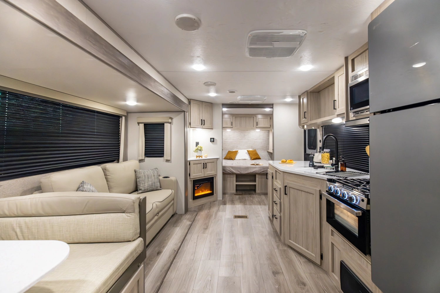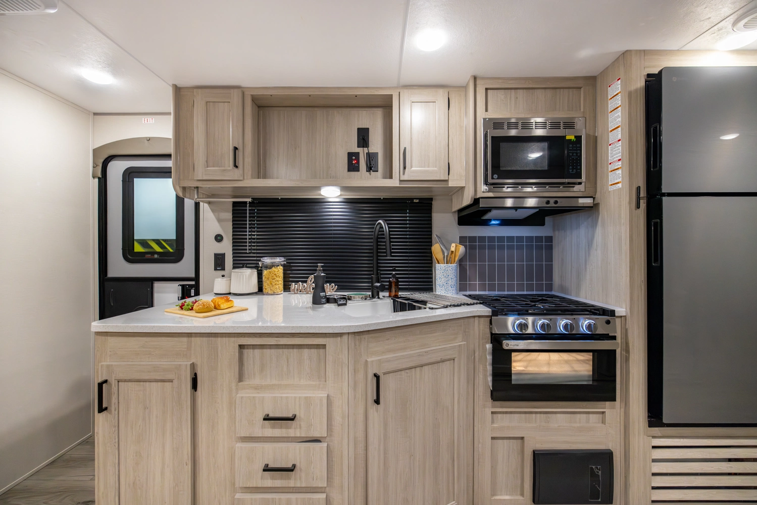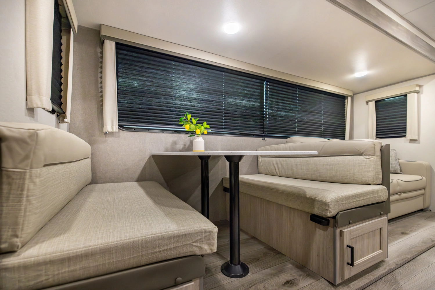 The popular 243RBS is the ideal couple’s coach! This floorplan boasts a full-size super slide with both a dinette and sofa, a spacious rear bathroom with a walk-in shower, extra-large pantry/wardrobe storage, a breakfast bar and private bedroom. The half-ton friendly towing weight and under 30’ real length makes this camper perfect for cross country travel or local weekend getaways!