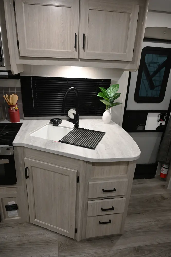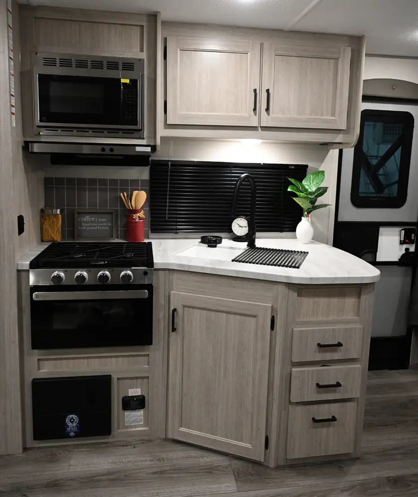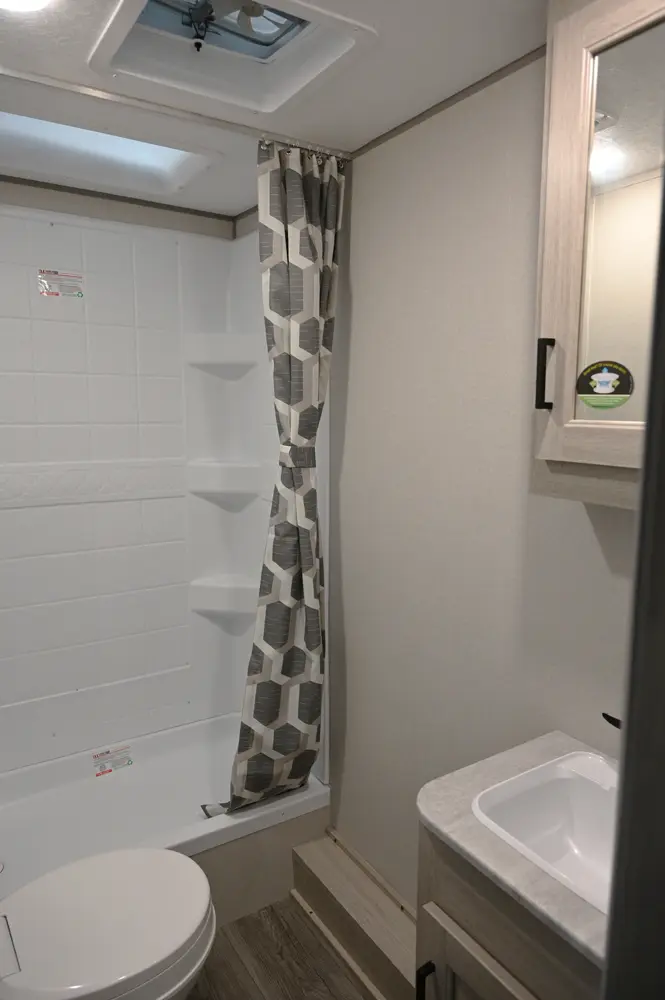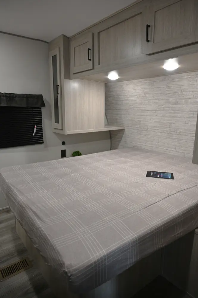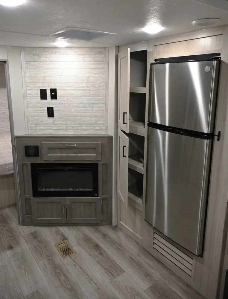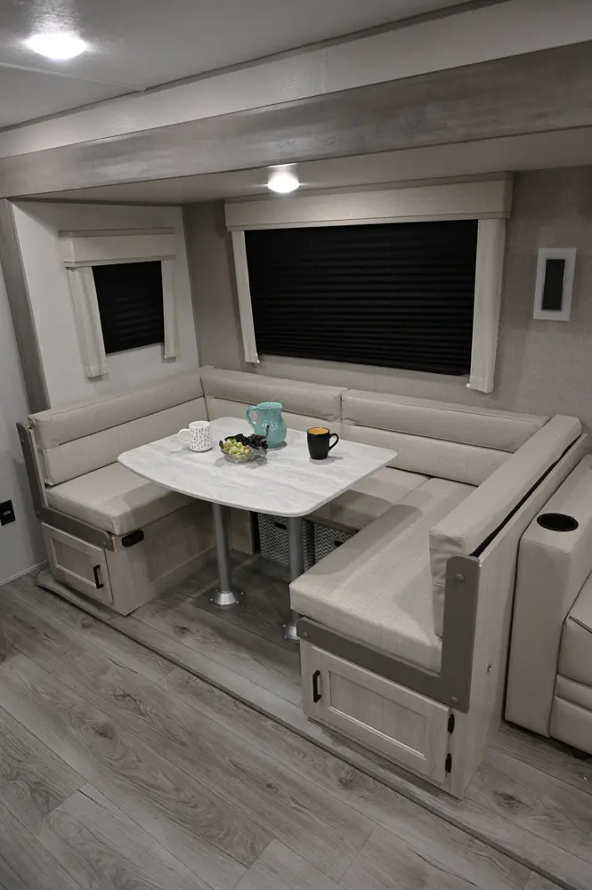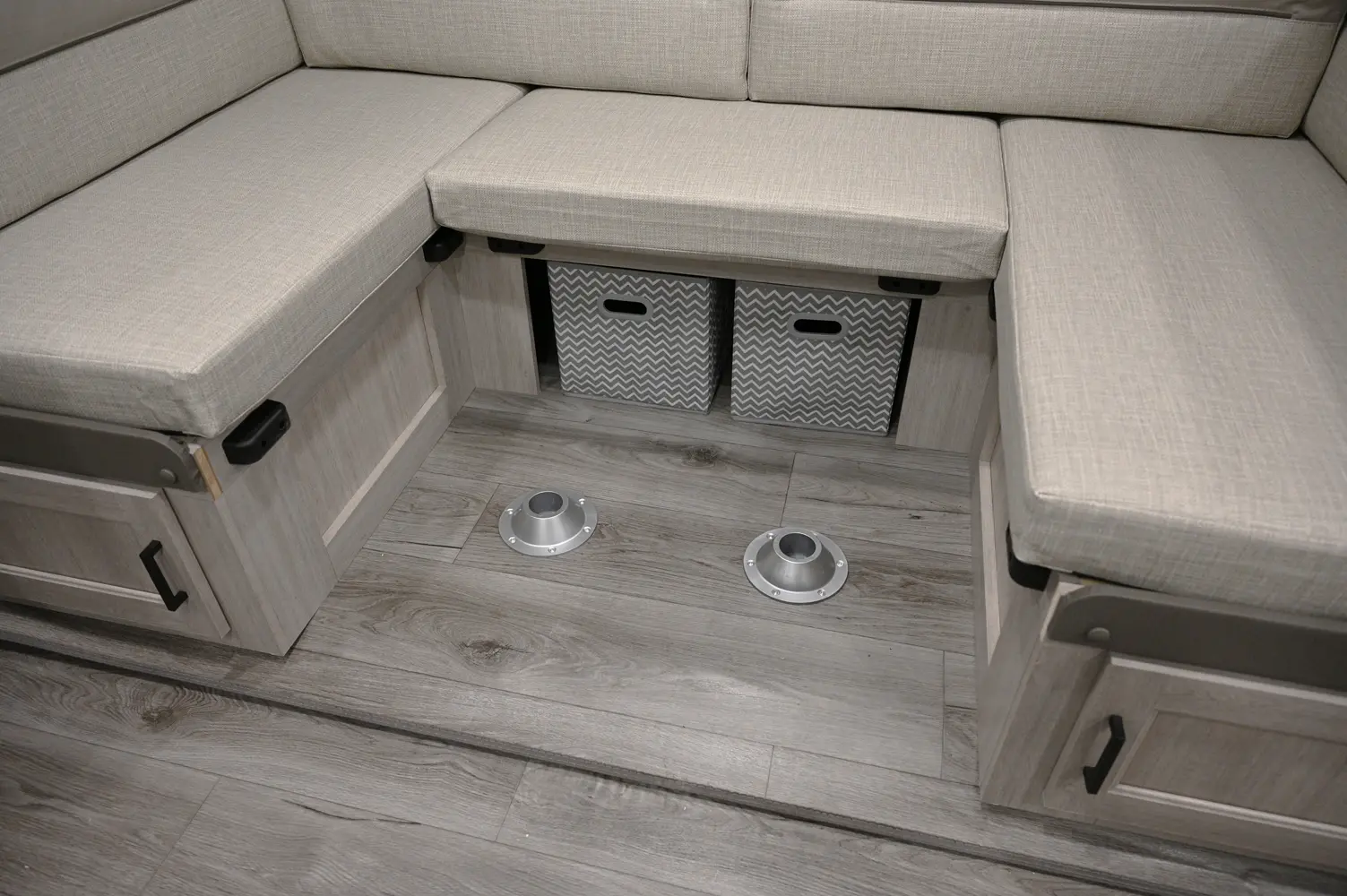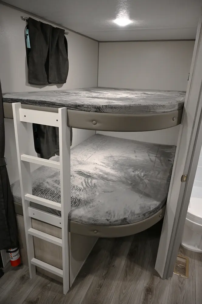 The 263BHS is a classic family bunk house floorplan. Plenty of sleeping is provided by a queen bed in the private master bedroom, two spacious double-over-double bunk beds, as well as our extra-large U-shaped dinette and jiffy bed sofa. Well thought-out features including the easy view angled entertainment center, generous kitchen pantry and standard outside camp kitchen. Additional storage spaces include the under-bunk cubby and floor-to-ceiling closet in the master bedroom.