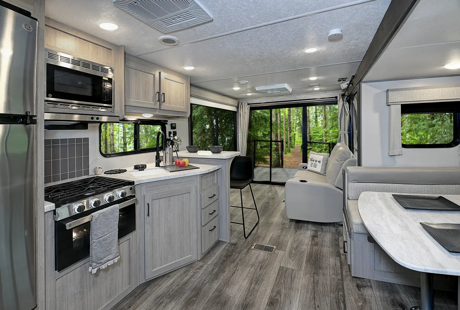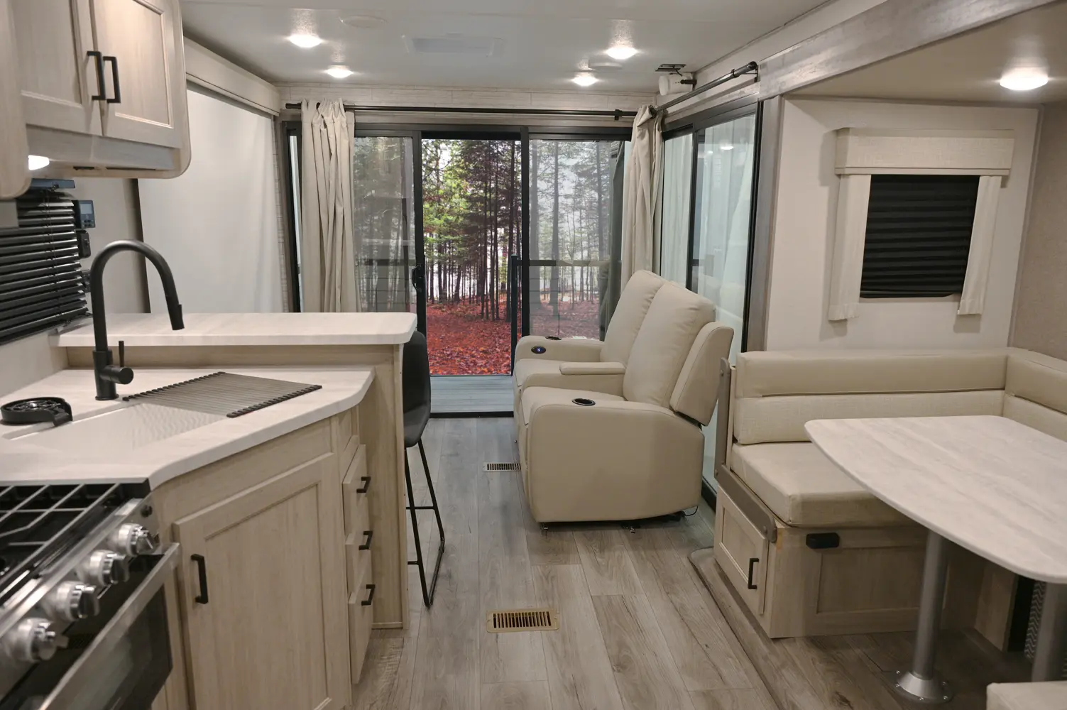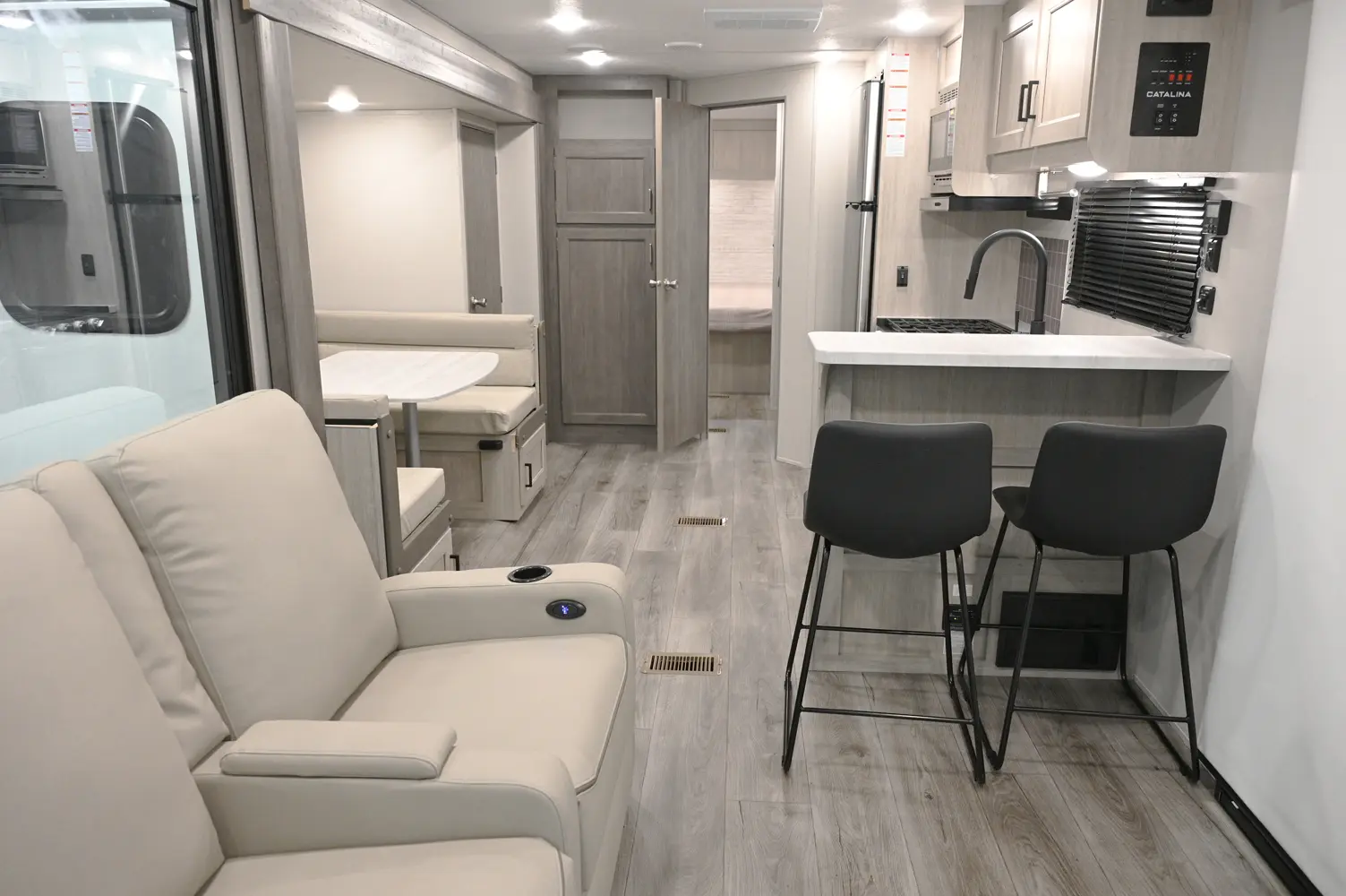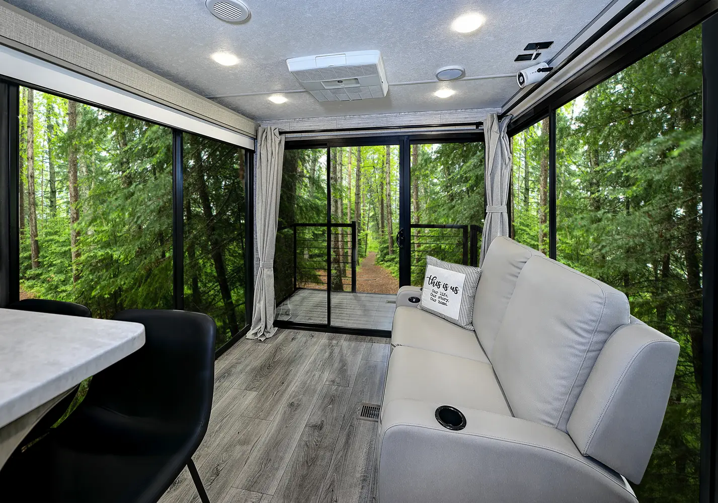 The 283EPIC has one slideout and two entries. Exterior features front pass-through storage, outside shower, 17 foot awning, ladder prep on off-door side, and rear covered porch with entry. Interior layout front to back: foot-facing queen bed with overhead cabinet and wardrobes on each side, and entry door; full pass-through bathroom with medicine cabinet and linen closet; pantry along inner wall; off-door side slideout with pantry and u-shaped dinette; door side refrigerator, microwave, cooktop, overhead cabinet, and kitchen sink with bar top and seats; off-door side sofa (theater seating optional), picture window, and projector TV; door side projector screen and picture window; rear patio door and covered porch with entry steps.