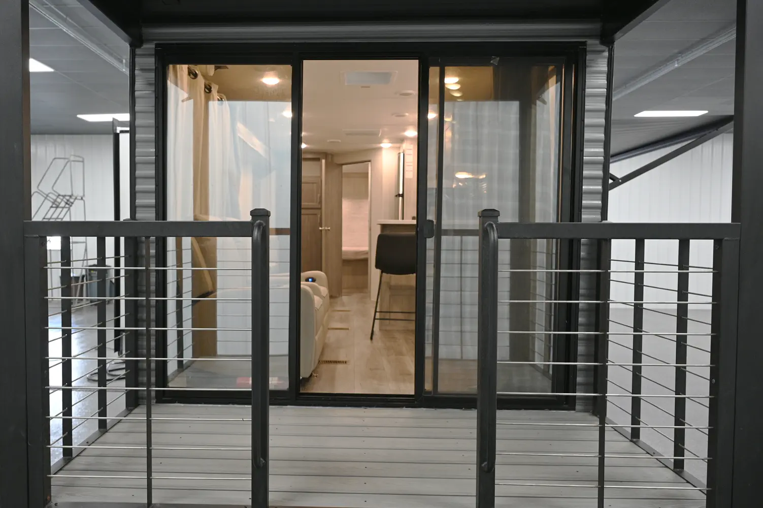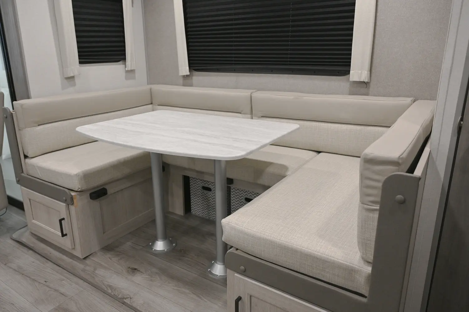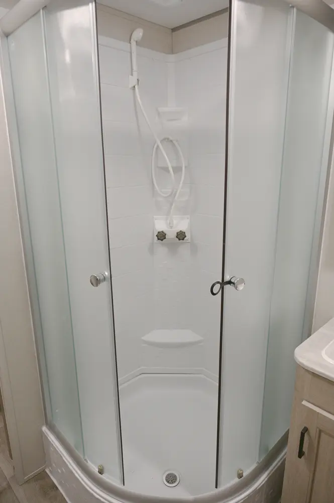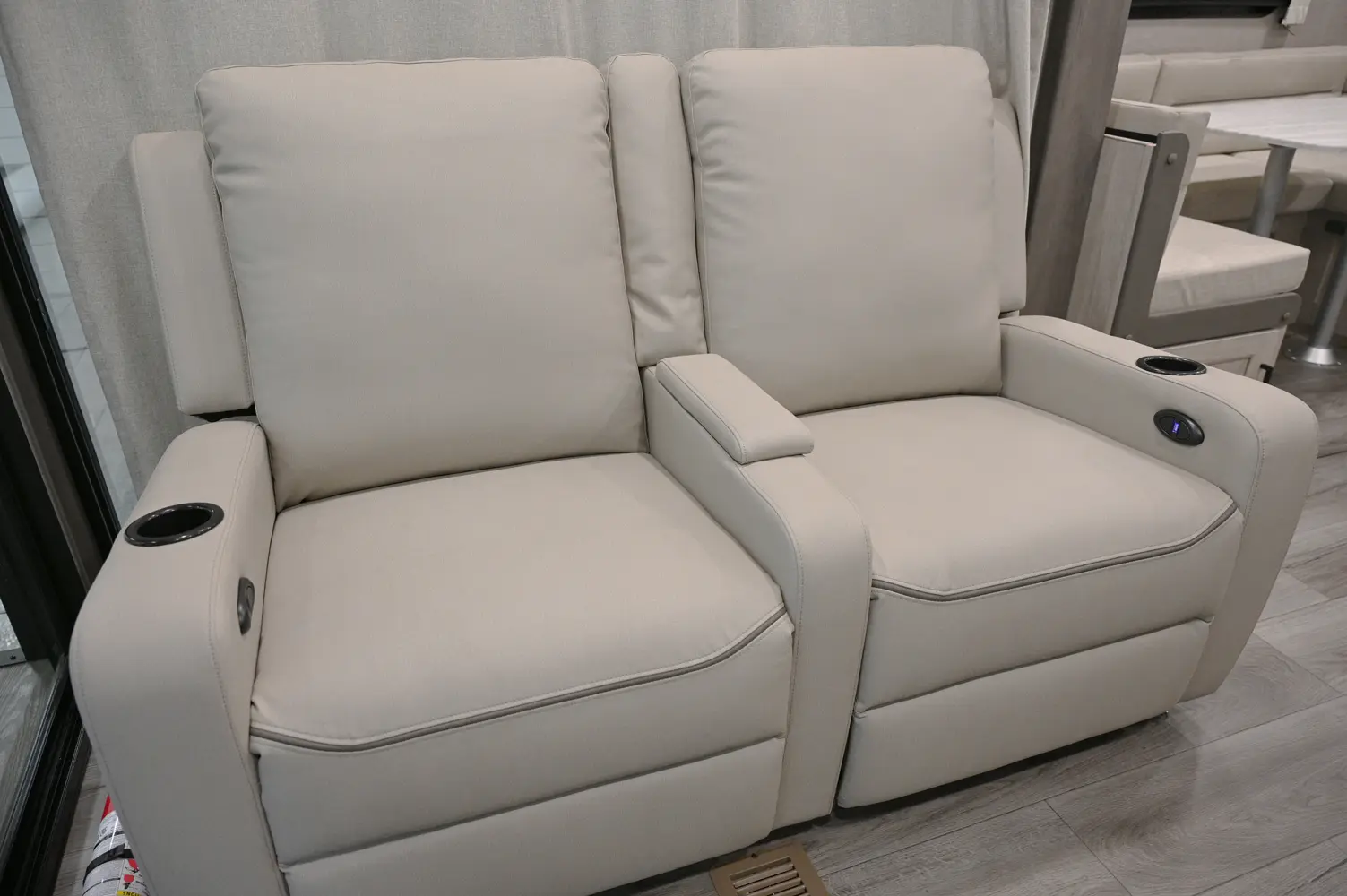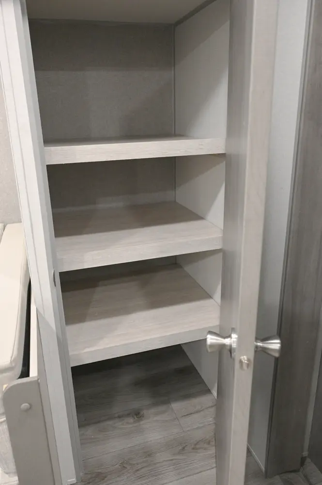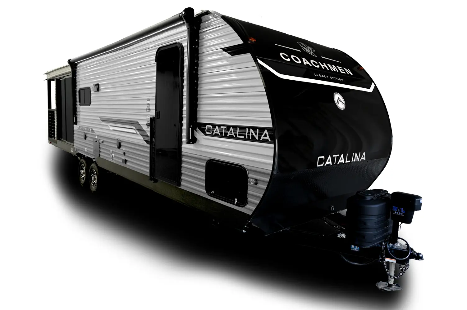 The 283EPIC has one slideout and two entries. Exterior features front pass-through storage, outside shower, 17 foot awning, ladder prep on off-door side, and rear covered porch with entry. Interior layout front to back: foot-facing queen bed with overhead cabinet and wardrobes on each side, and entry door; full pass-through bathroom with medicine cabinet and linen closet; pantry along inner wall; off-door side slideout with pantry and u-shaped dinette; door side refrigerator, microwave, cooktop, overhead cabinet, and kitchen sink with bar top and seats; off-door side sofa (theater seating optional), picture window, and projector TV; door side projector screen and picture window; rear patio door and covered porch with entry steps.