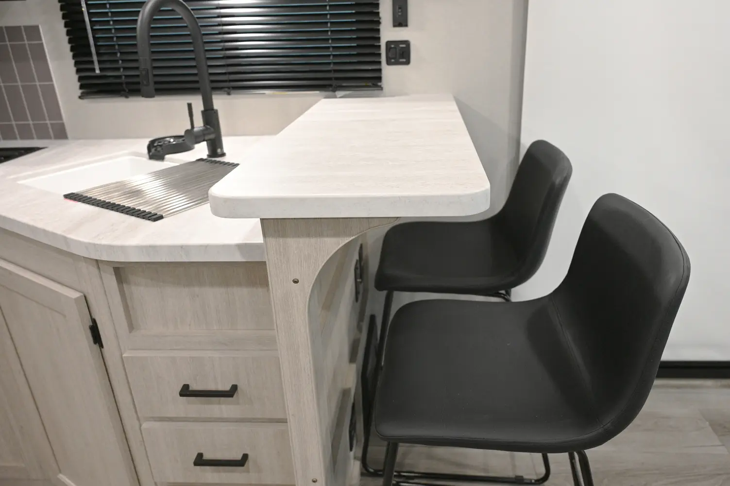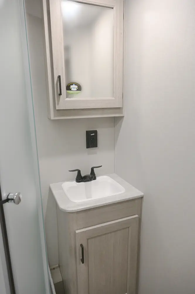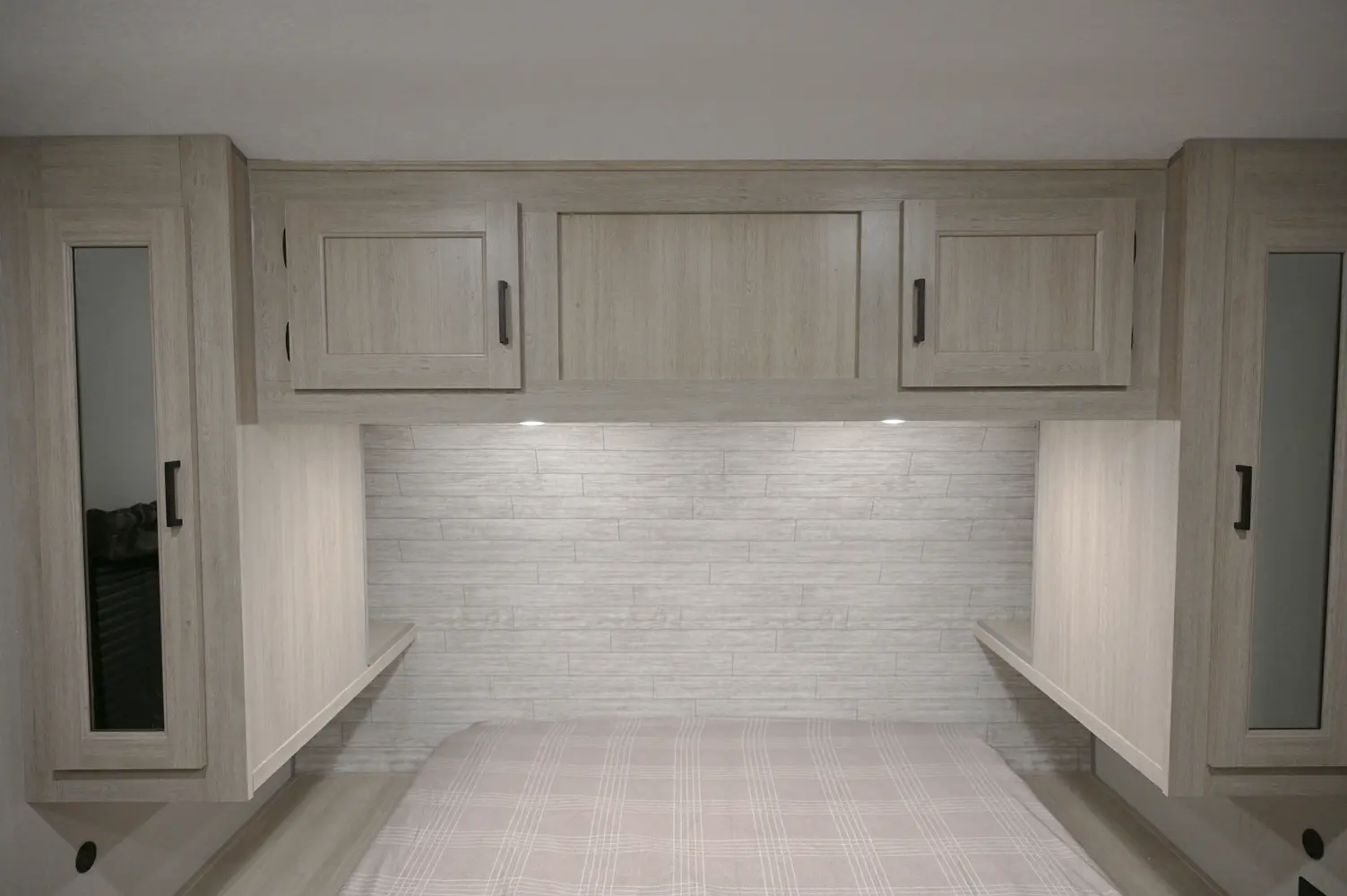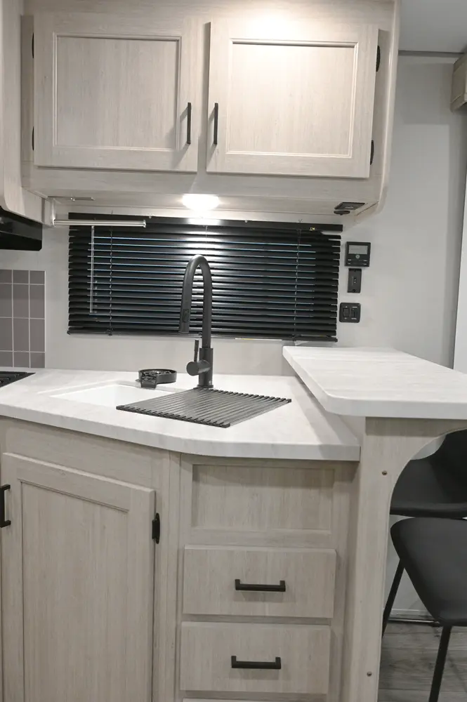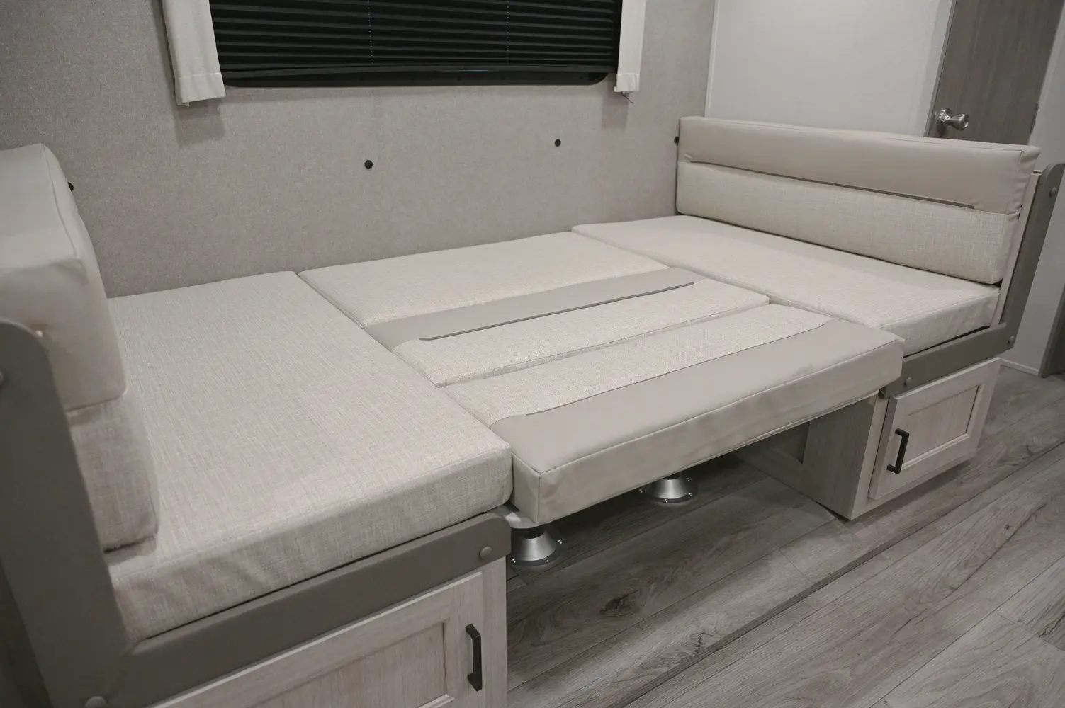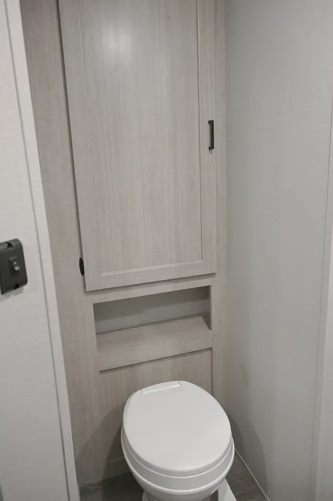 The 283EPIC has one slideout and two entries. Exterior features front pass-through storage, outside shower, 17 foot awning, ladder prep on off-door side, and rear covered porch with entry. Interior layout front to back: foot-facing queen bed with overhead cabinet and wardrobes on each side, and entry door; full pass-through bathroom with medicine cabinet and linen closet; pantry along inner wall; off-door side slideout with pantry and u-shaped dinette; door side refrigerator, microwave, cooktop, overhead cabinet, and kitchen sink with bar top and seats; off-door side sofa (theater seating optional), picture window, and projector TV; door side projector screen and picture window; rear patio door and covered porch with entry steps.