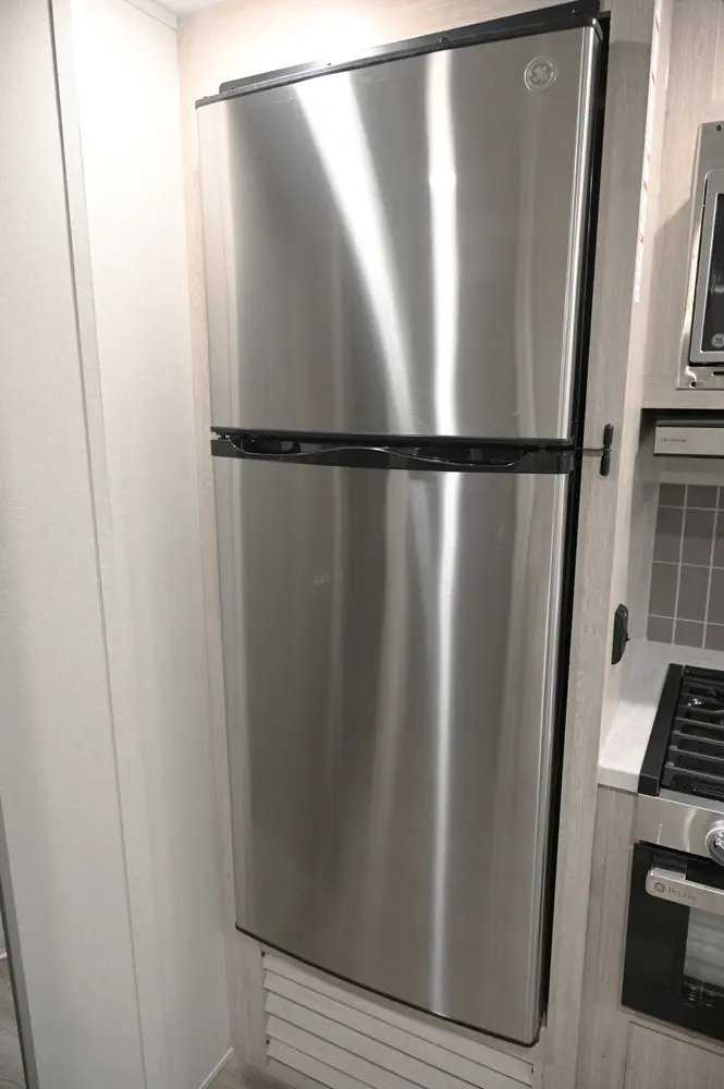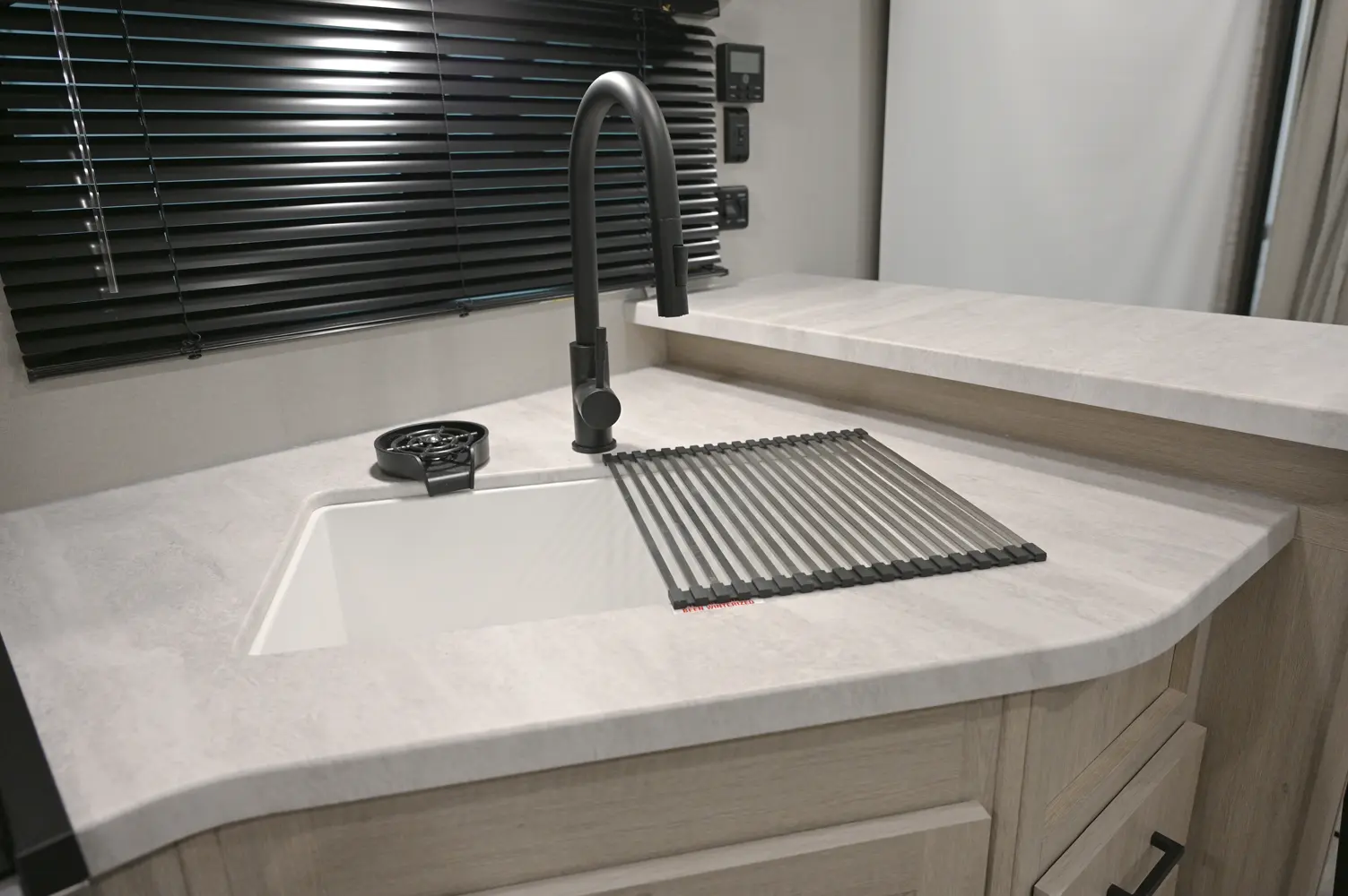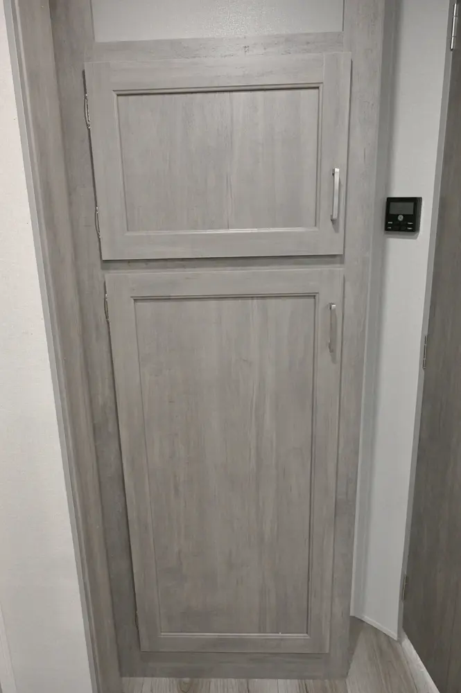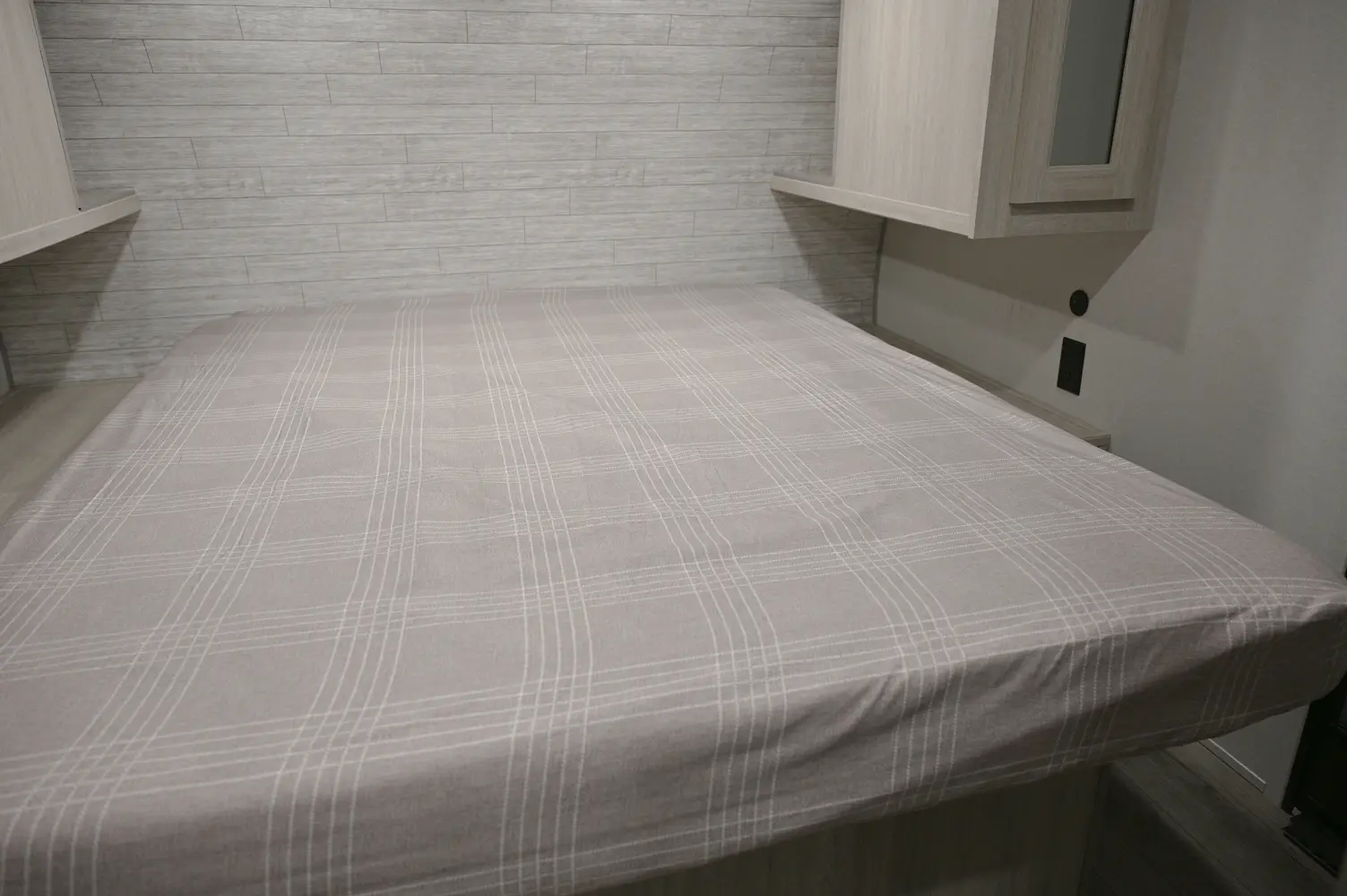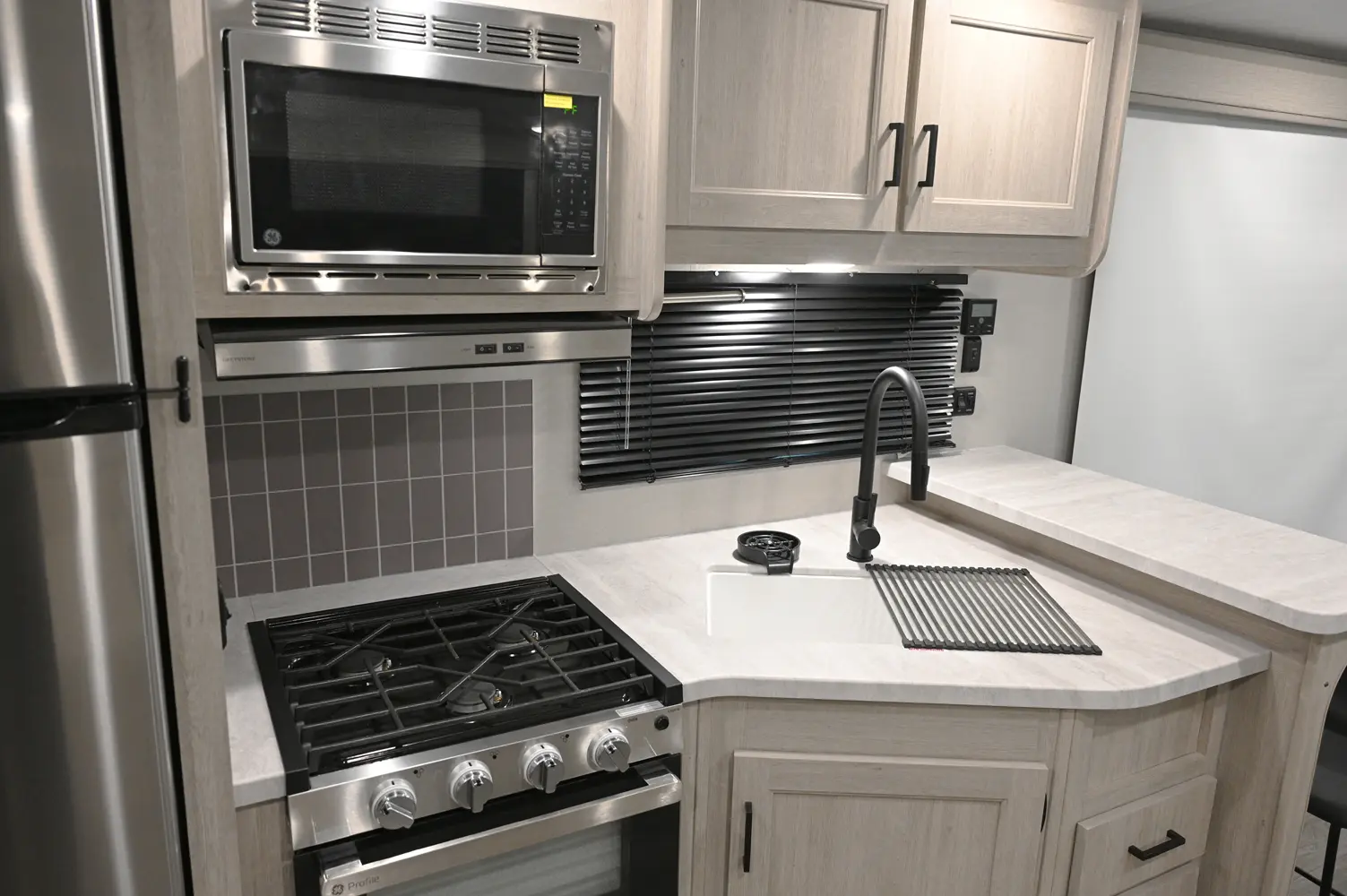 The 283EPIC has one slideout and two entries. Exterior features front pass-through storage, outside shower, 17 foot awning, ladder prep on off-door side, and rear covered porch with entry. Interior layout front to back: foot-facing queen bed with overhead cabinet and wardrobes on each side, and entry door; full pass-through bathroom with medicine cabinet and linen closet; pantry along inner wall; off-door side slideout with pantry and u-shaped dinette; door side refrigerator, microwave, cooktop, overhead cabinet, and kitchen sink with bar top and seats; off-door side sofa (theater seating optional), picture window, and projector TV; door side projector screen and picture window; rear patio door and covered porch with entry steps.