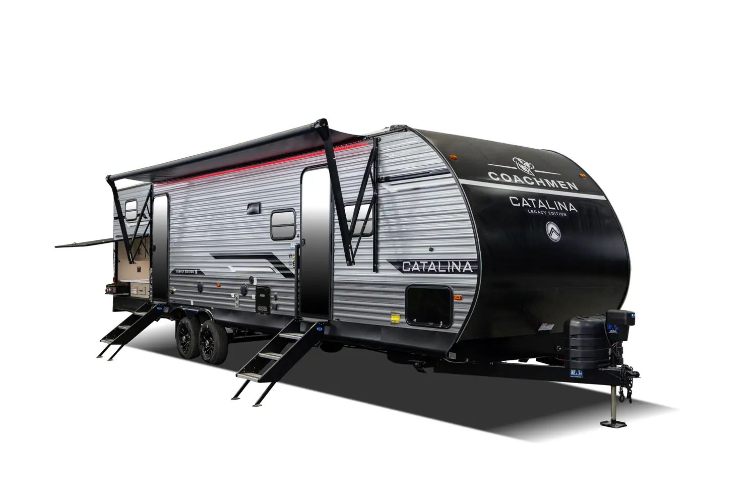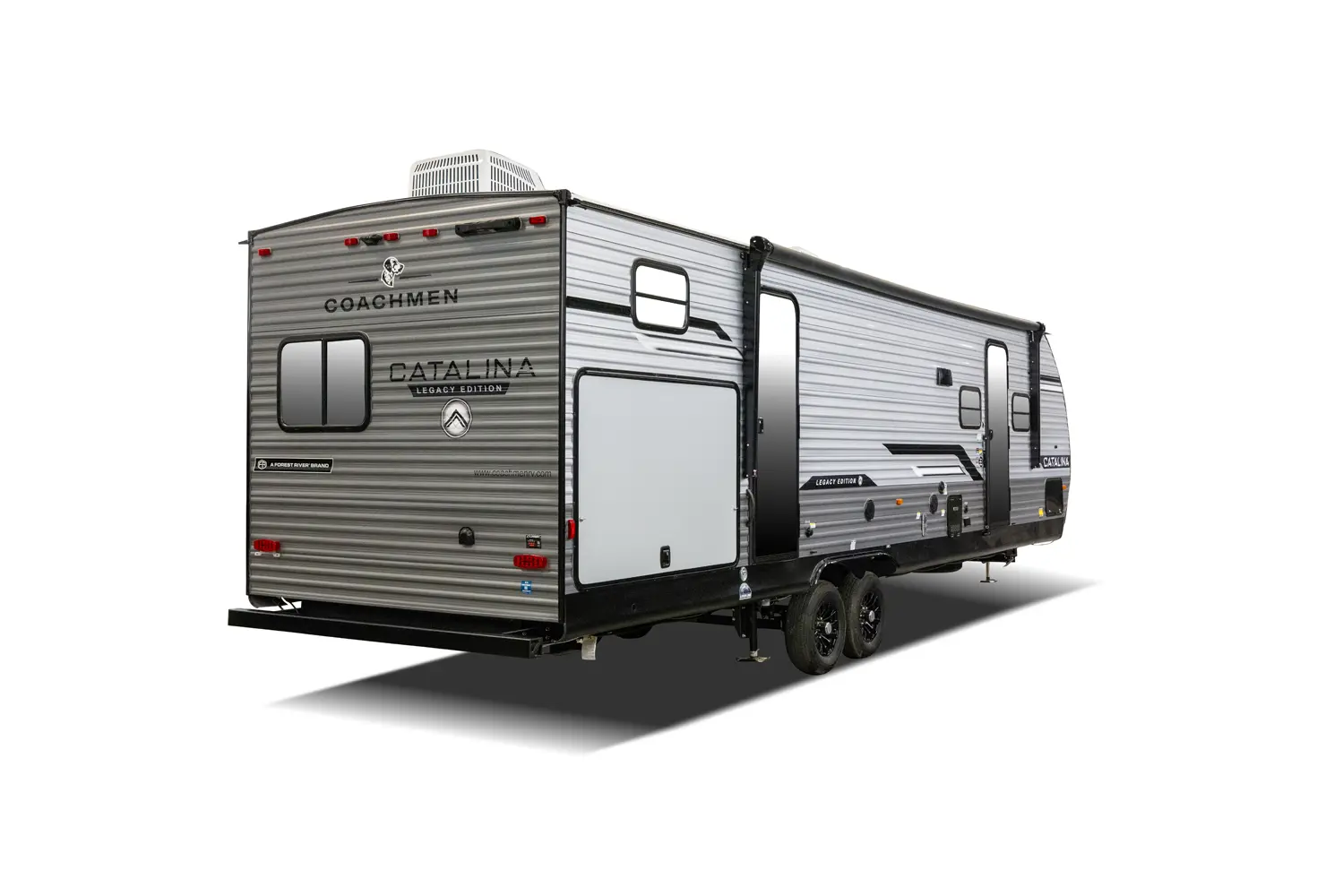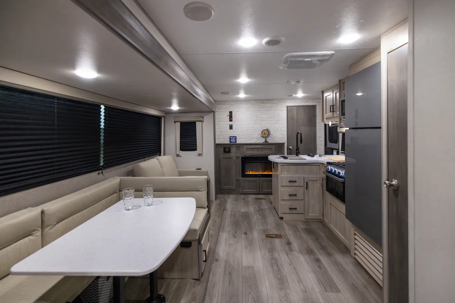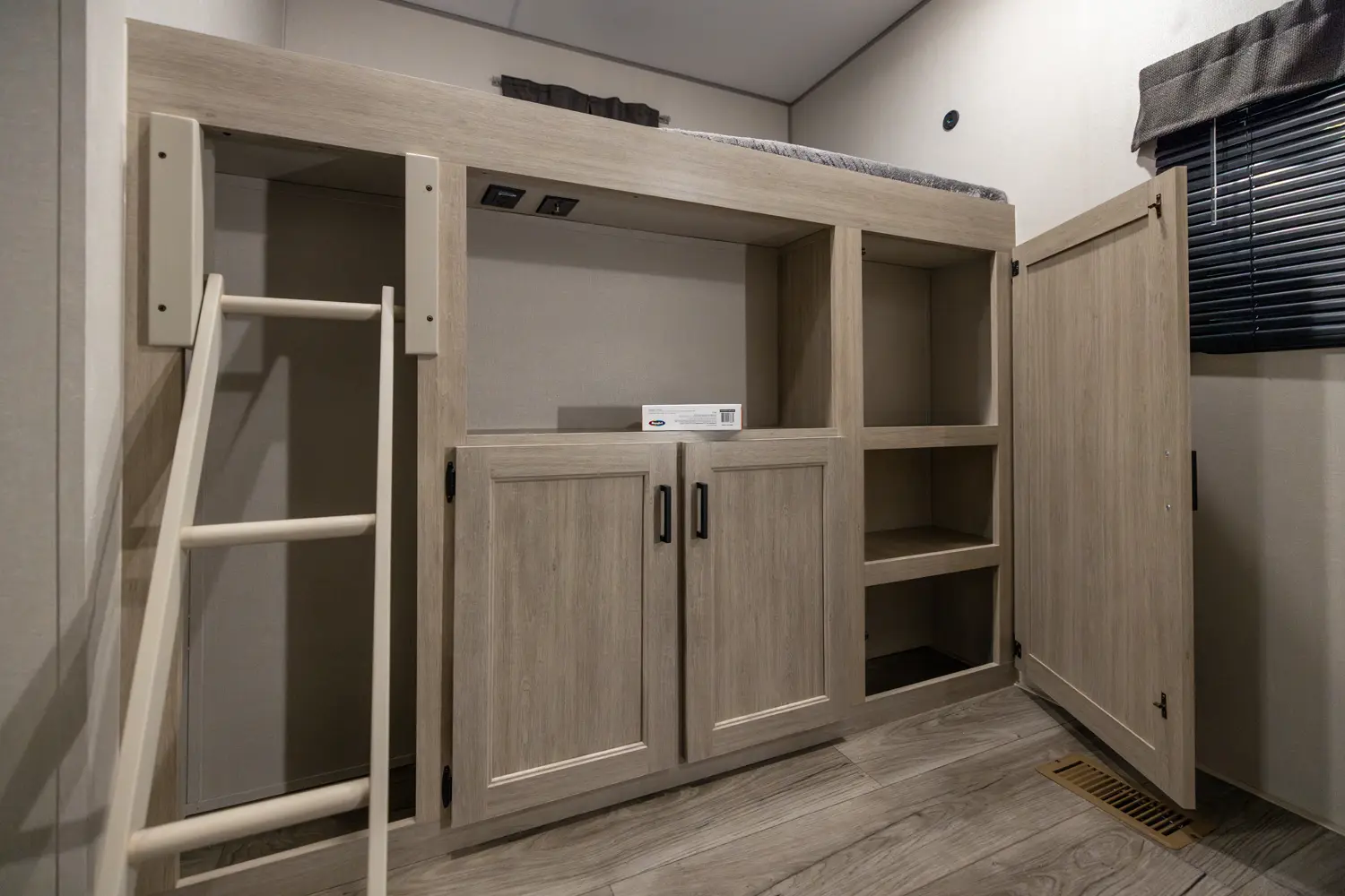 The 323BHDSCK is the ideal bunkhouse floorplan for families of all sizes! The bunk room is furnished with a double size loft bed, a single bunk that can be stowed for more room, the versatile COA cube lounge futon, its own ent. center, and abundant storage. The living room provides a large U-shape dinette and substantial pantry to meet the needs of any family. On the outside our standard large camp kitchen includes a griddle, dorm style refrigerator, sink, plus storage cabinets and drawers.