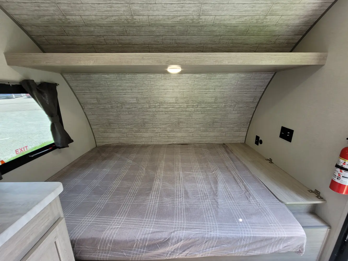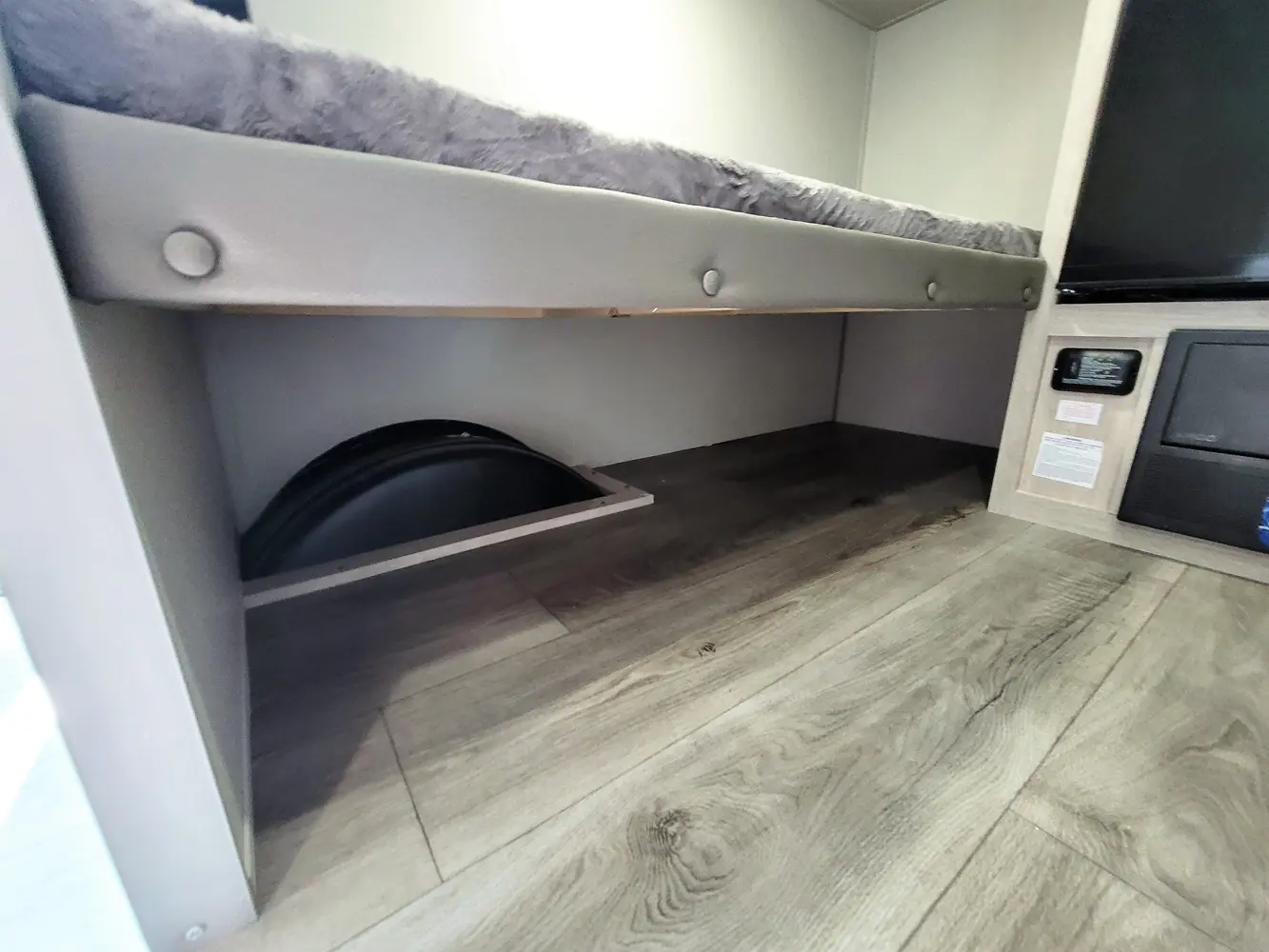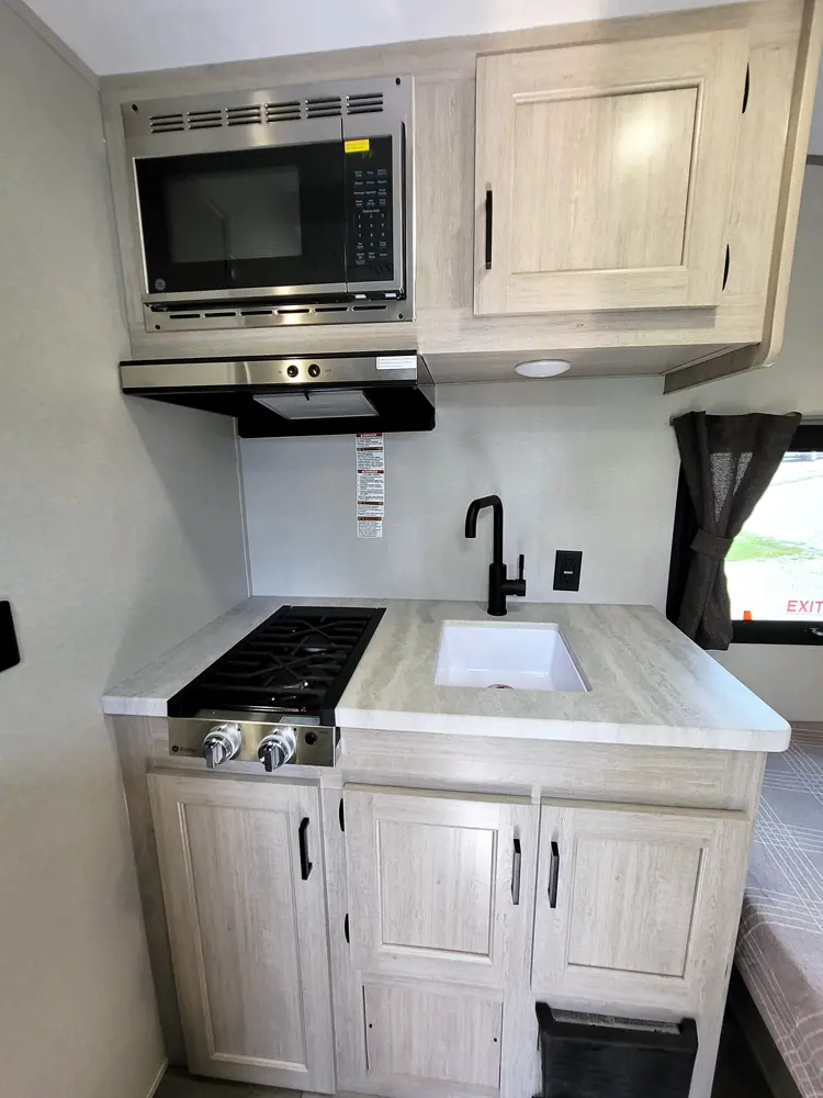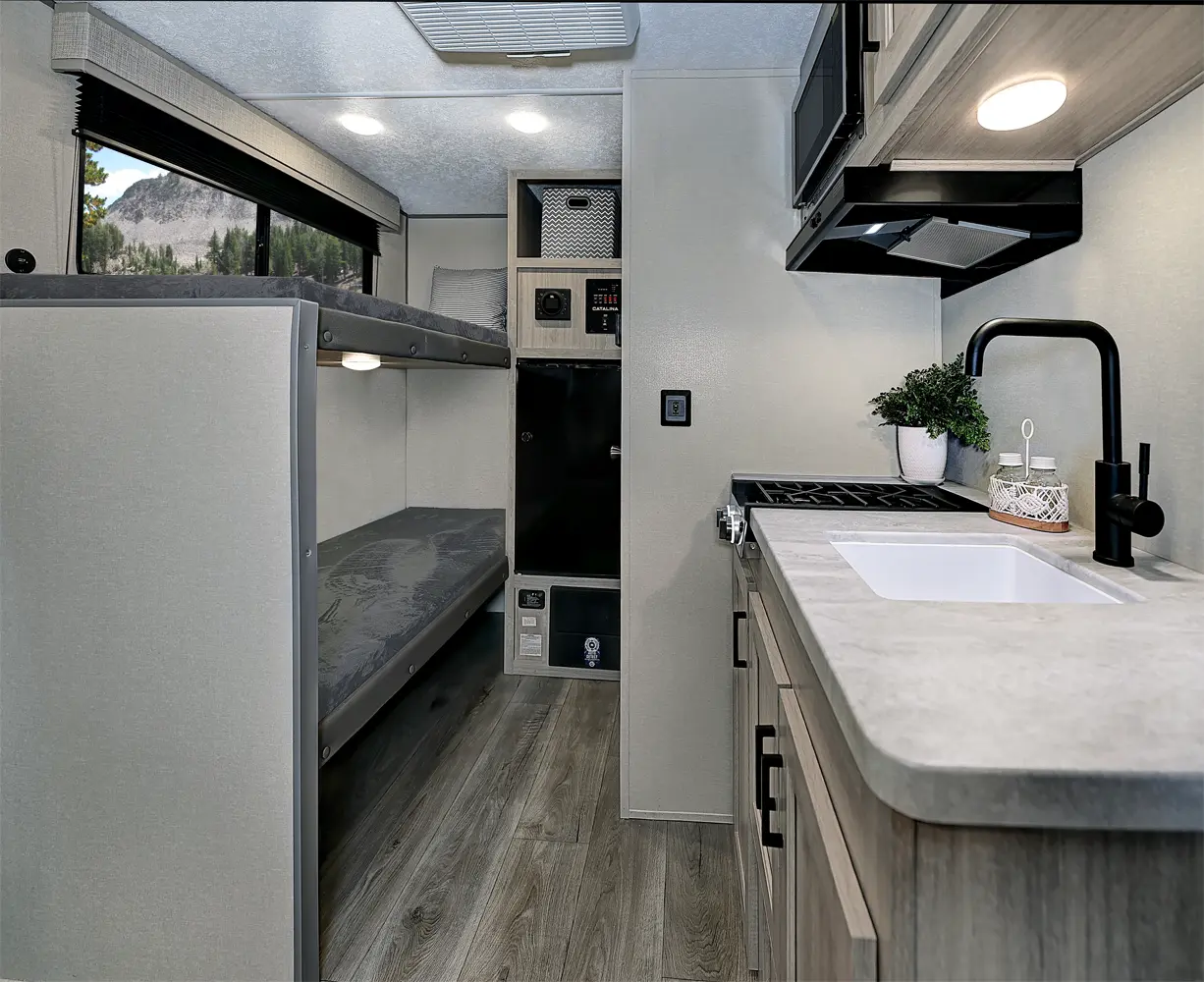 The 134BHX has zero slideouts and one entry. Exterior features exterior storage, rear ladder prep, and 8 foot awning. Interior layout front to back: side-facing queen bed with shelf above and door side storage; off-door side kitchen counter with sink and cooktop, overhead cabinet, and microwave; door side entry; rear off-door side bathroom with shower and toilet only; rear door side bunk beds; rear refrigerator.