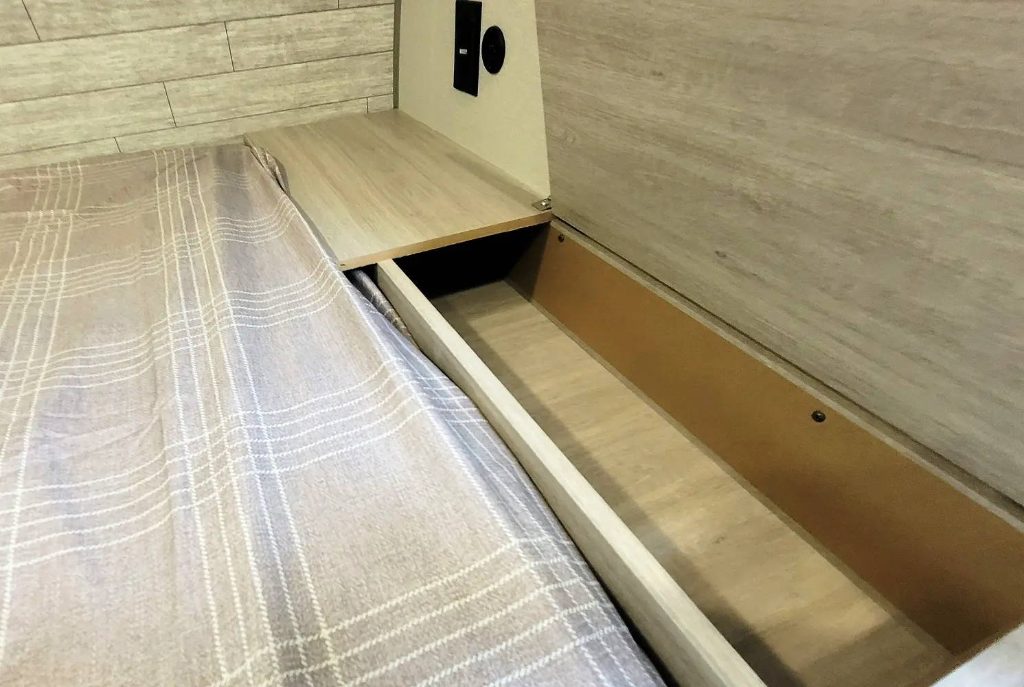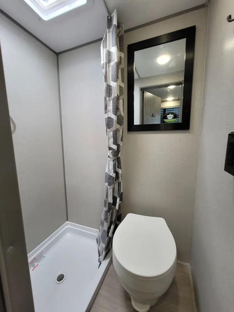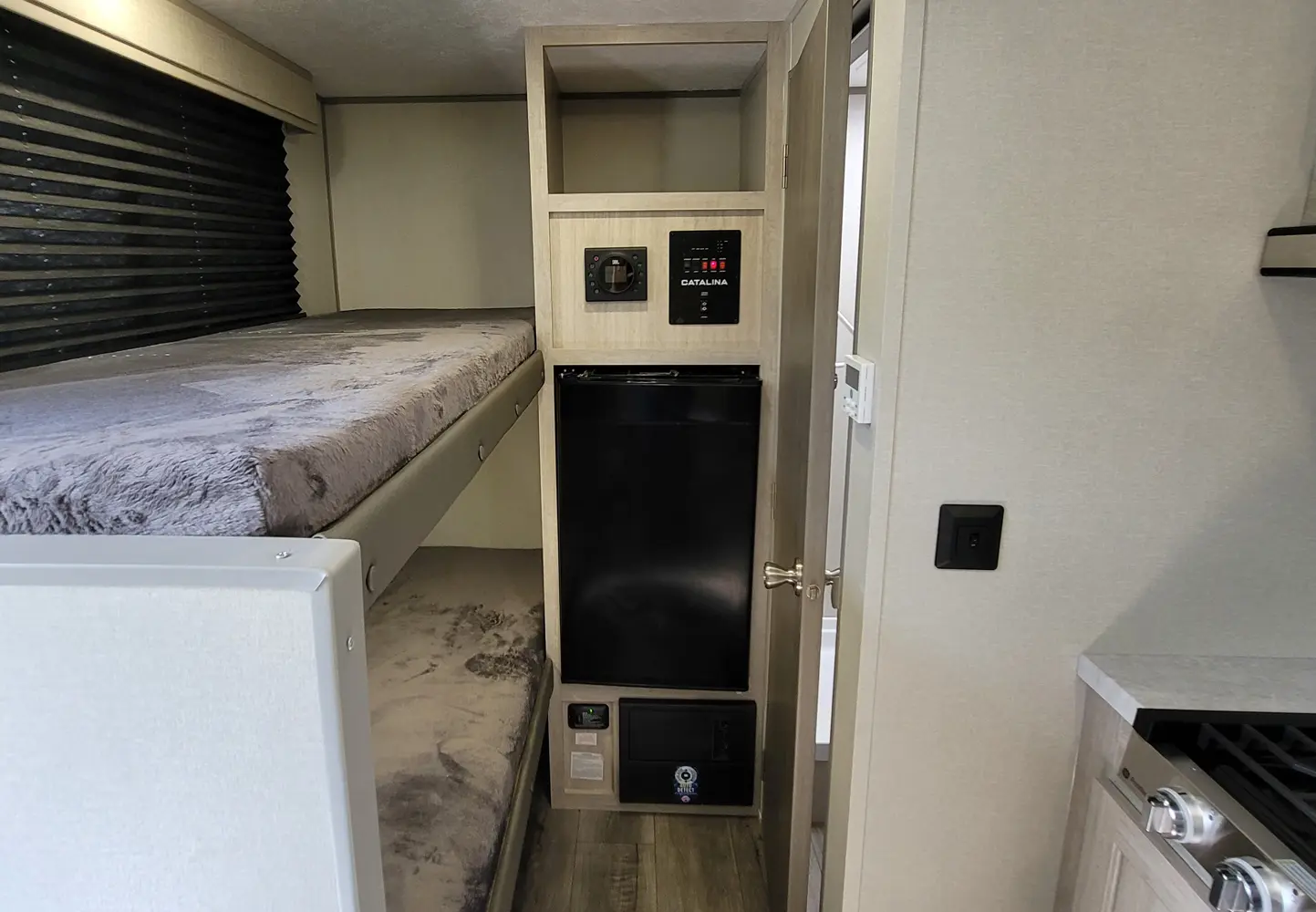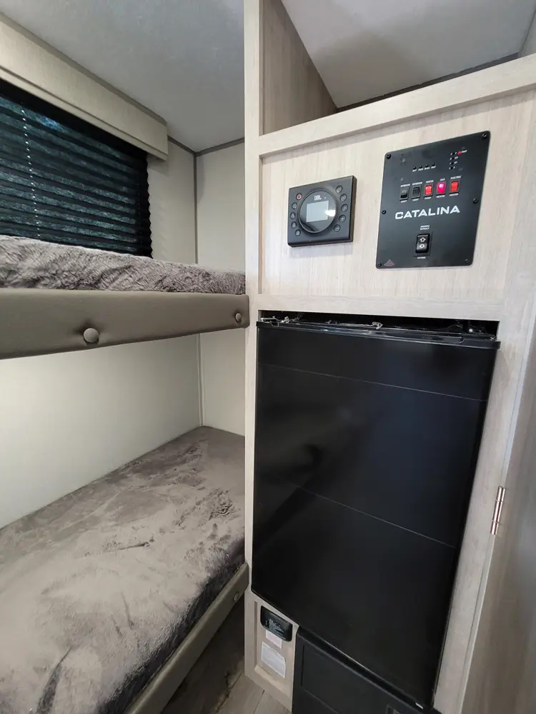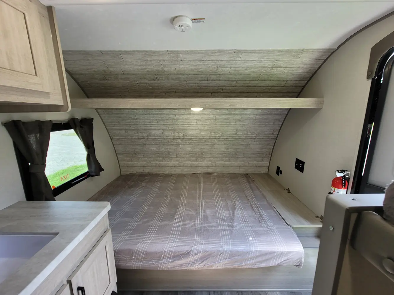The 134BHX has zero slideouts and one entry. Exterior features exterior storage, rear ladder prep, and 8 foot awning. Interior layout front to back: side-facing queen bed with shelf above and door side storage; off-door side kitchen counter with sink and cooktop, overhead cabinet, and microwave; door side entry; rear off-door side bathroom with shower and toilet only; rear door side bunk beds; rear refrigerator.