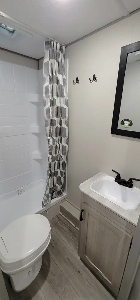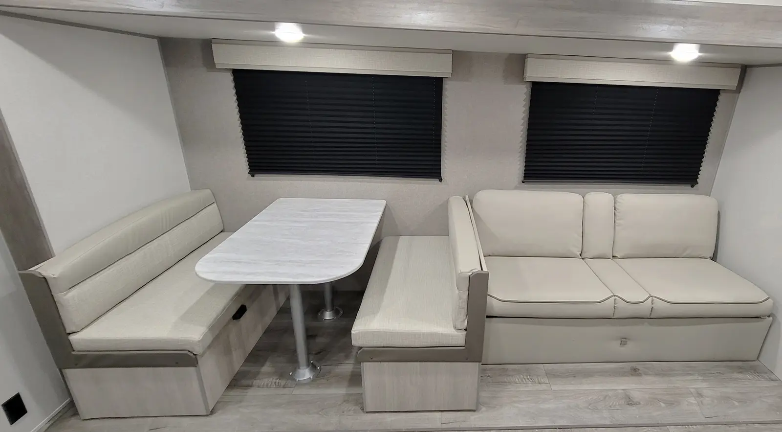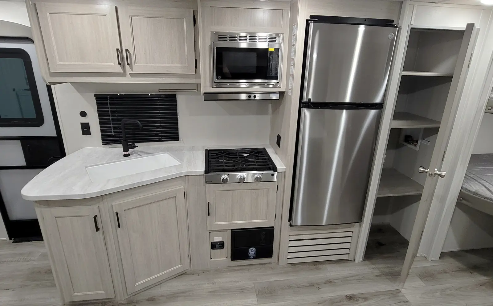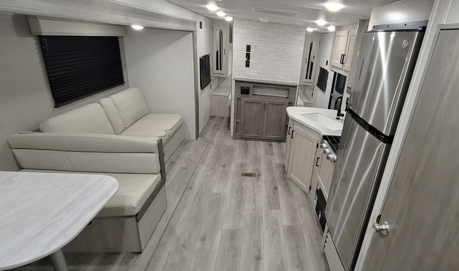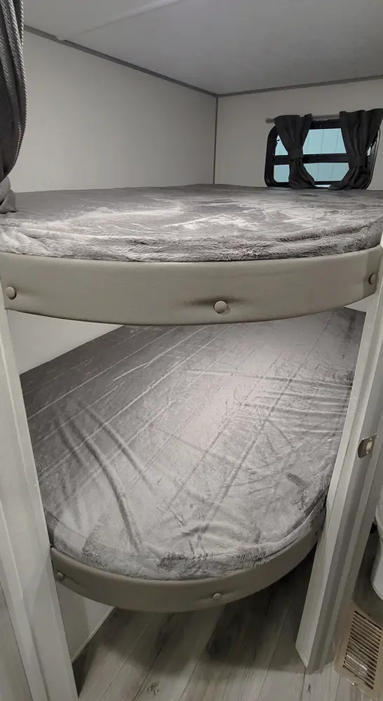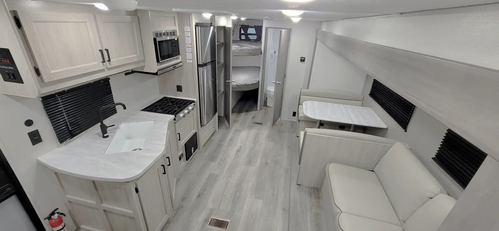 The Catalina Summit Series 8 261BHS floorplan has one entry and one slide out. Exterior features include: metal exterior, 15' awning and outside kitchen. Interiors features include: bunk beds and front bedroom.