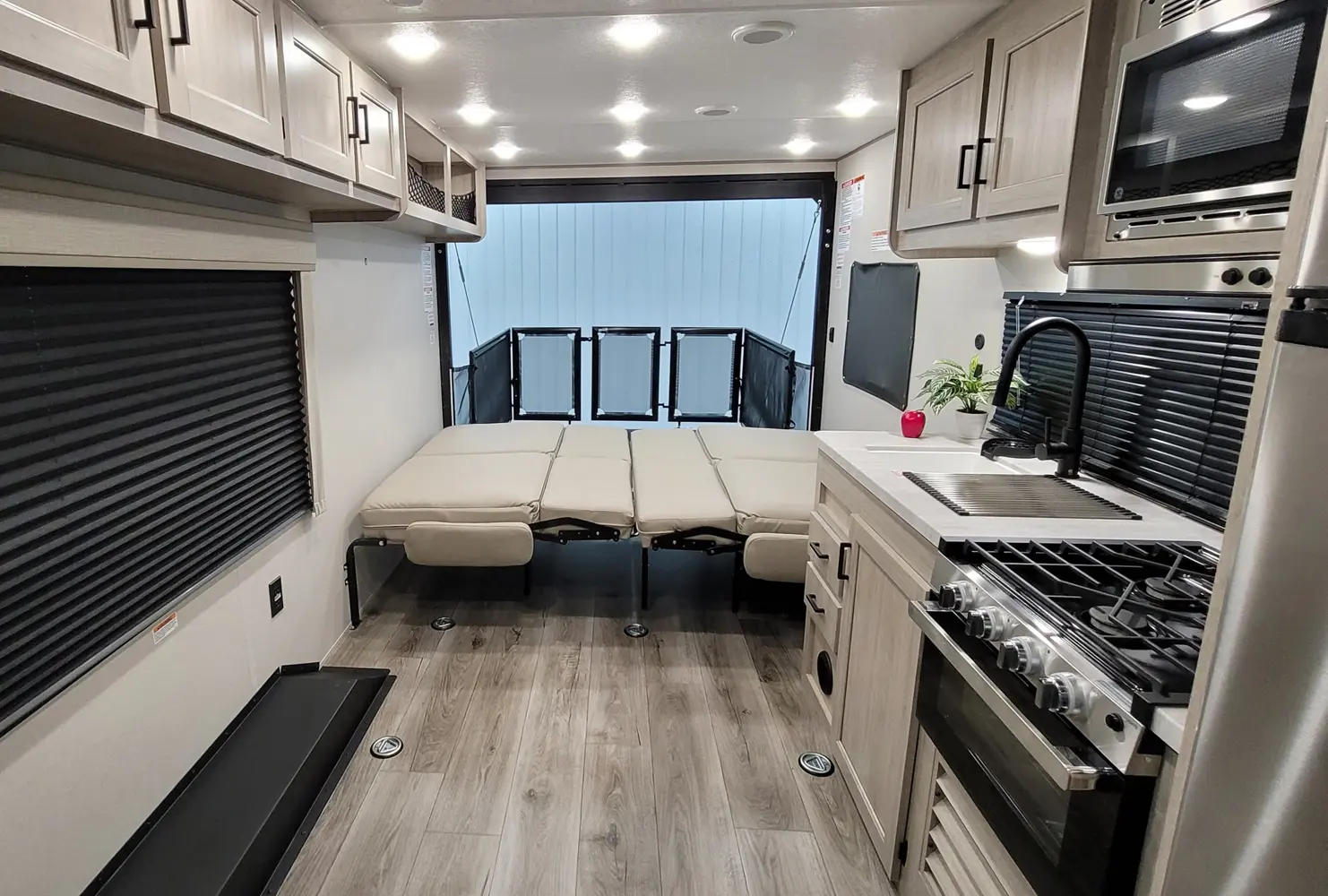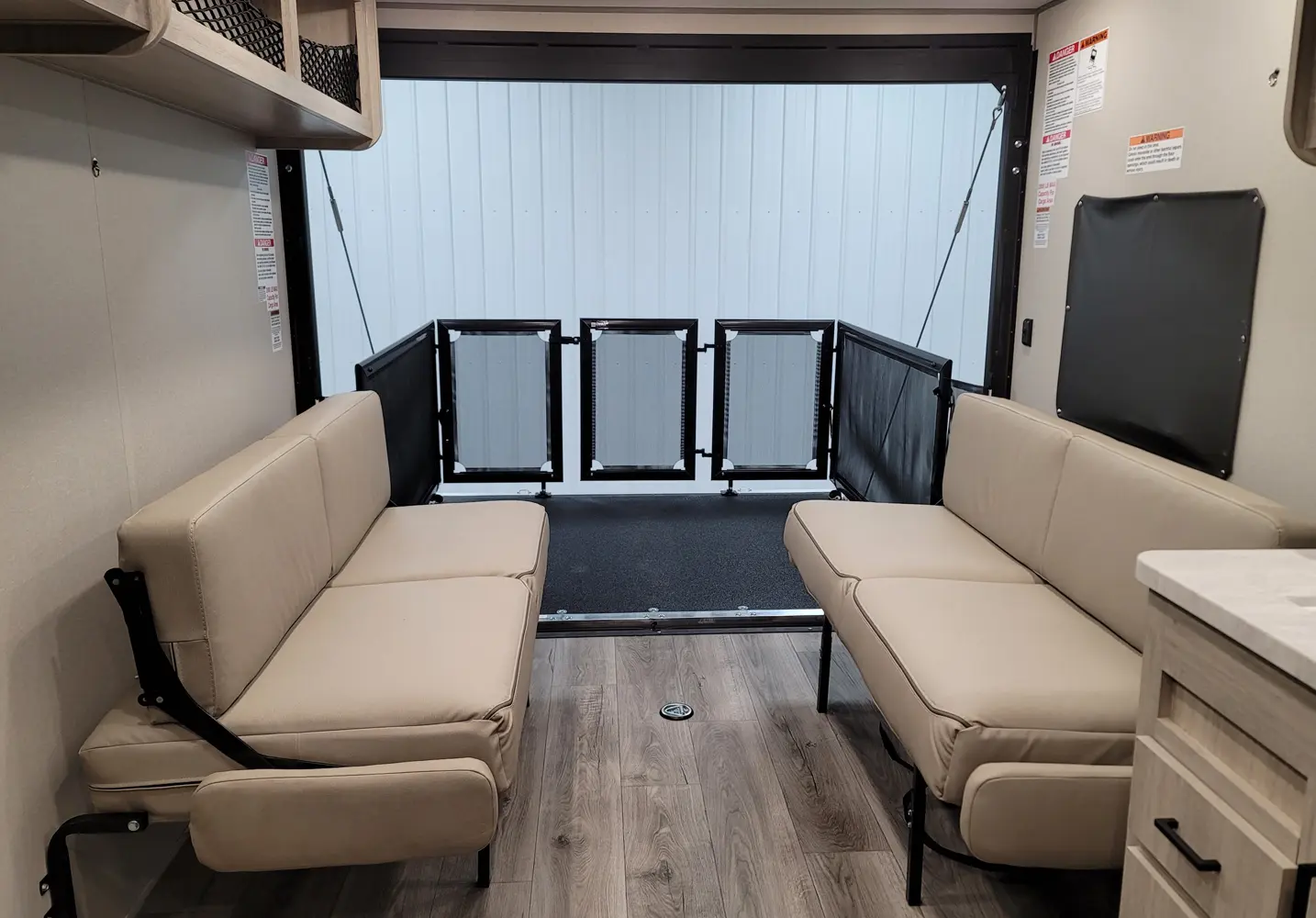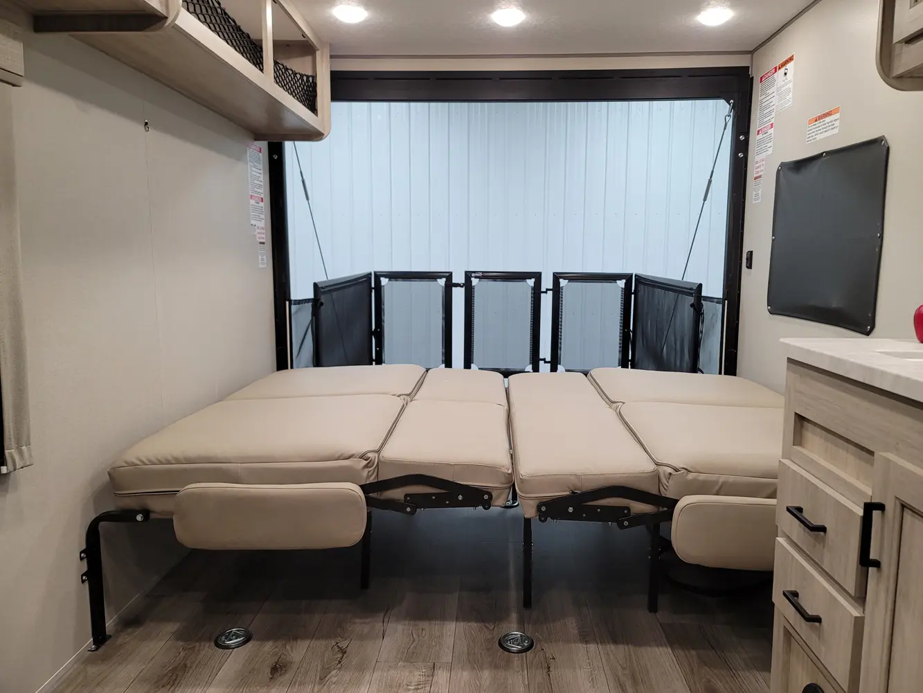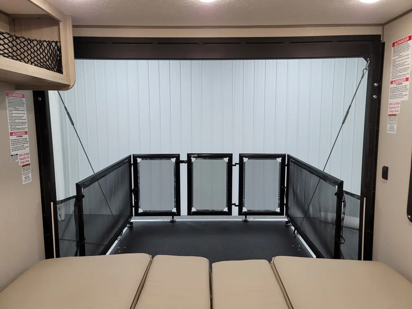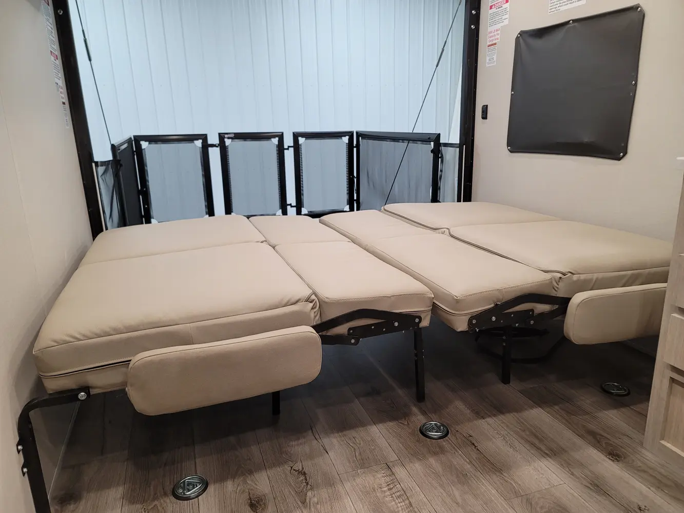 The 26TH has no slide outs and one entry door. Exterior features include a 15 foot awning, heavy-duty table, outside shower, front storage, and rear ramp door. Interior layout front to back: front queen bed with overhead cabinet and wardrobe on each side; pass through full bathroom with medicine cabinet and linen closet; entertainment center along inner wall and entry door; off-door side refrigerator, microwave, overhead cabinet, cooktop and sink; rear opposing fold down sofas with overhead cabinet on door side from rear to door. Optional party deck available on rear ramp door. Optional recliners available. Garage Dimensions: 6 foot 4 inches from rear to kitchen counter; 11 foot 6 inches from rear to refrigerator; 5 foot 11 inches between fold down sofas; 5 foot from kitchen counter to door side wall; 5 foot 2 inches from door side sofa to entry door; 11 inches folded up sofas.