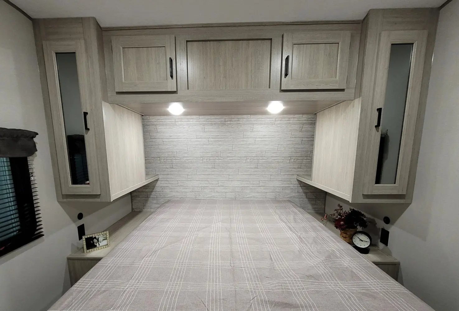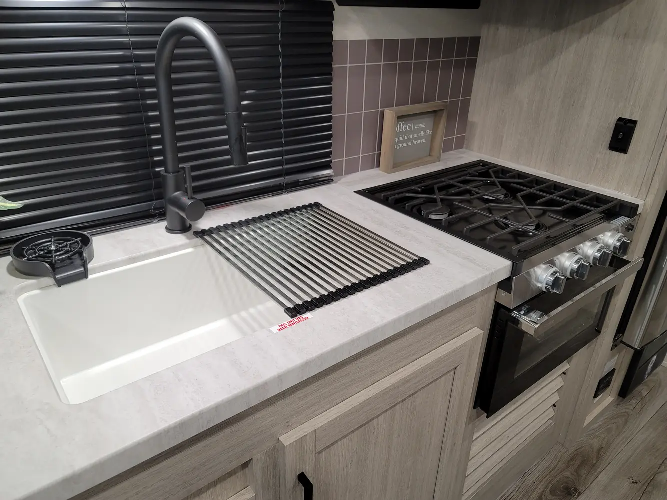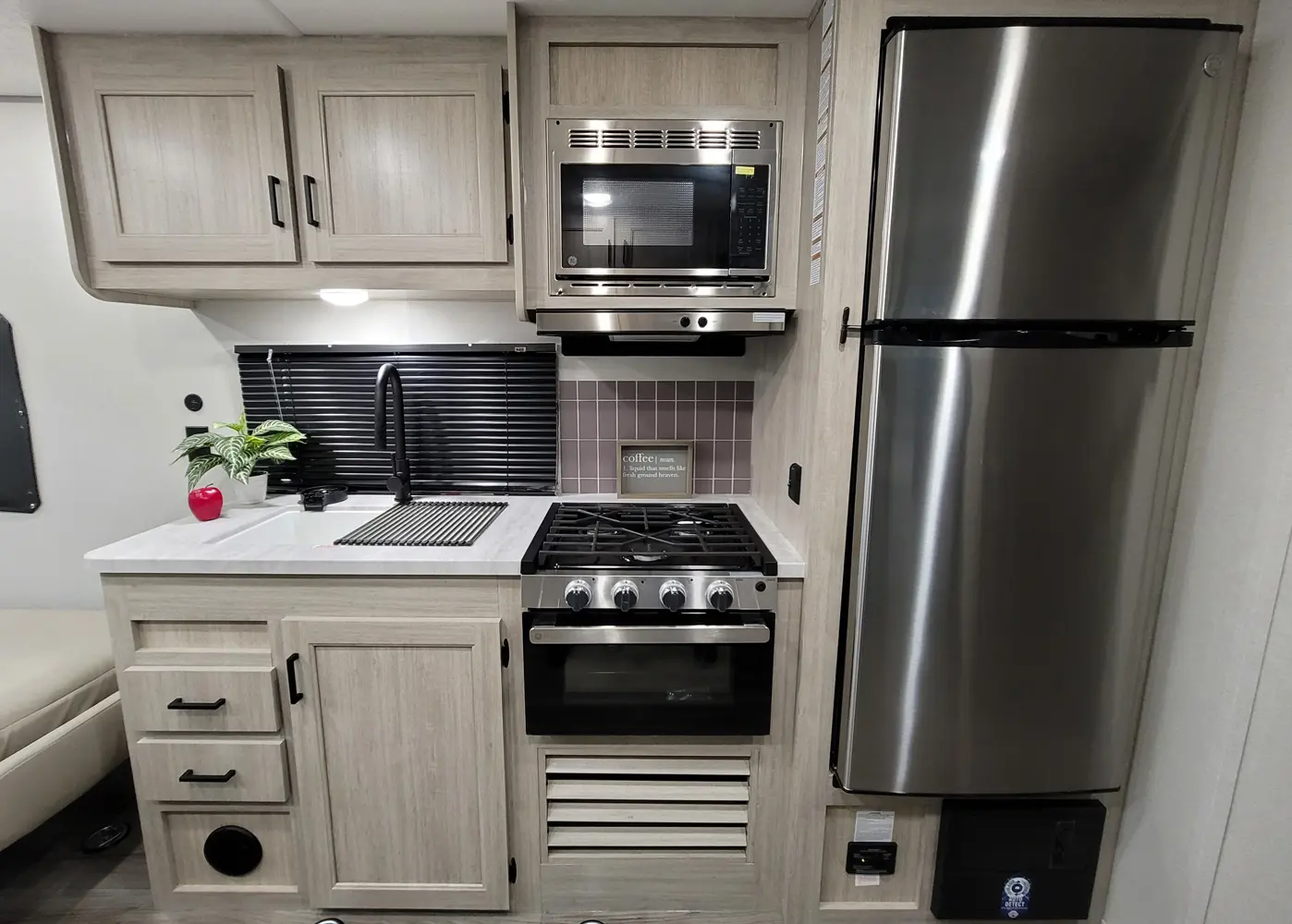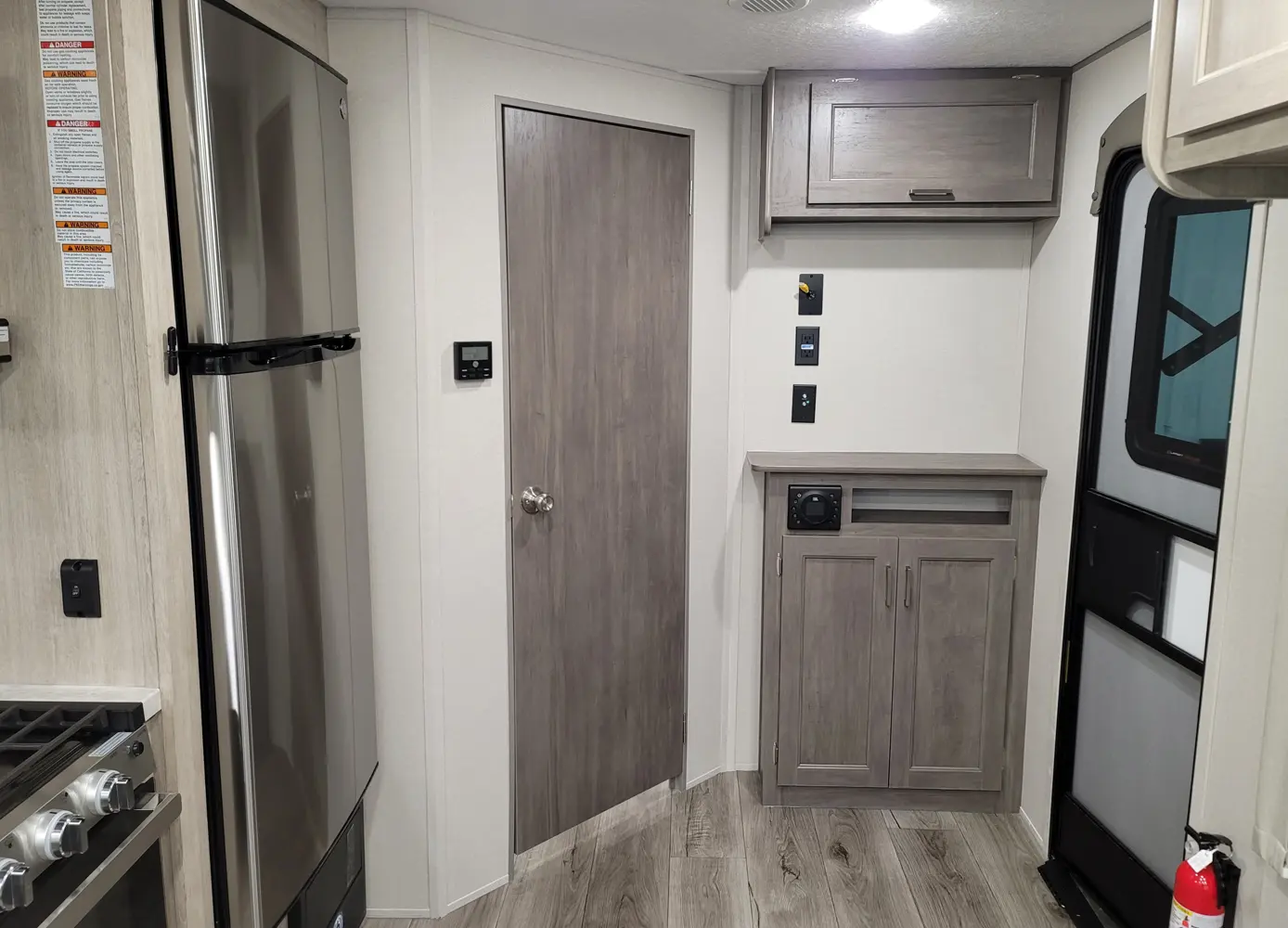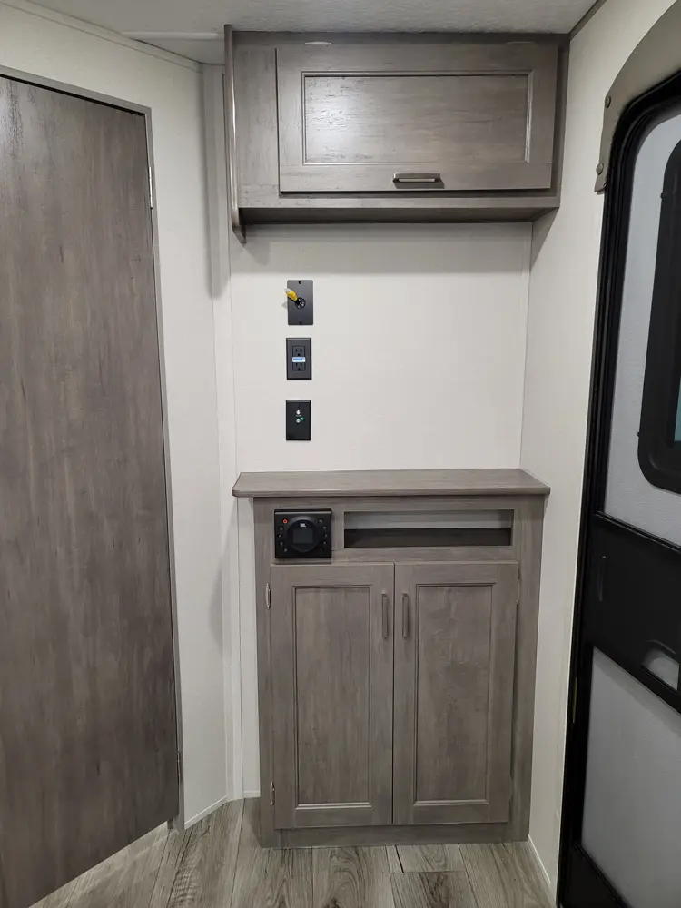 The 26TH has no slide outs and one entry door. Exterior features include a 15 foot awning, heavy-duty table, outside shower, front storage, and rear ramp door. Interior layout front to back: front queen bed with overhead cabinet and wardrobe on each side; pass through full bathroom with medicine cabinet and linen closet; entertainment center along inner wall and entry door; off-door side refrigerator, microwave, overhead cabinet, cooktop and sink; rear opposing fold down sofas with overhead cabinet on door side from rear to door. Optional party deck available on rear ramp door. Optional recliners available. Garage Dimensions: 6 foot 4 inches from rear to kitchen counter; 11 foot 6 inches from rear to refrigerator; 5 foot 11 inches between fold down sofas; 5 foot from kitchen counter to door side wall; 5 foot 2 inches from door side sofa to entry door; 11 inches folded up sofas.