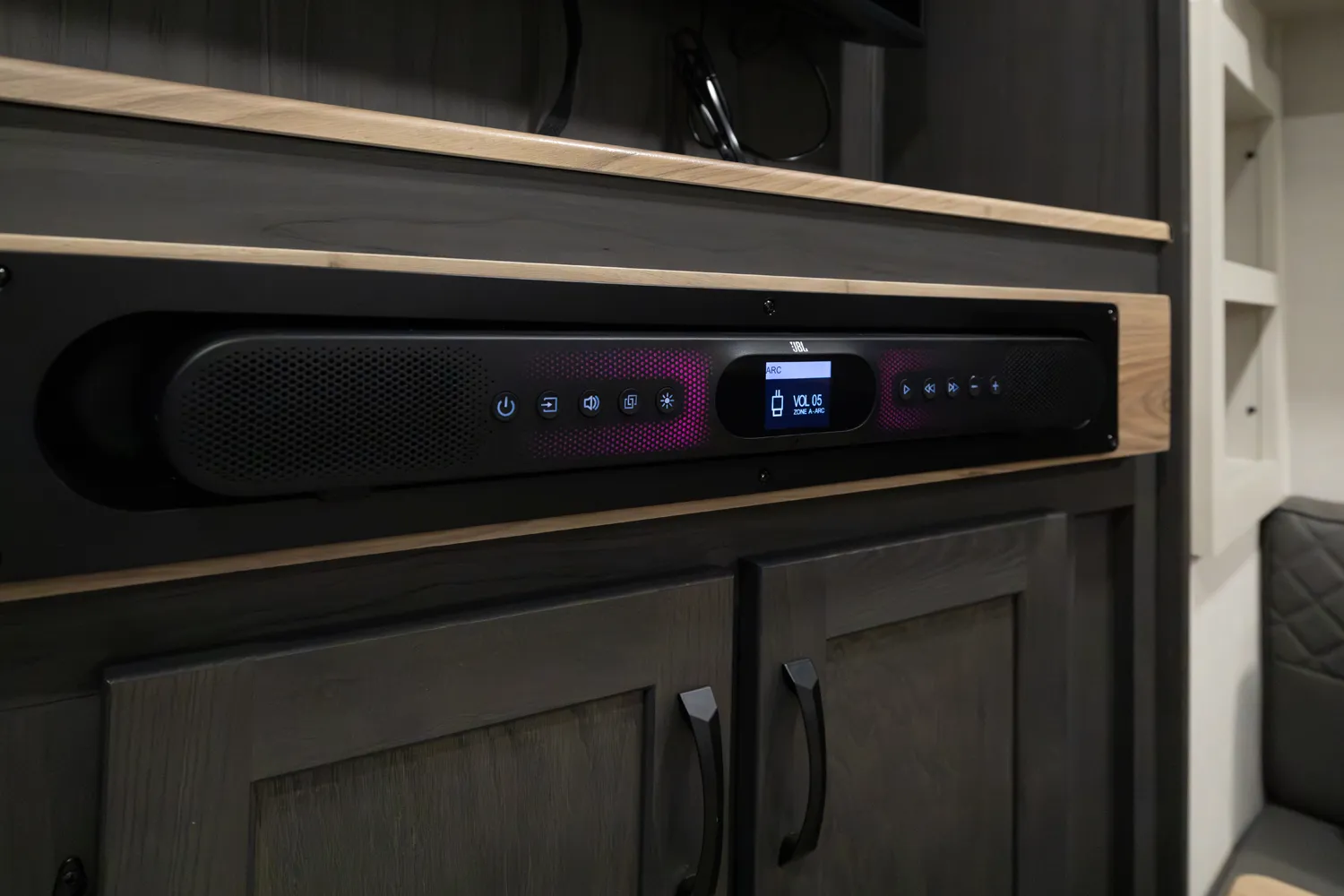 • Upgraded Carbon & Walnut Ent. Center W/ JBL® Soundbar Including AM/FM & Bluetooth®