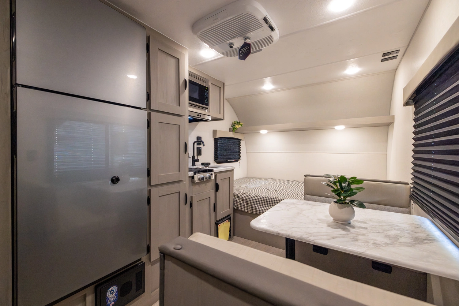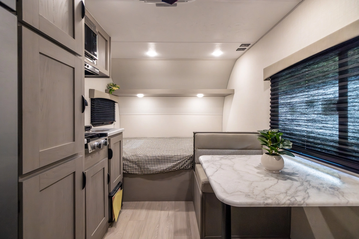 The 16FB is the oldest floorplan offering in the 3K Series. Complete with a corner bath, rear storage, pantry, dinette (that converts into bed), and east/west front bed with jumbo pass-through storage. #CampEasy