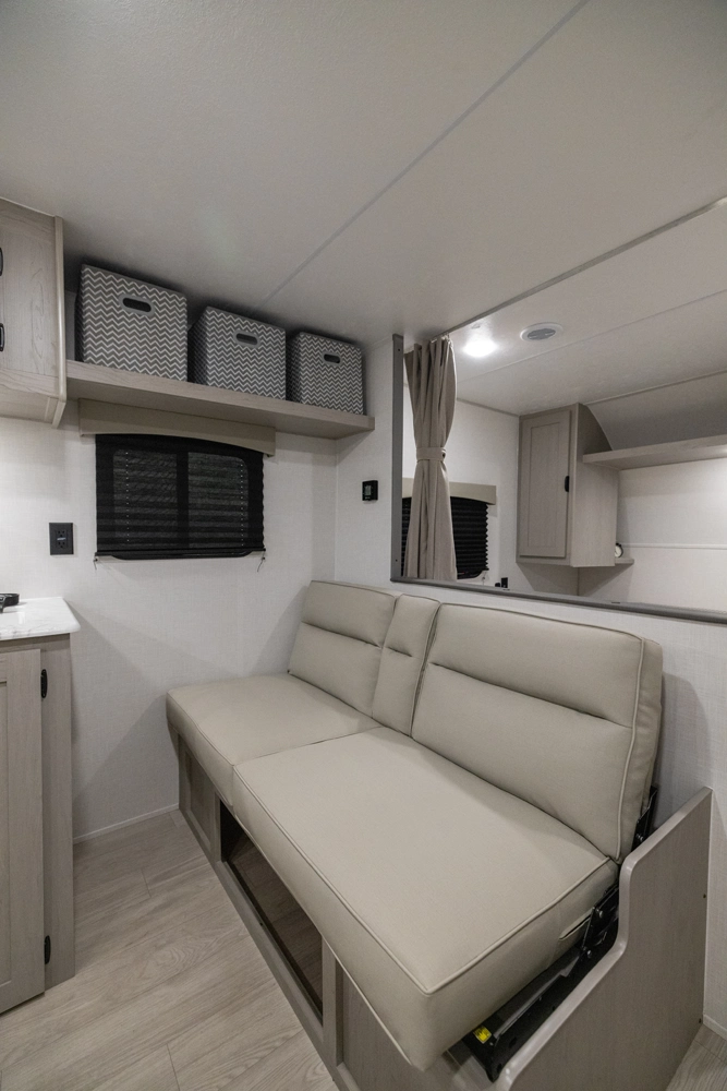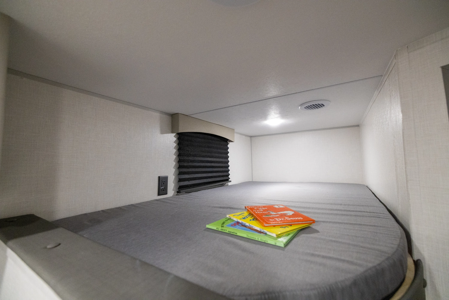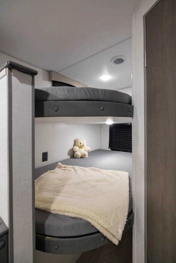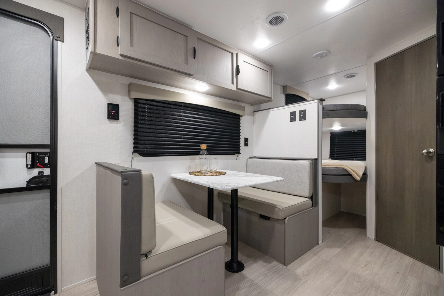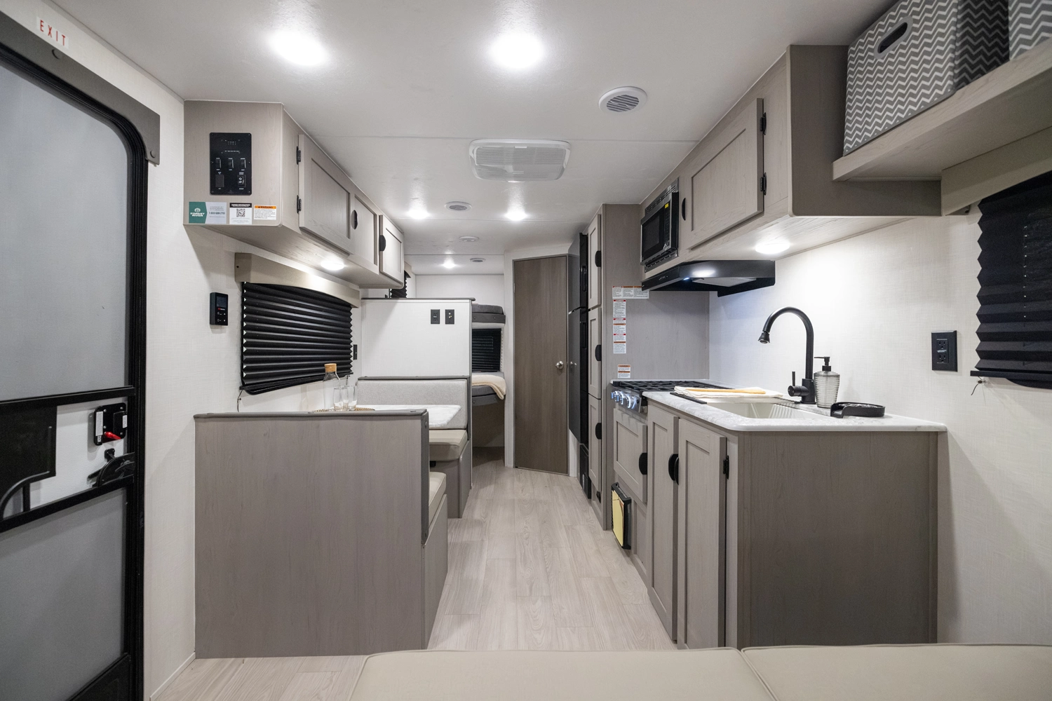 This is a relaunch of the industry’s top selling non-slide bunk house floorplan. The 26BH features an open-space concept. It features double-over-double bunks, full pantry, large bathroom with added storage and an interior bathroom sink, 4-person dinette, prepped for an outside kitchen, and a jack-knife sofa with side-overhead cabinets. This trailer is built for a family with more than two kids that wants more interior living space and comfort. #CampEasy