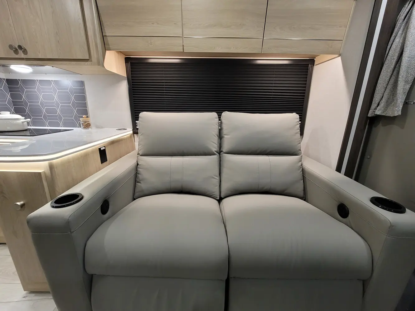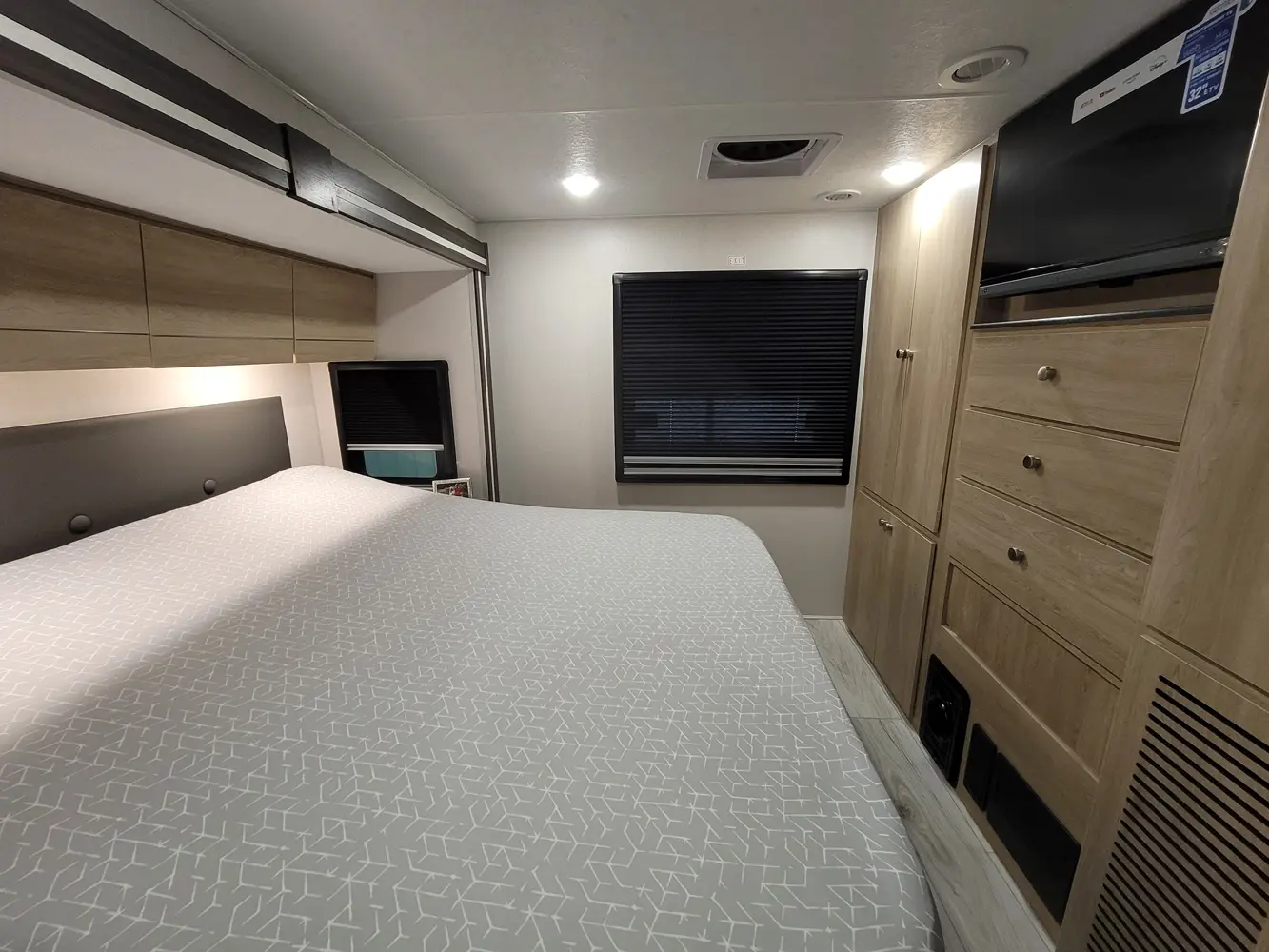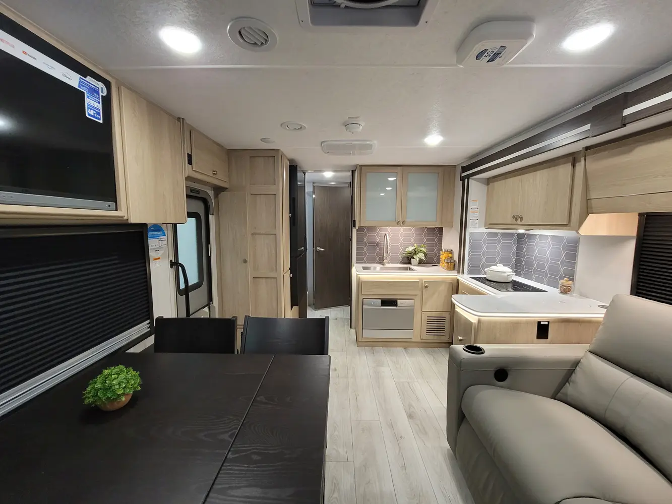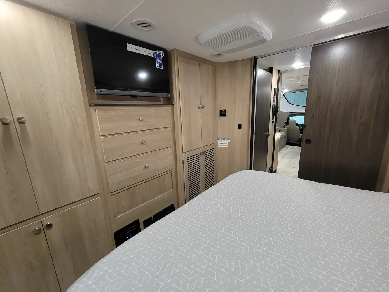 The 321DS has 2 slide outs and 1 entry. Exterior features outside entertainment center and storage. Interior layout from front to back: cockpit with step to main living area; off-door side slideout with recliners, overhead cabinet, kitchen counter with cooktop, and microwave above; door side dinette, TV, entry, pantry, and 12V refrigerator; front-facing kitchen counter with sink and overhead cabinet along inner wall; full pass-thru bathroom with linen closet; rear bedroom with off-door side dresser, TV, and wardrobes with optional washer/dryer, and a door side slideout with power incline king bed, overhead cabinet, and night stands on each side.