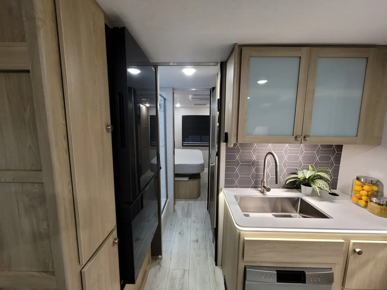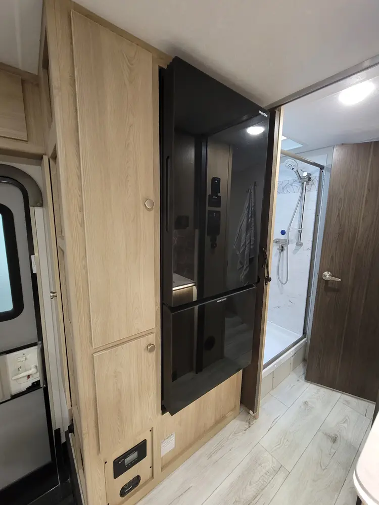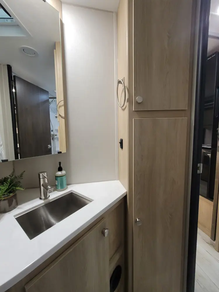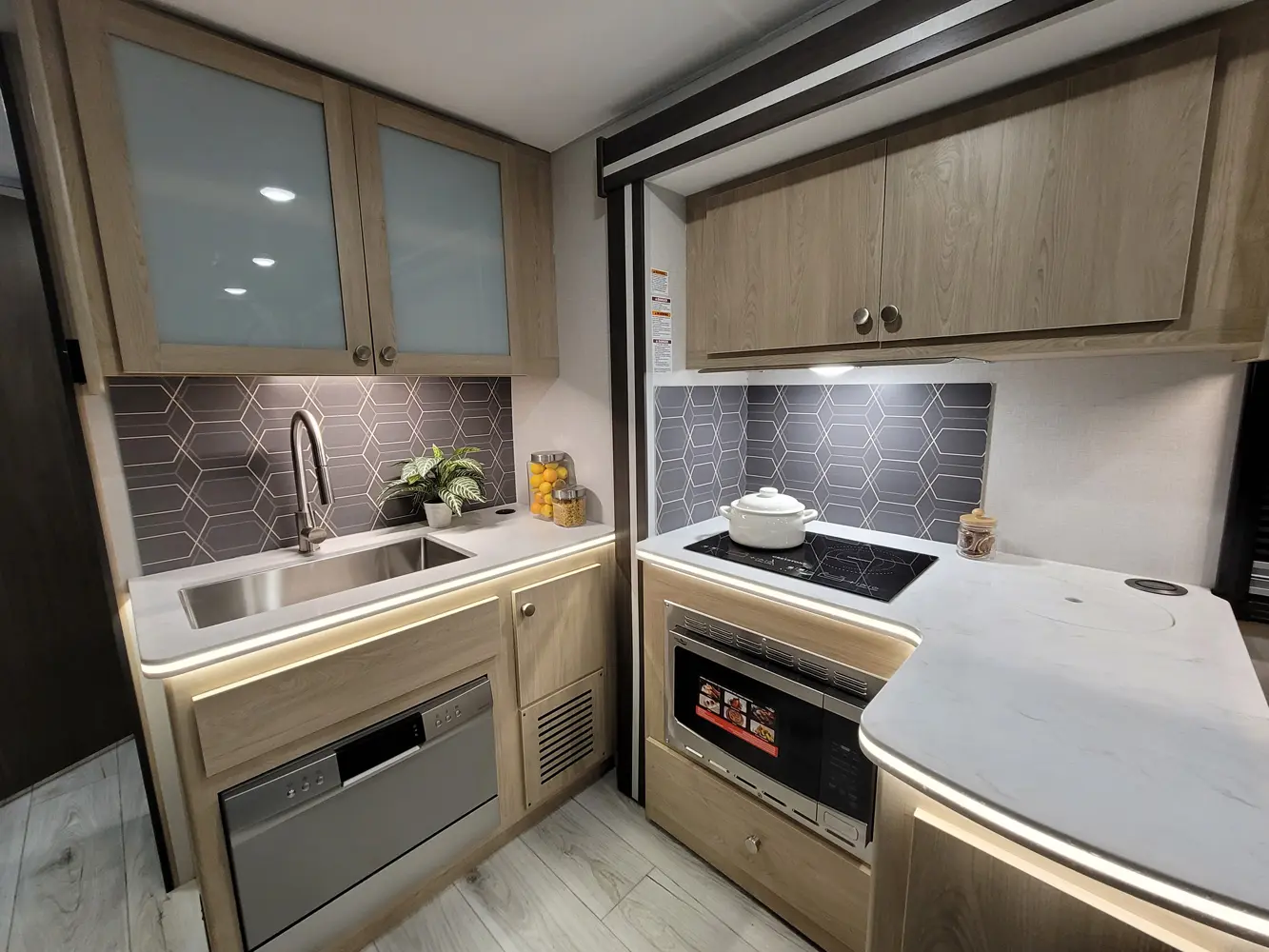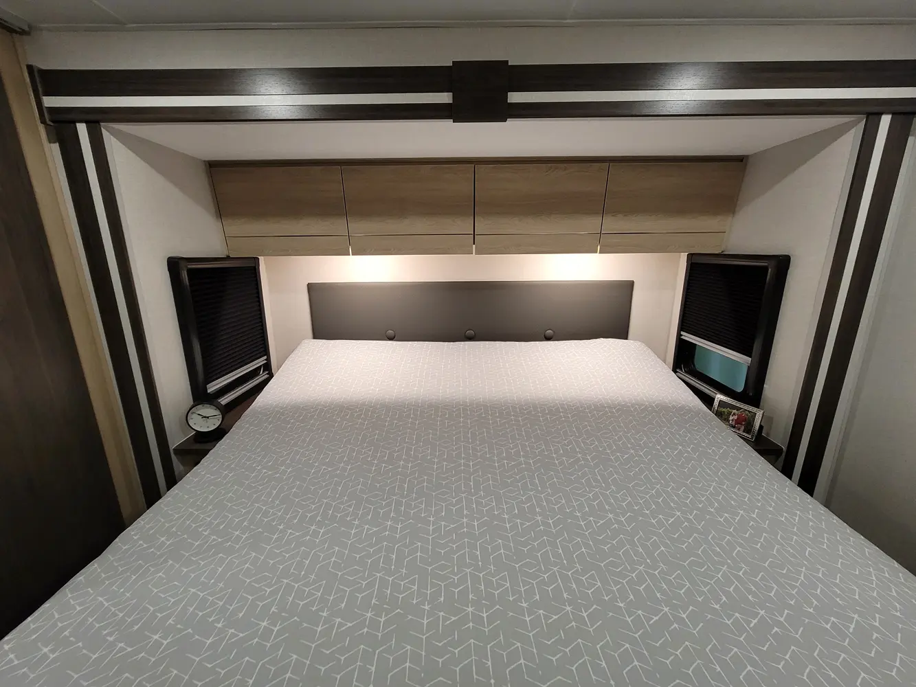 The 321DS has 2 slide outs and 1 entry. Exterior features outside entertainment center and storage. Interior layout from front to back: cockpit with step to main living area; off-door side slideout with recliners, overhead cabinet, kitchen counter with cooktop, and microwave above; door side dinette, TV, entry, pantry, and 12V refrigerator; front-facing kitchen counter with sink and overhead cabinet along inner wall; full pass-thru bathroom with linen closet; rear bedroom with off-door side dresser, TV, and wardrobes with optional washer/dryer, and a door side slideout with power incline king bed, overhead cabinet, and night stands on each side.
