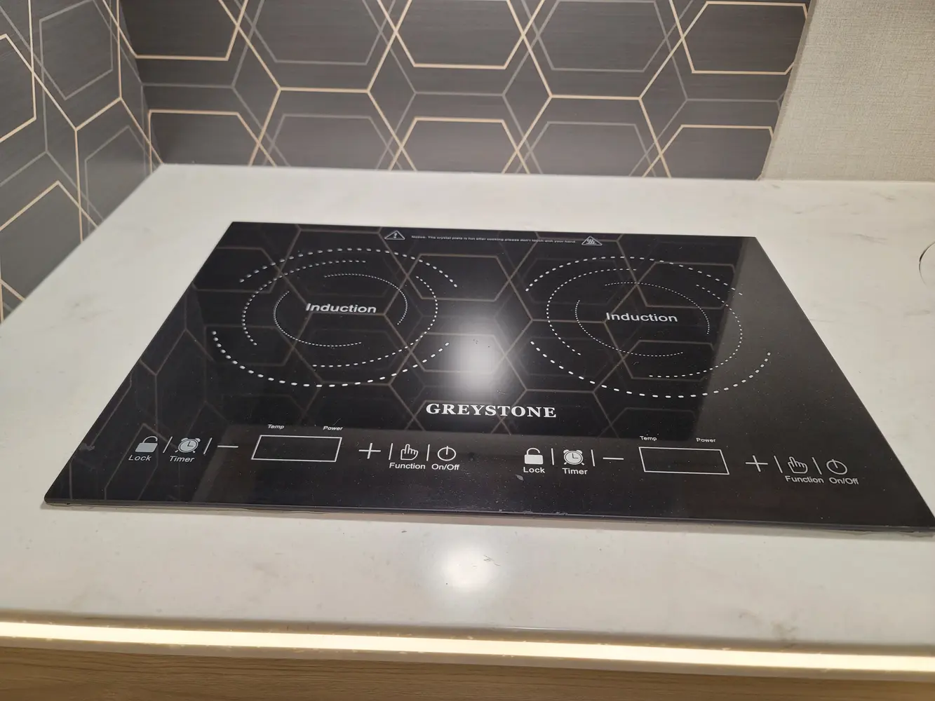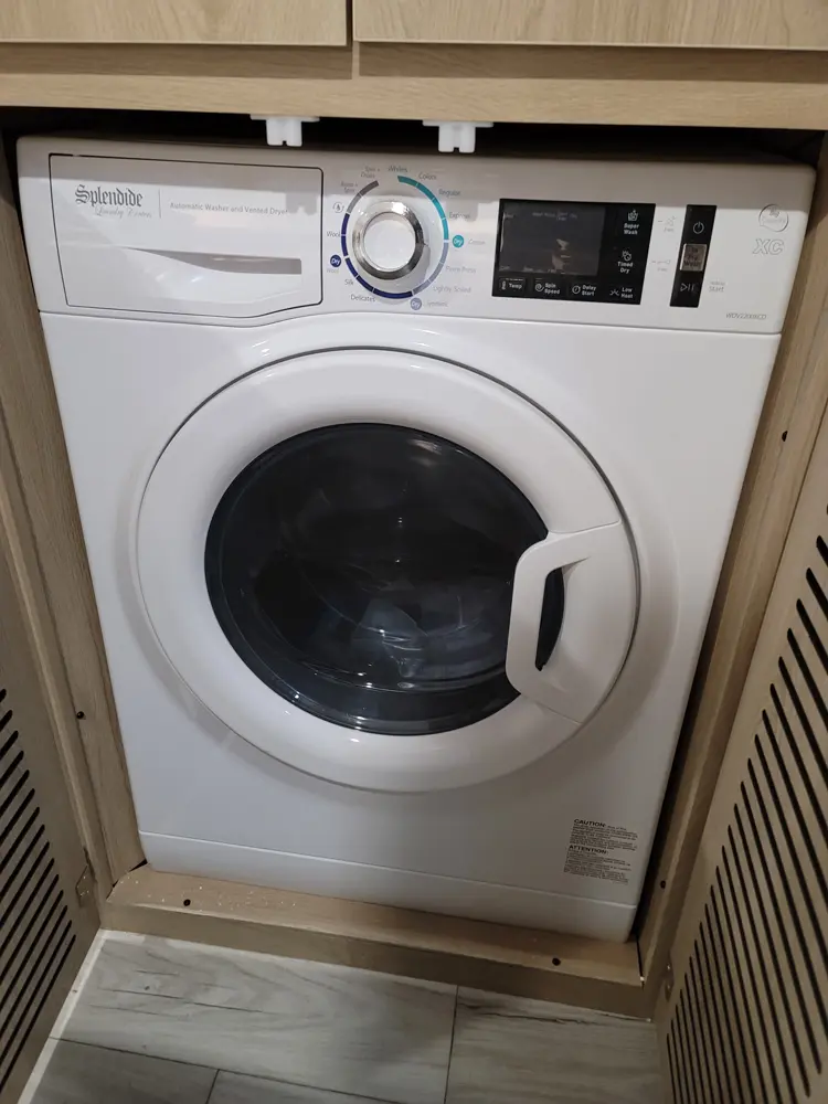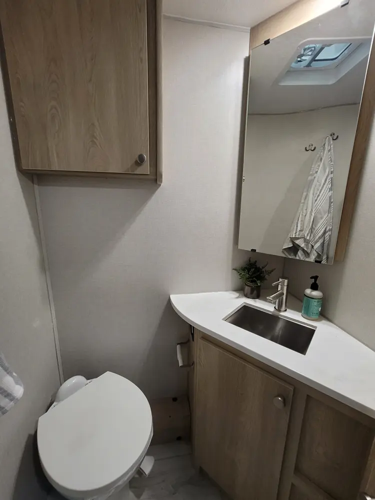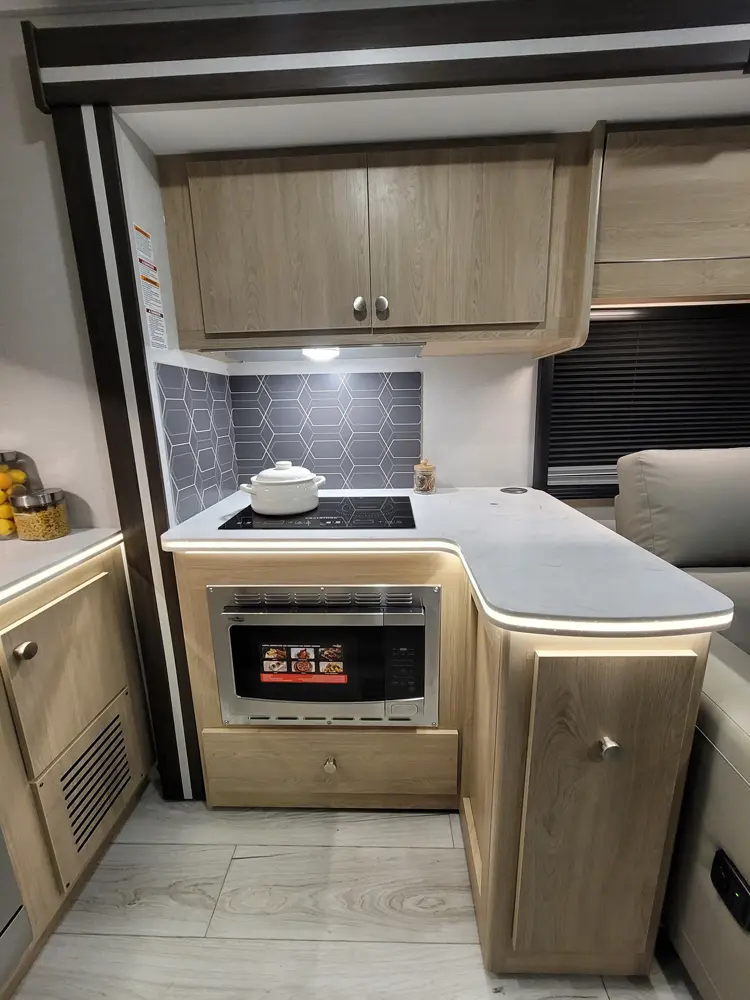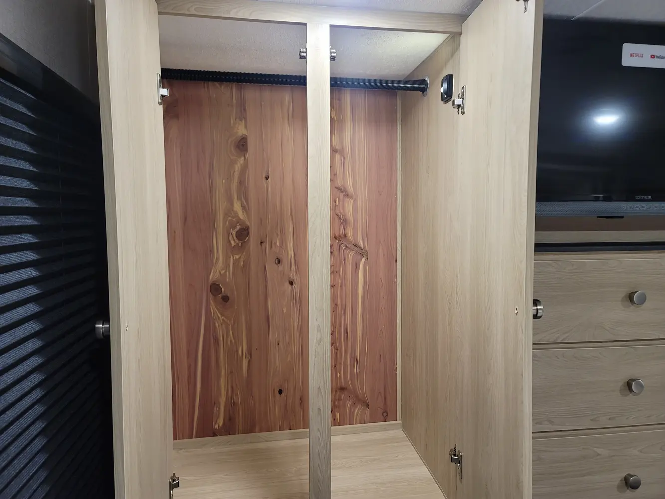 The 321DS has 2 slide outs and 1 entry. Exterior features outside entertainment center and storage. Interior layout from front to back: cockpit with step to main living area; off-door side slideout with recliners, overhead cabinet, kitchen counter with cooktop, and microwave above; door side dinette, TV, entry, pantry, and 12V refrigerator; front-facing kitchen counter with sink and overhead cabinet along inner wall; full pass-thru bathroom with linen closet; rear bedroom with off-door side dresser, TV, and wardrobes with optional washer/dryer, and a door side slideout with power incline king bed, overhead cabinet, and night stands on each side.