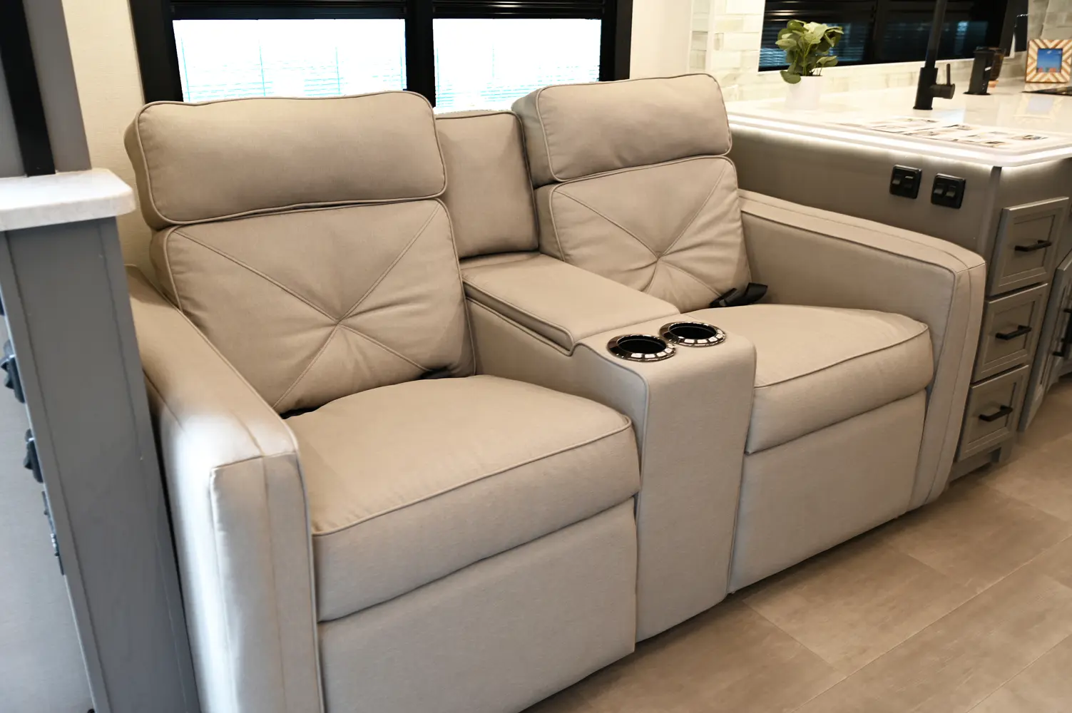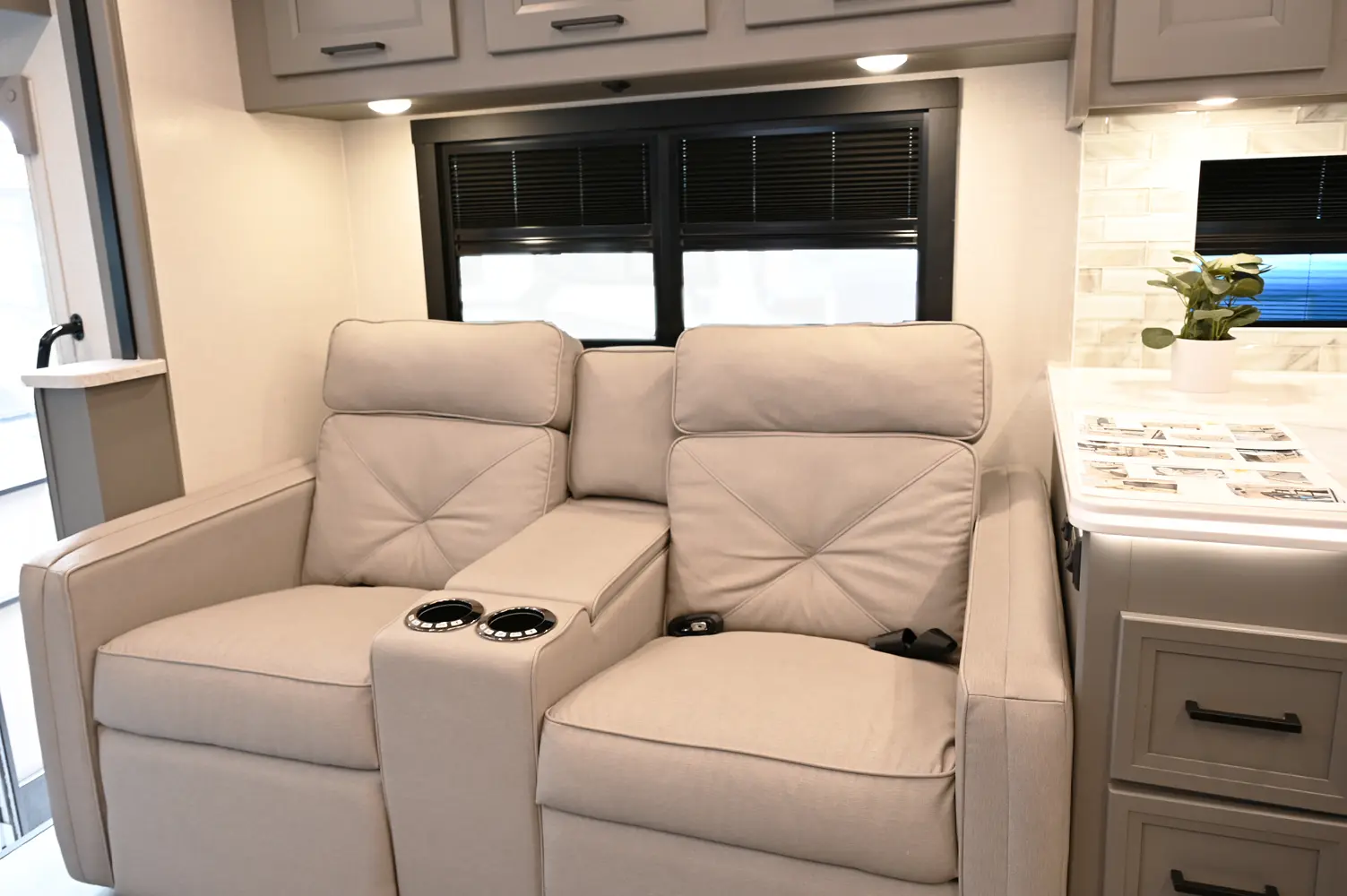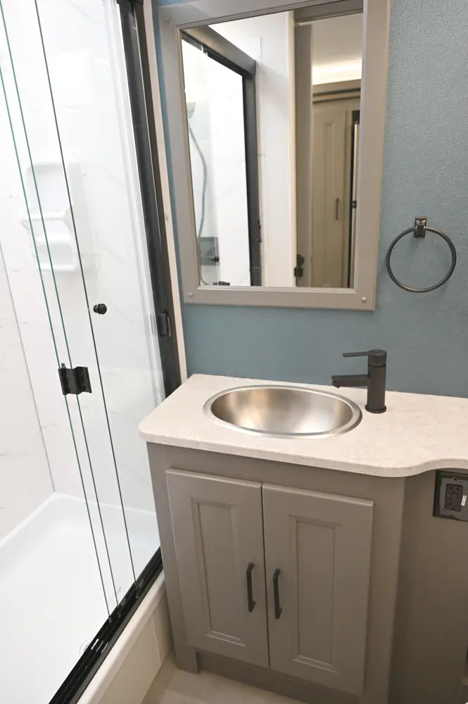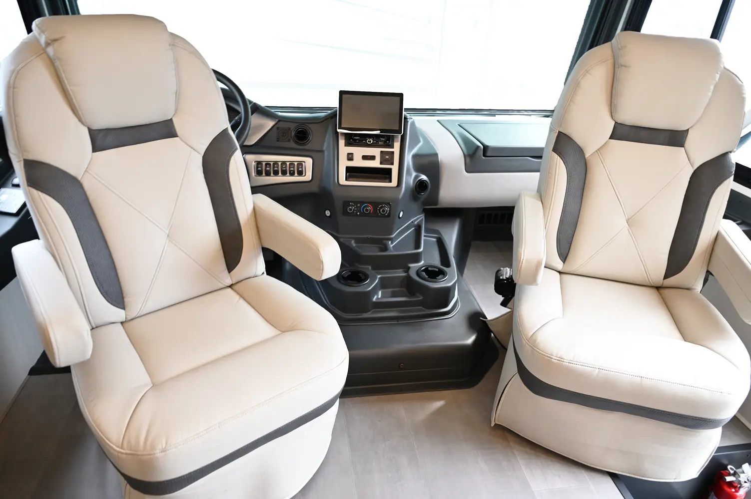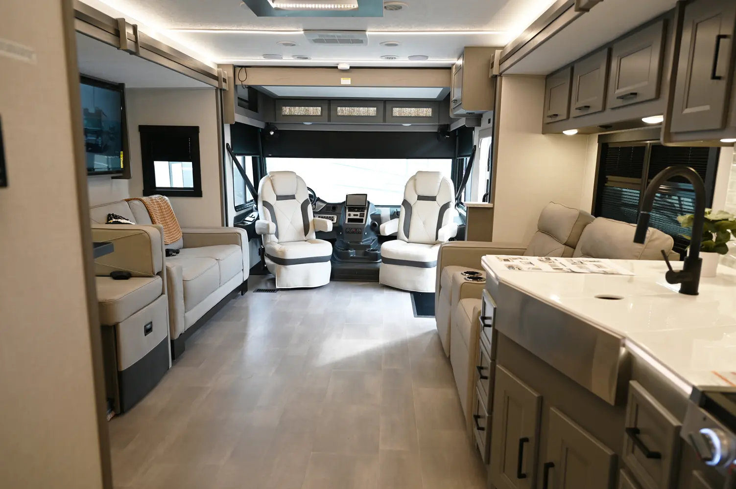 The Encore 355DS offers a double-slide design and a spacious living area that feels open and comfortable. This 36-foot motorhome makes relaxing after a day of hiking or kayaking easy, with premium finishes, kitchen amenities, and sleeping space for your crew. With its 350 hp engine and strong build, it’s a luxurious and capable companion for extended road journeys.