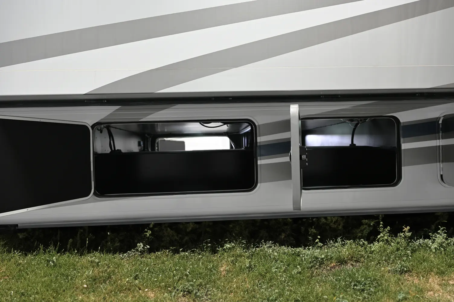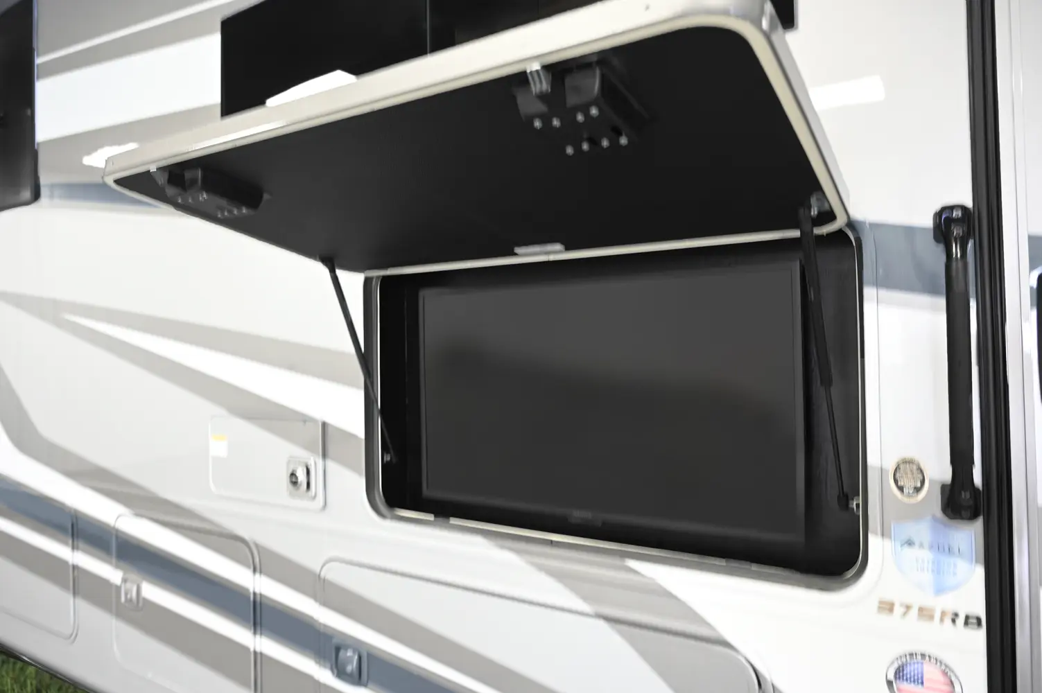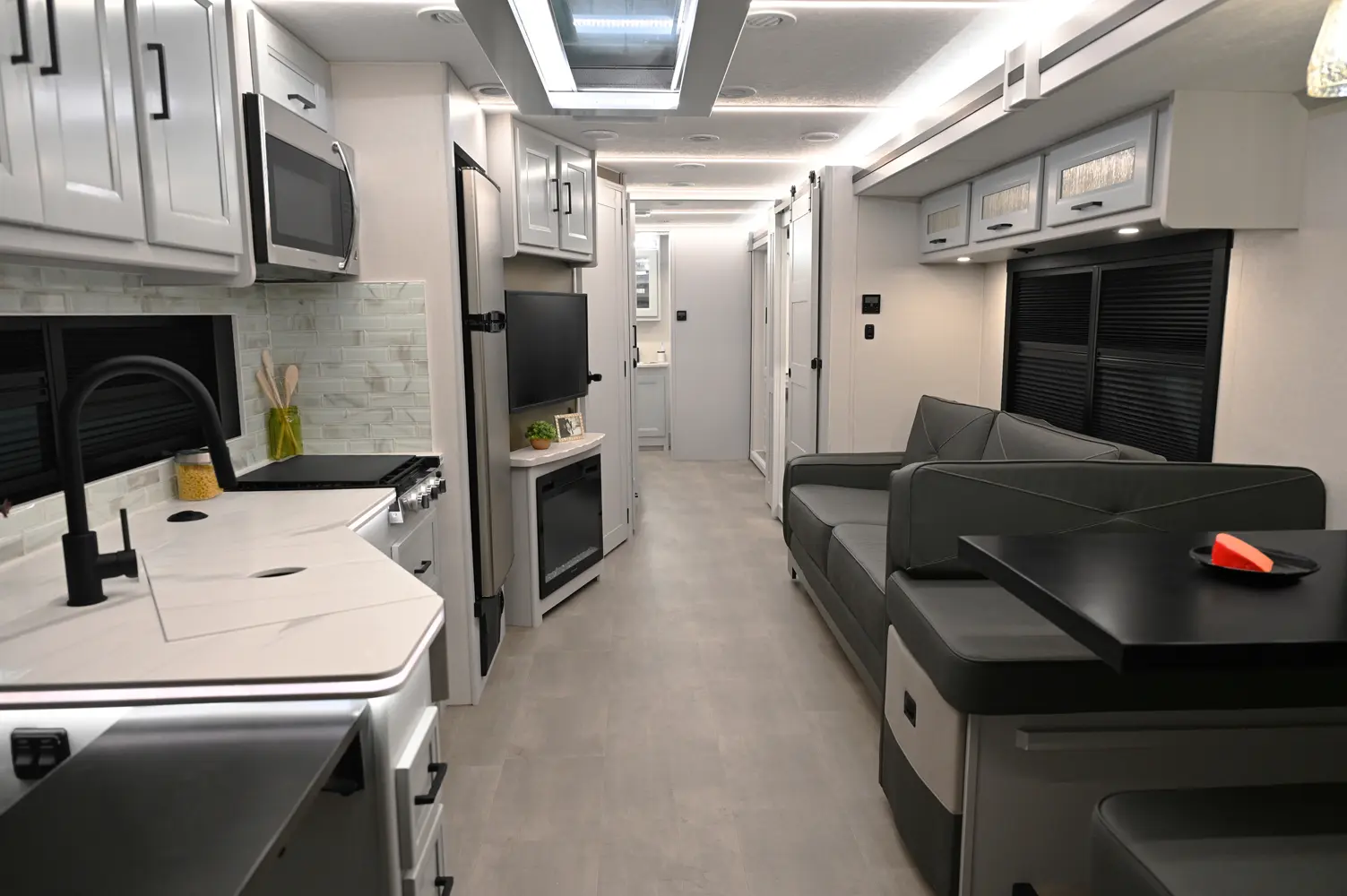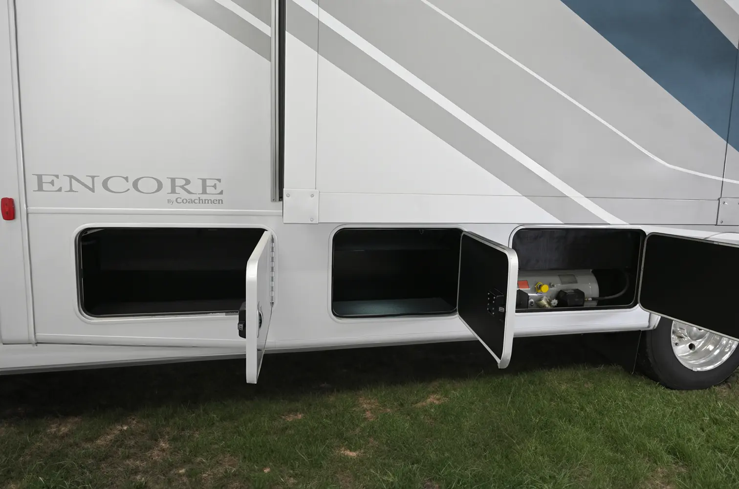 The Encore 375RB is a roomier 38-foot floor plan that gives you a private rear bedroom, generous storage, and a front lounge area. Its layout is ideal for longer trips, offering space to unwind after outdoor adventures like trail hikes, lakeside camping, or national park excursions. The powerful gas engine and high-capacity tanks make extended travel smooth and stress-free.