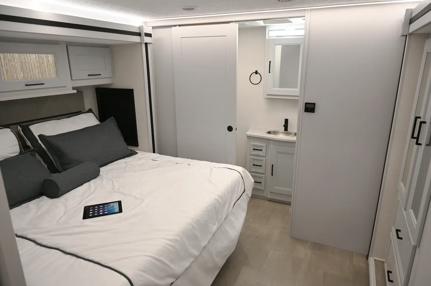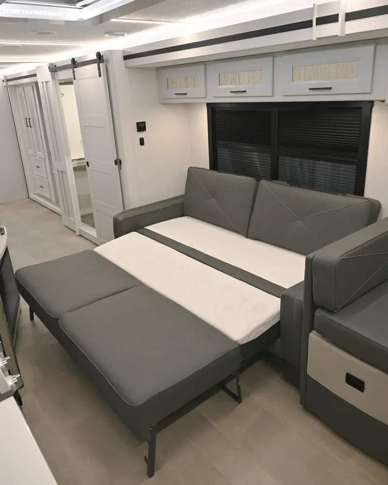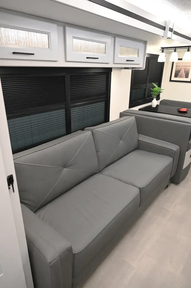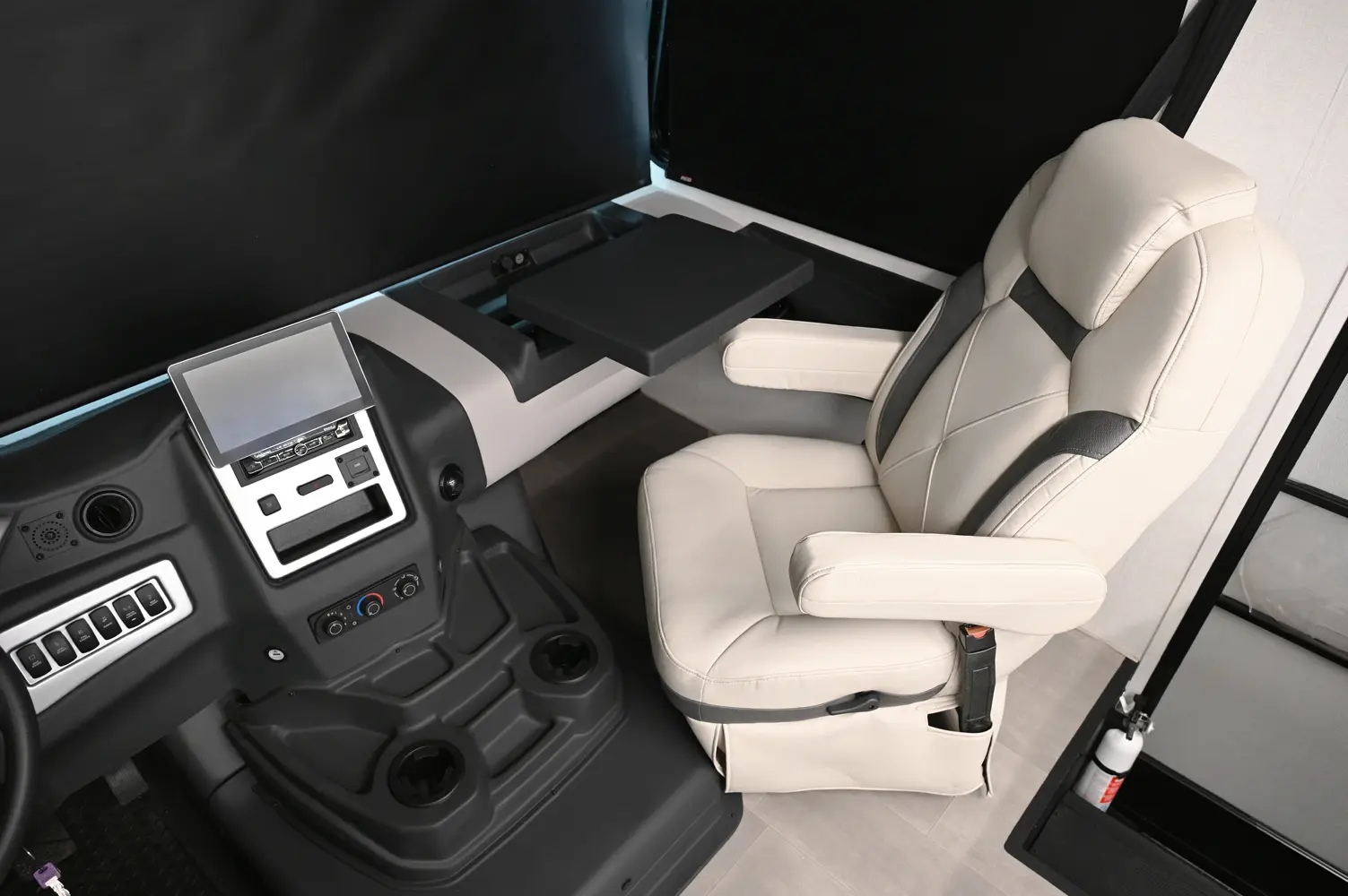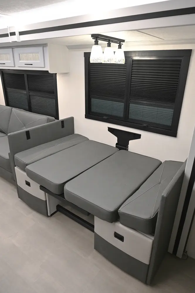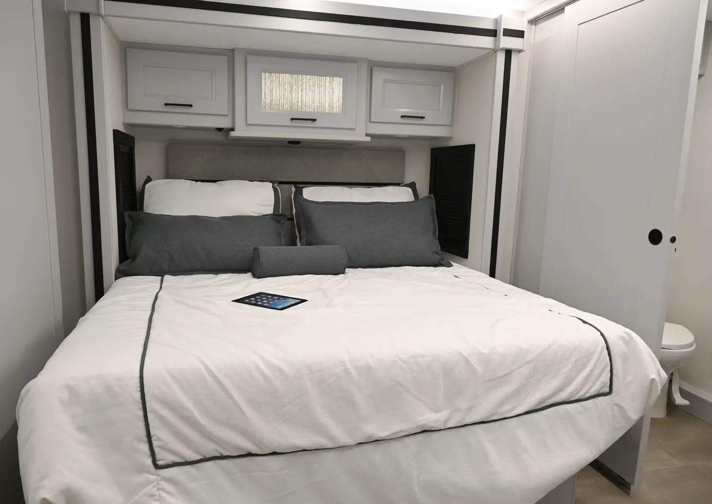 The Encore 375RB is a roomier 38-foot floor plan that gives you a private rear bedroom, generous storage, and a front lounge area. Its layout is ideal for longer trips, offering space to unwind after outdoor adventures like trail hikes, lakeside camping, or national park excursions. The powerful gas engine and high-capacity tanks make extended travel smooth and stress-free.