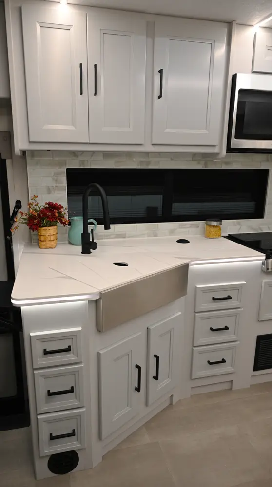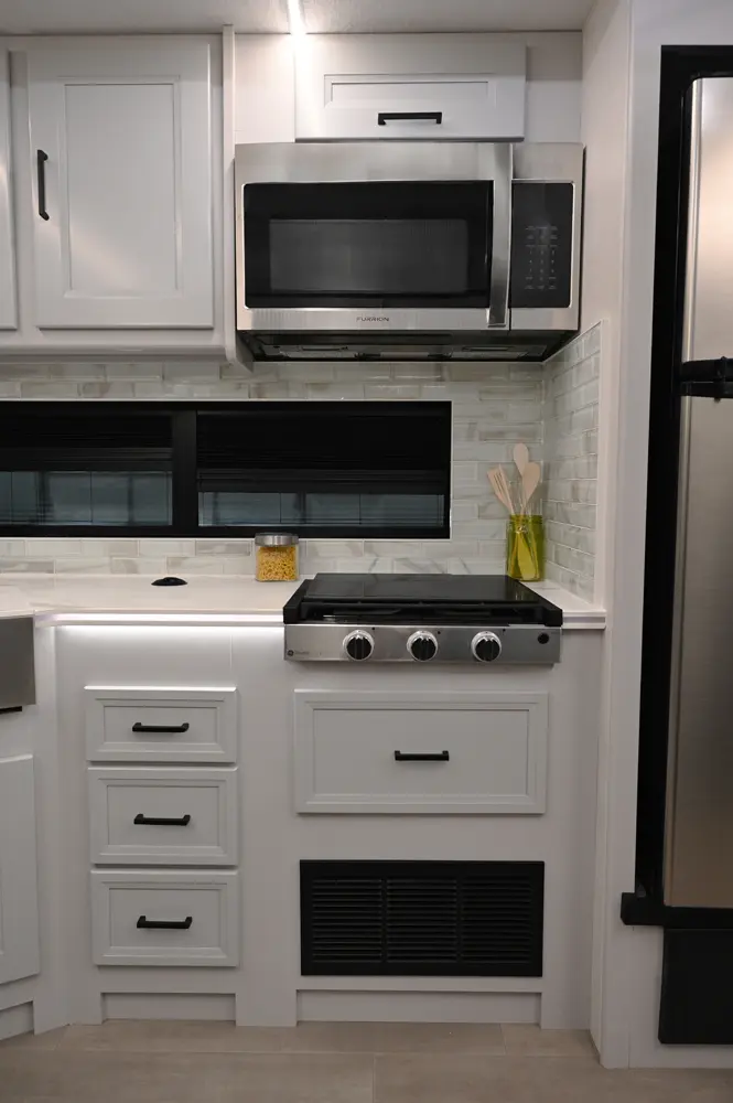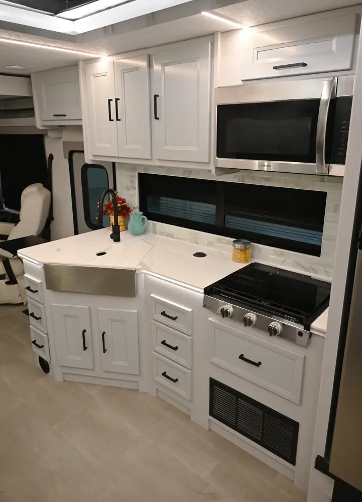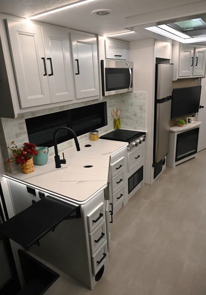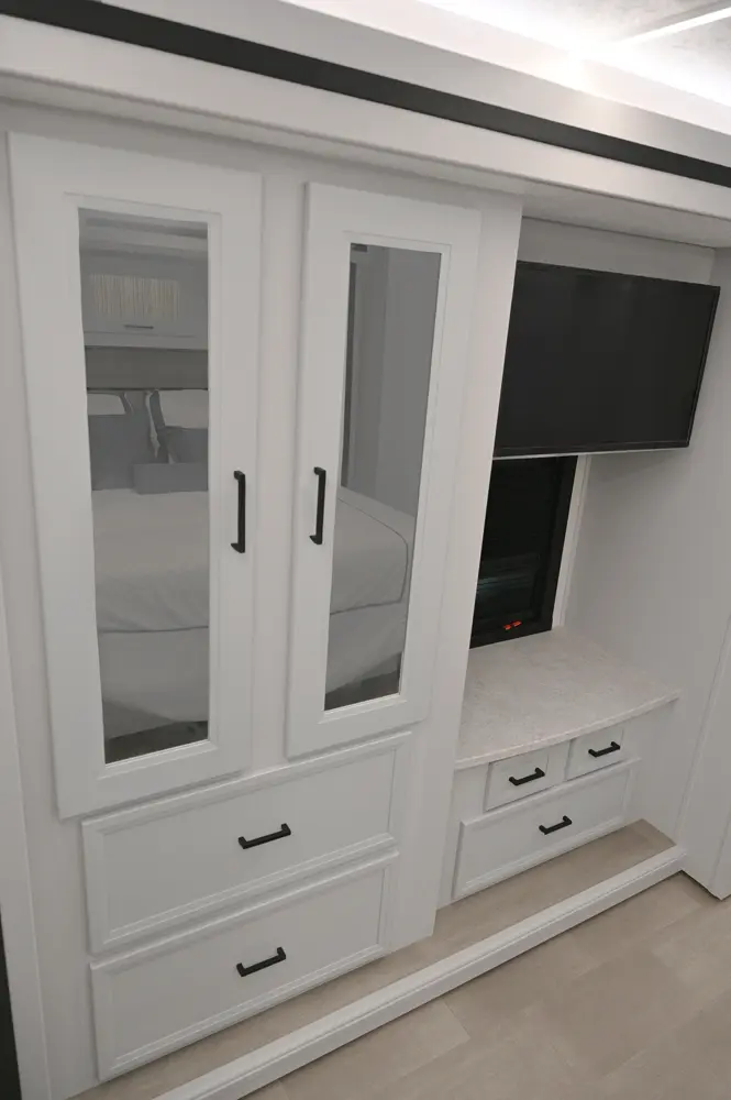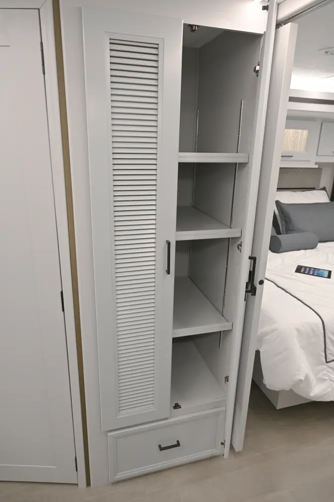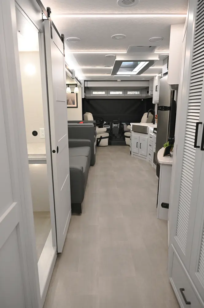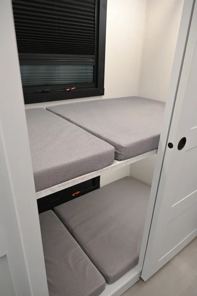 The Encore 375RB is a roomier 38-foot floor plan that gives you a private rear bedroom, generous storage, and a front lounge area. Its layout is ideal for longer trips, offering space to unwind after outdoor adventures like trail hikes, lakeside camping, or national park excursions. The powerful gas engine and high-capacity tanks make extended travel smooth and stress-free.