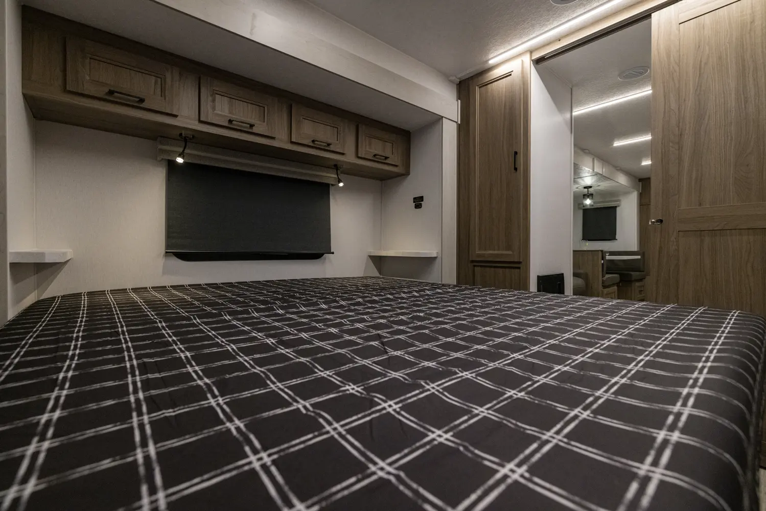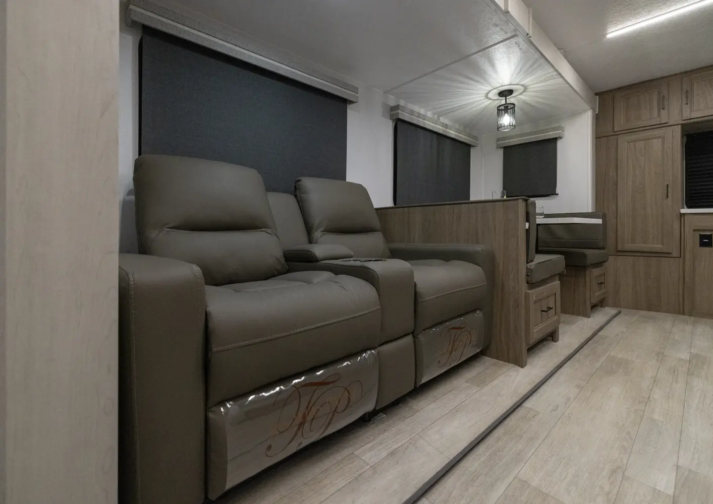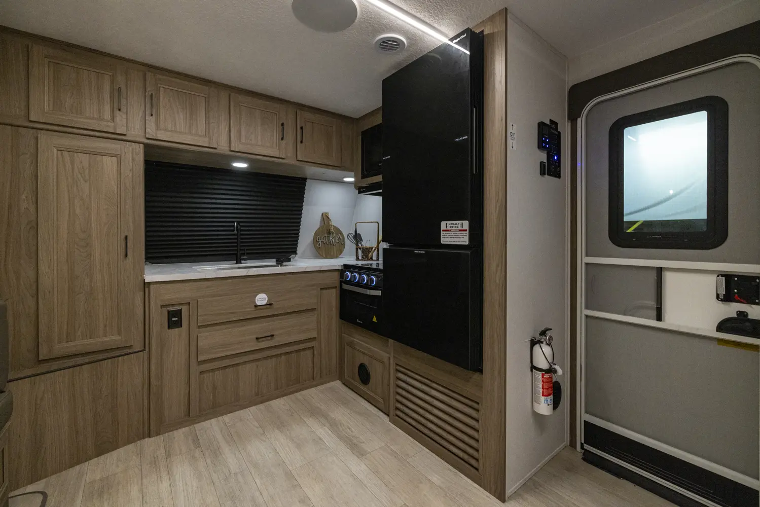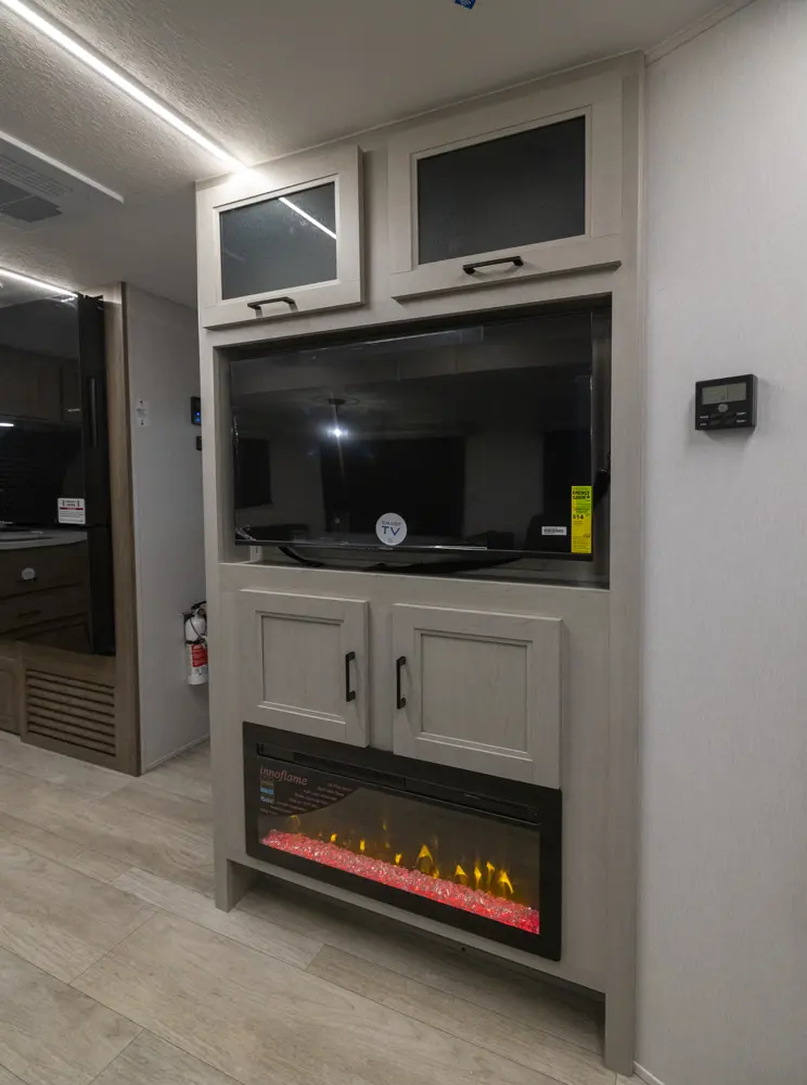The 259FKBS has two slideouts and one entry. Exterior features front pass-thru storage, rear storage on each side, full camp kitchen with sink, overhead cabinet, and refrigerator, and 18 foot awning. Interior layout front to back: pantry and kitchen counter with sink and overhead cabinet wrap from the front to the door side with microwave, cooktop, and refrigerator; off-door side slideout with dinette, and a hide-a-bed sofa with overhead cabinet (optional theater seat), and wardrobe; door side entry, pantry/closet, entertainment center with fireplace along inner wall, and full bathroom with linen closet; rear off-door side king bed slideout with overhead cabinet, and rear door side wardrobe and TV shelf.