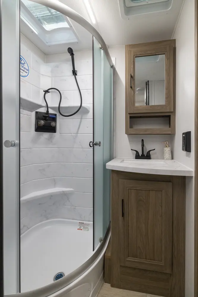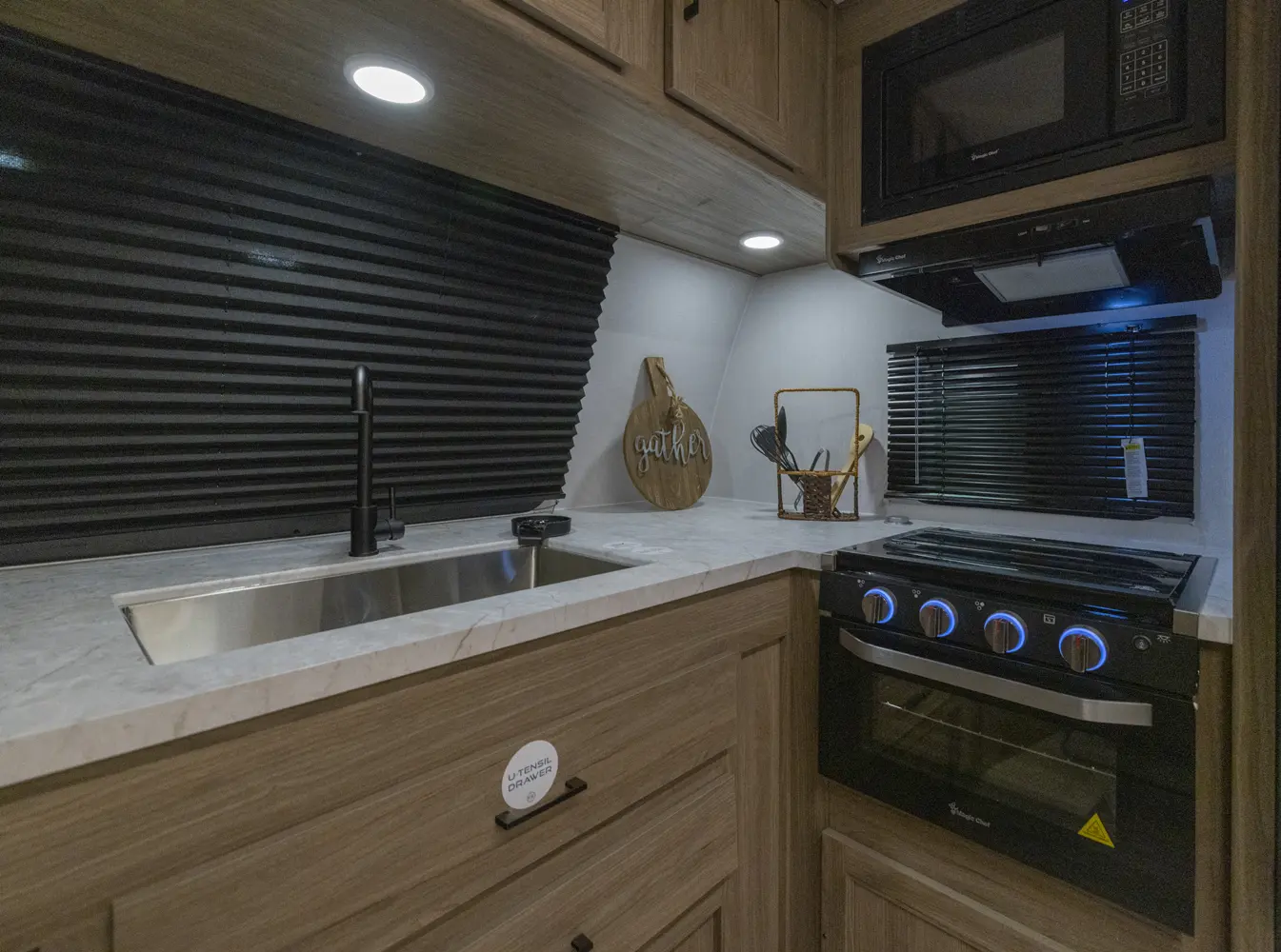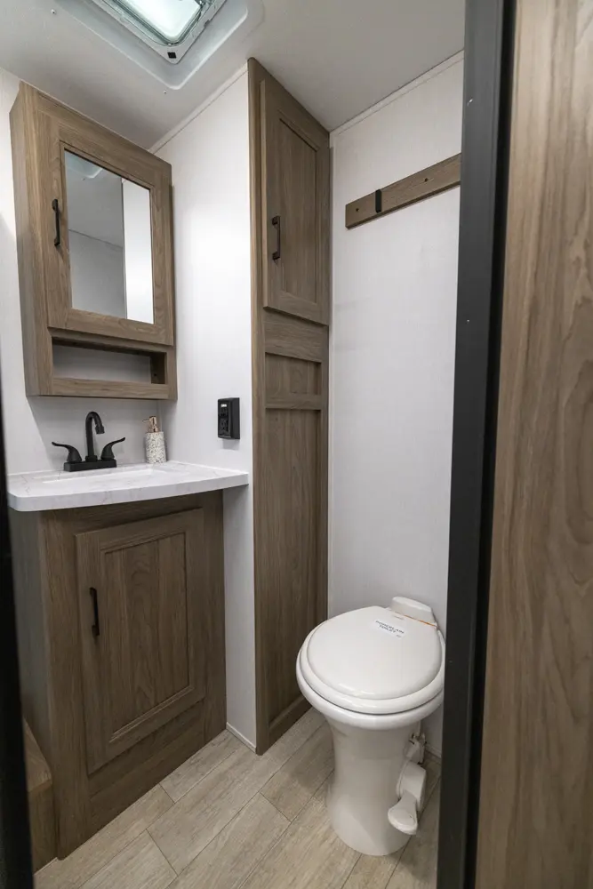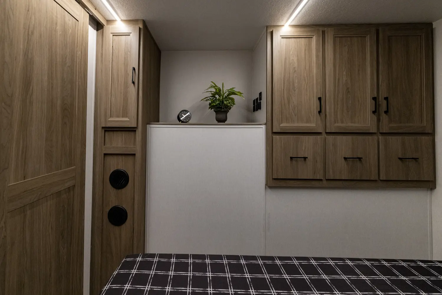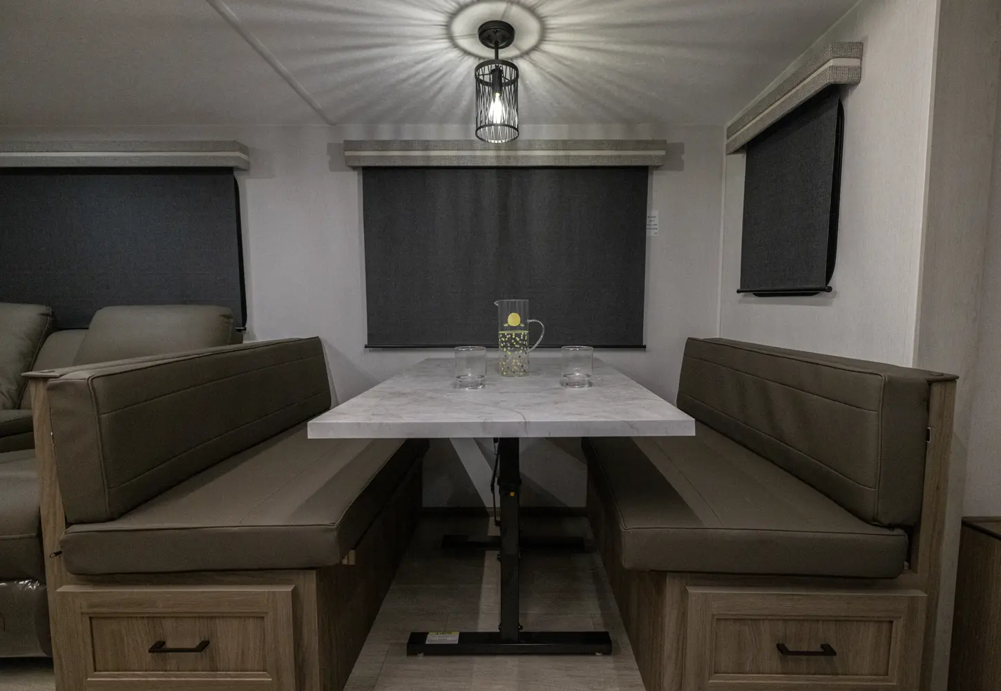 The 259FKBS has two slideouts and one entry. Exterior features front pass-thru storage, rear storage on each side, full camp kitchen with sink, overhead cabinet, and refrigerator, and 18 foot awning. Interior layout front to back: pantry and kitchen counter with sink and overhead cabinet wrap from the front to the door side with microwave, cooktop, and refrigerator; off-door side slideout with dinette, and a hide-a-bed sofa with overhead cabinet (optional theater seat), and wardrobe; door side entry, pantry/closet, entertainment center with fireplace along inner wall, and full bathroom with linen closet; rear off-door side king bed slideout with overhead cabinet, and rear door side wardrobe and TV shelf.