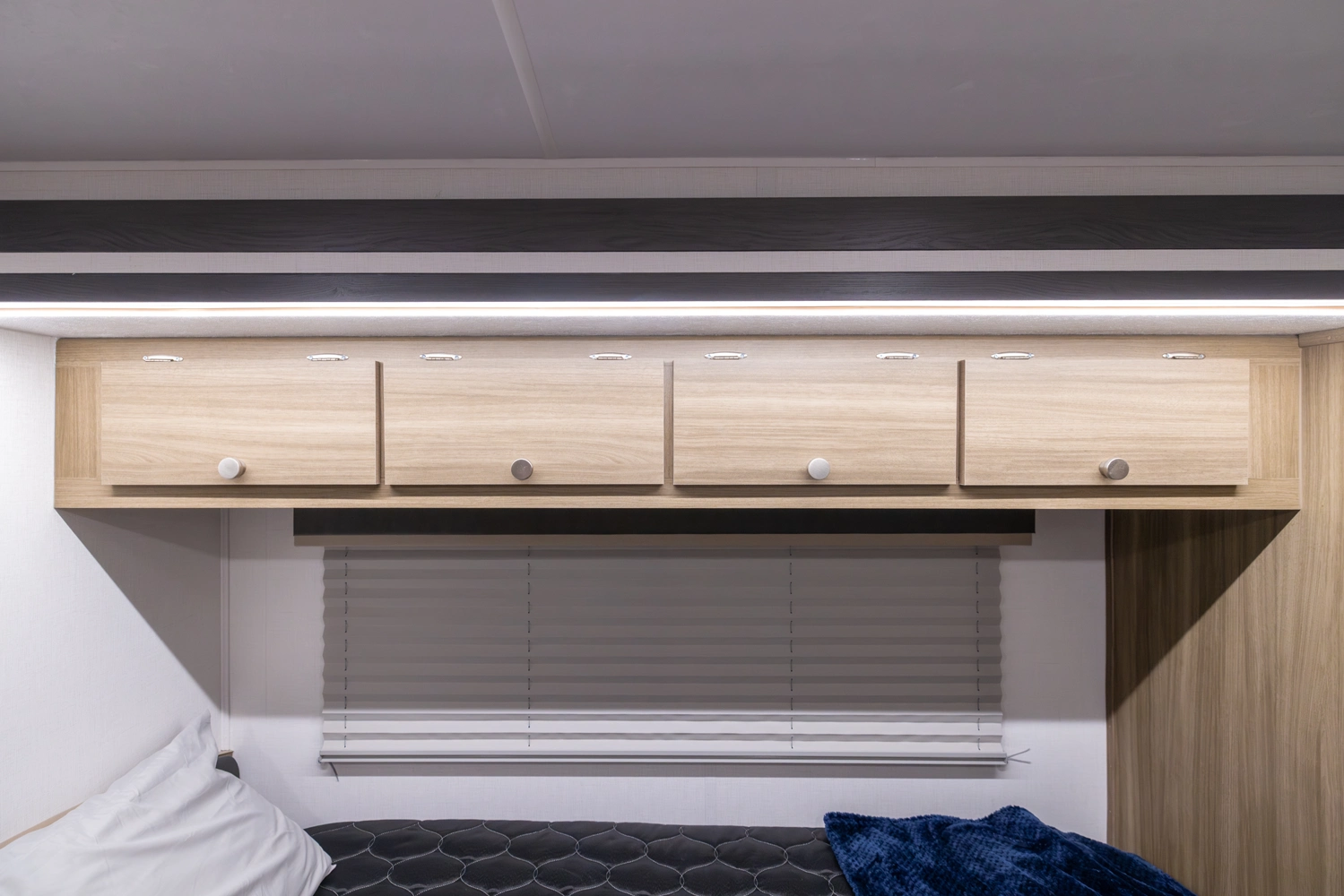 • Large Cab Over Bunk - 57" X 95" with Storage, Cup Holders and USB ports