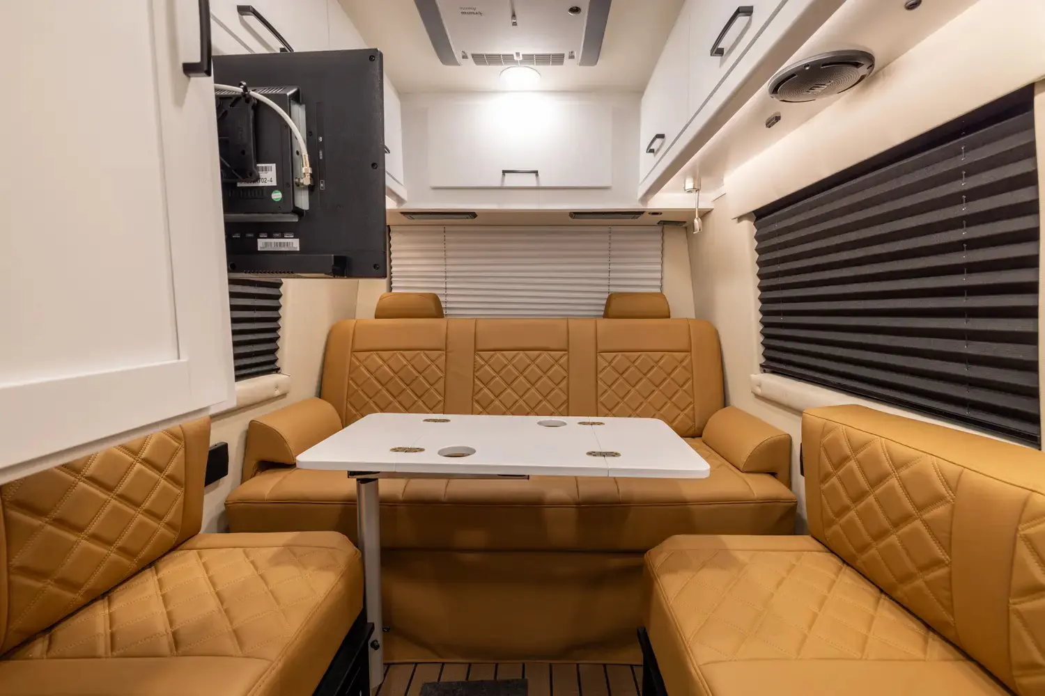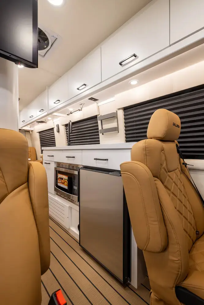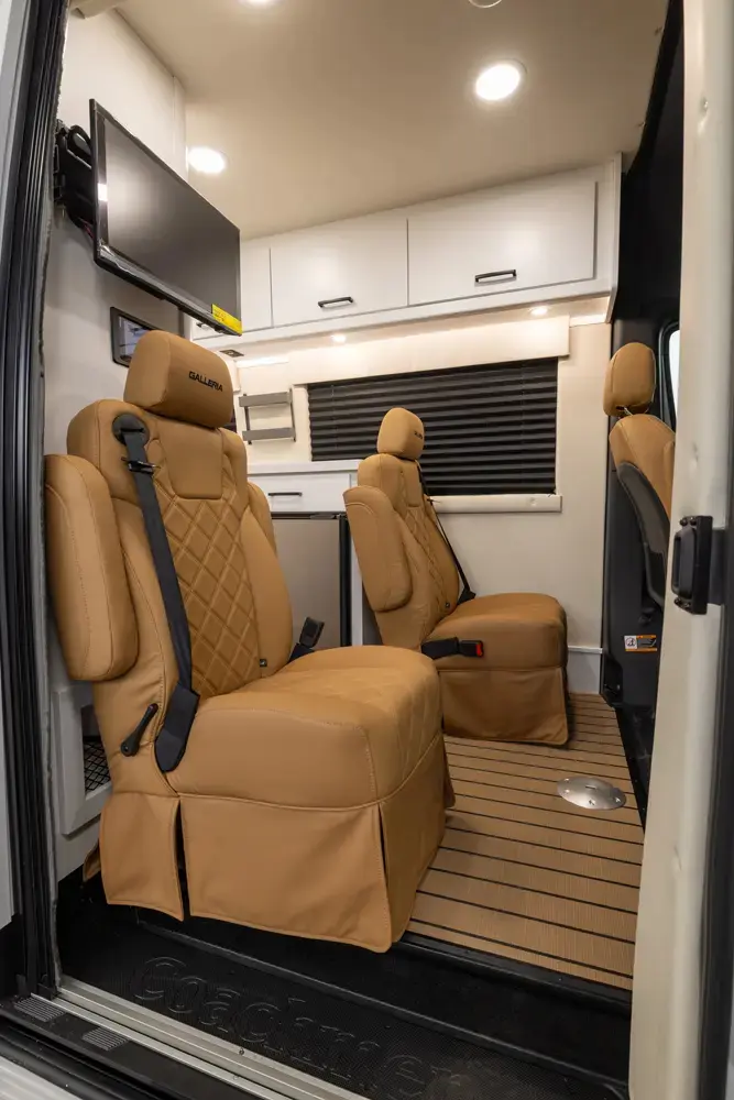The Galleria 24Q floorplan has one entry and zero slide outs. Exterior features include: 13' 1" awning. Interiors features include: rear sofa, captain chairs and LATCH system.