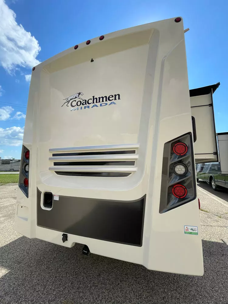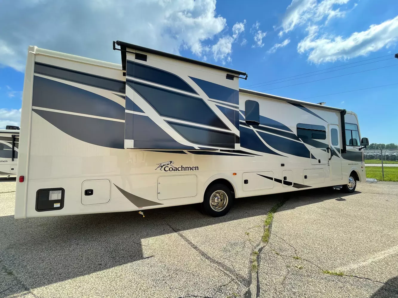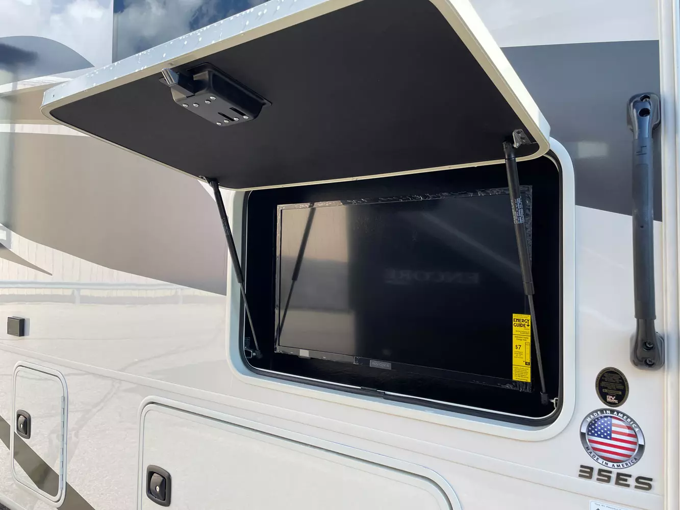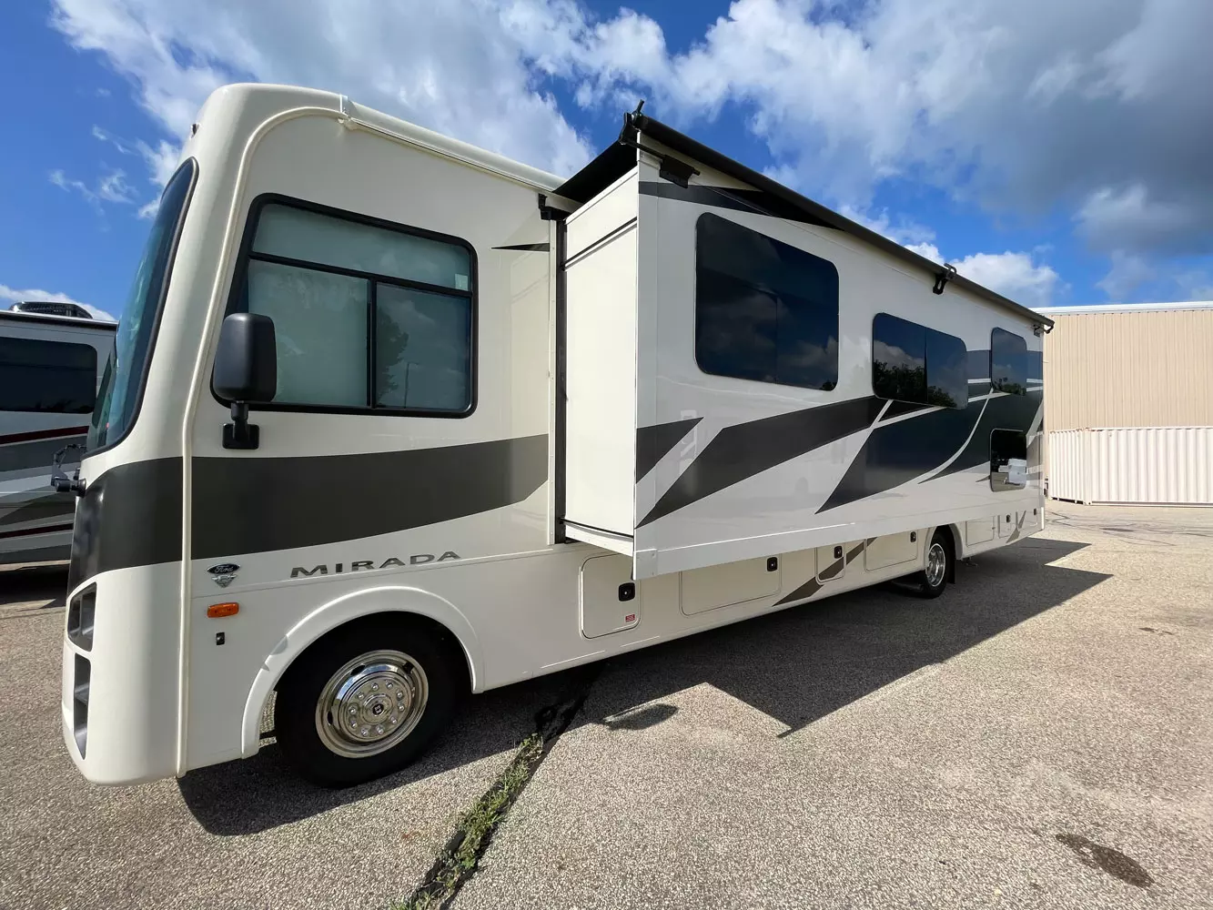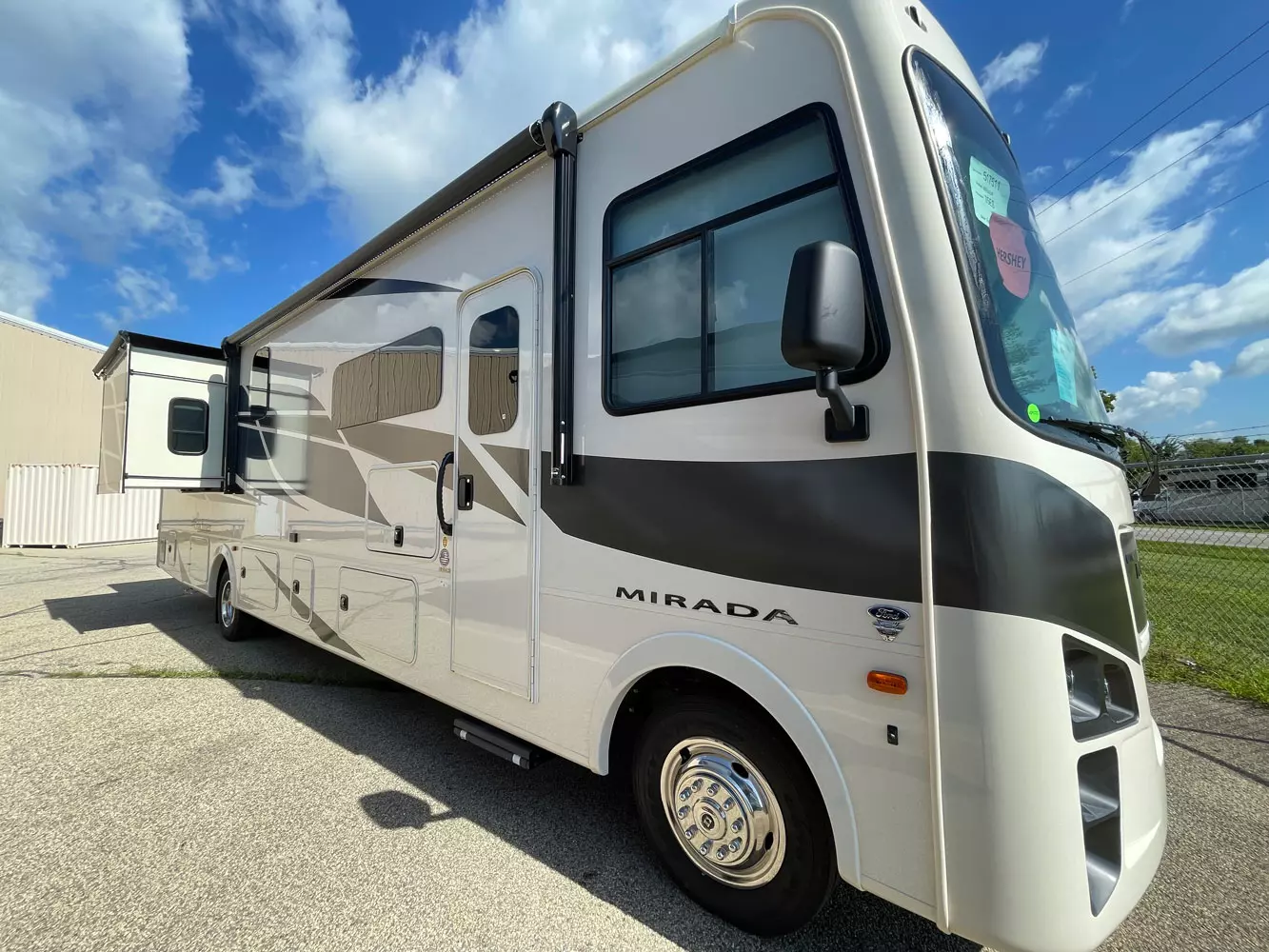 The Mirada 35ES has 2 slide outs located 1 on the off-door side and 1 door side; 1 entry door. Interior layout from front to back; front cockpit with drop down front bunk and computer work station on the door side; door side kitchen with farm sink near entry, microwave above stovetop and fridge; next to LED TV and fireplace; off-door side 42 inch by 70 inch dinette next to 68 inch sofa with bed; door side half bathroom with toilet and sink; off-door side bunk, office and wardrobe; rear bedroom with 72 inch by 76 inch foot facing king bed with overhead cabinet and CPAP station, off-door LED TV with storage and dresser and wardrobe and washer and dryer prep; rear second bathroom with door side 48 inch by 35 inch shower with toilet, sink and linen storage; Optional power theater seating. Exterior door side LED TV.