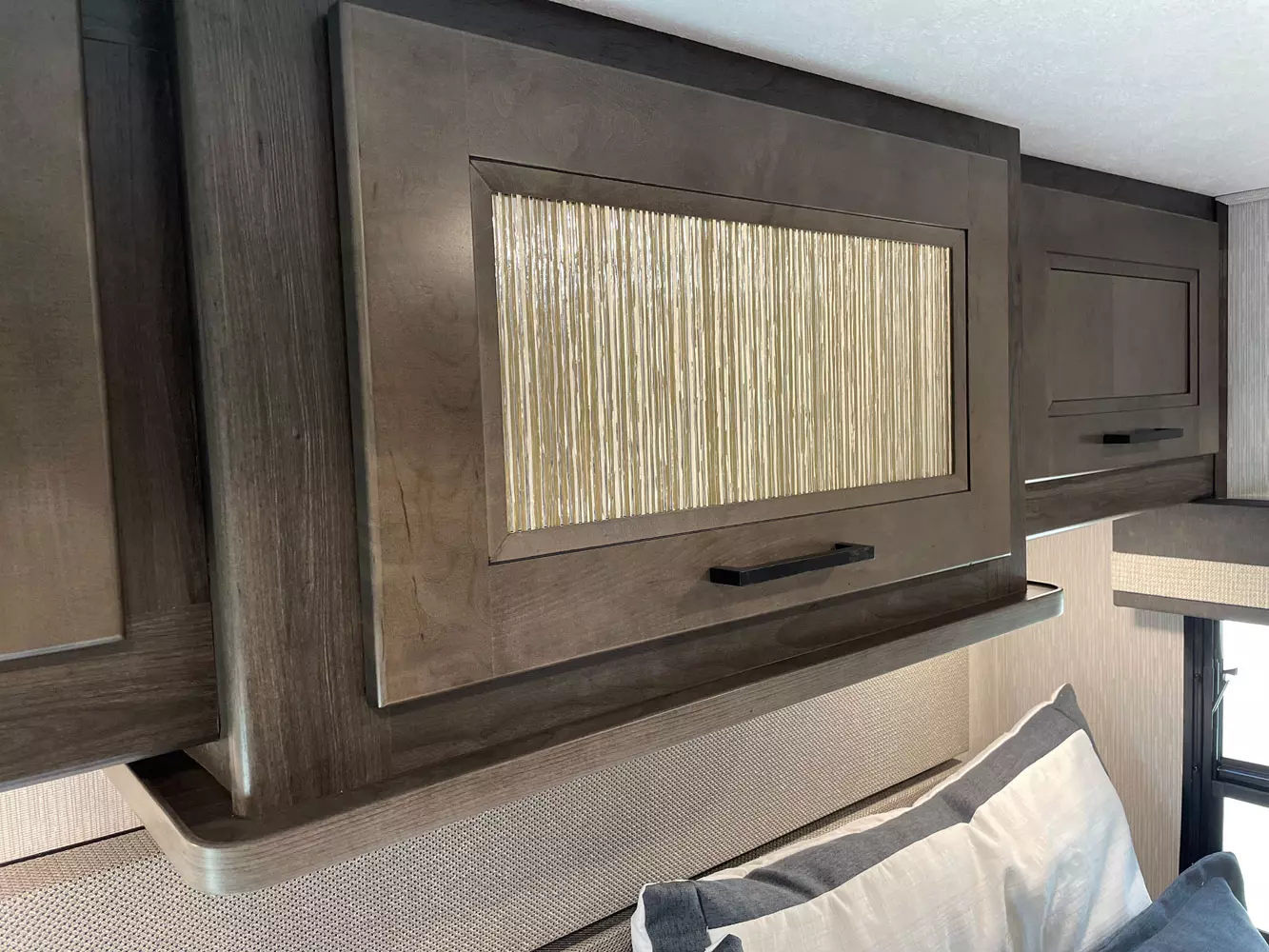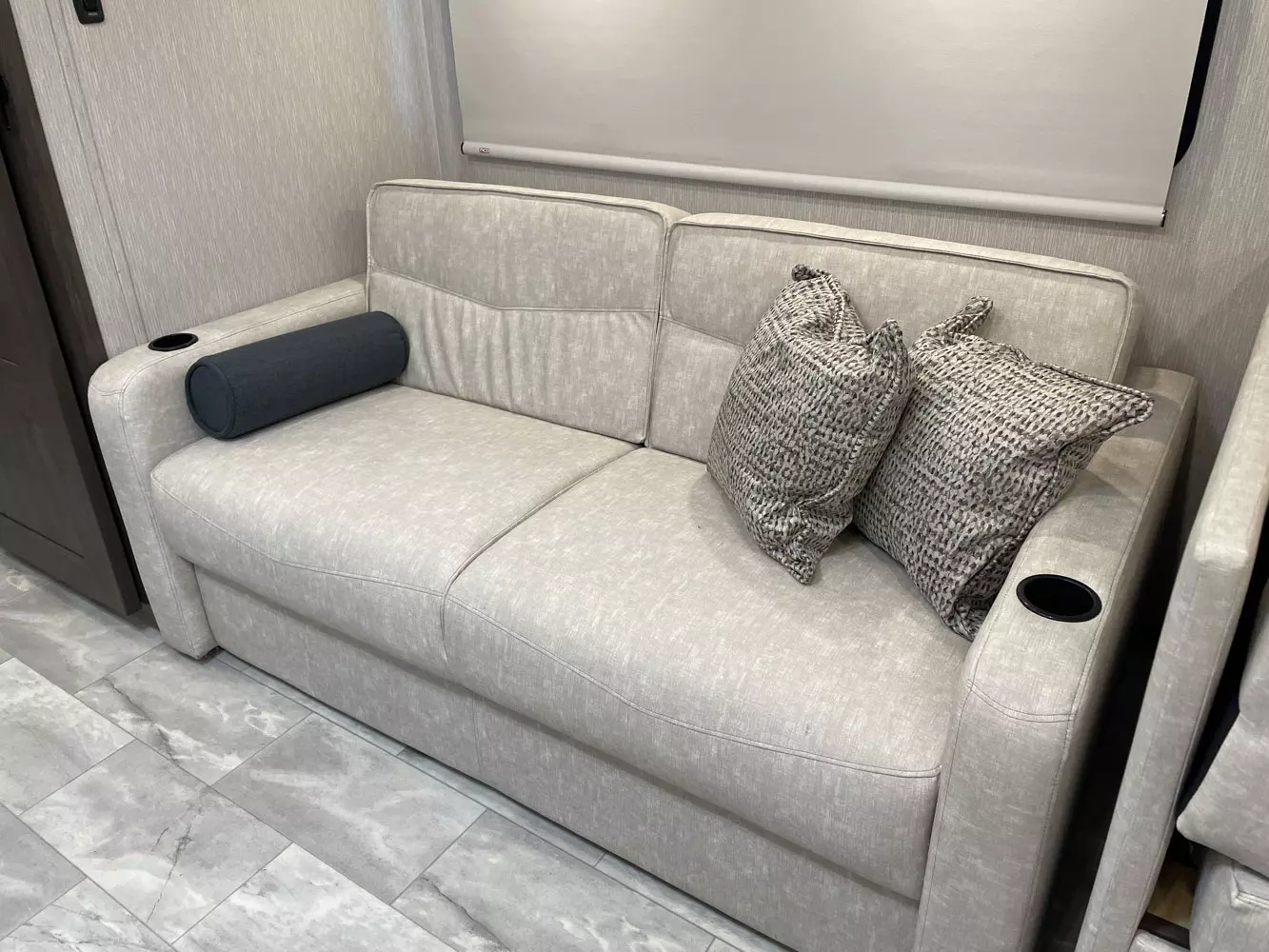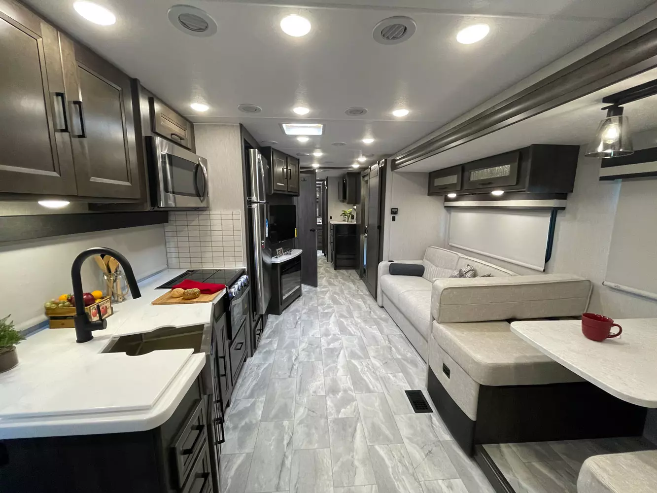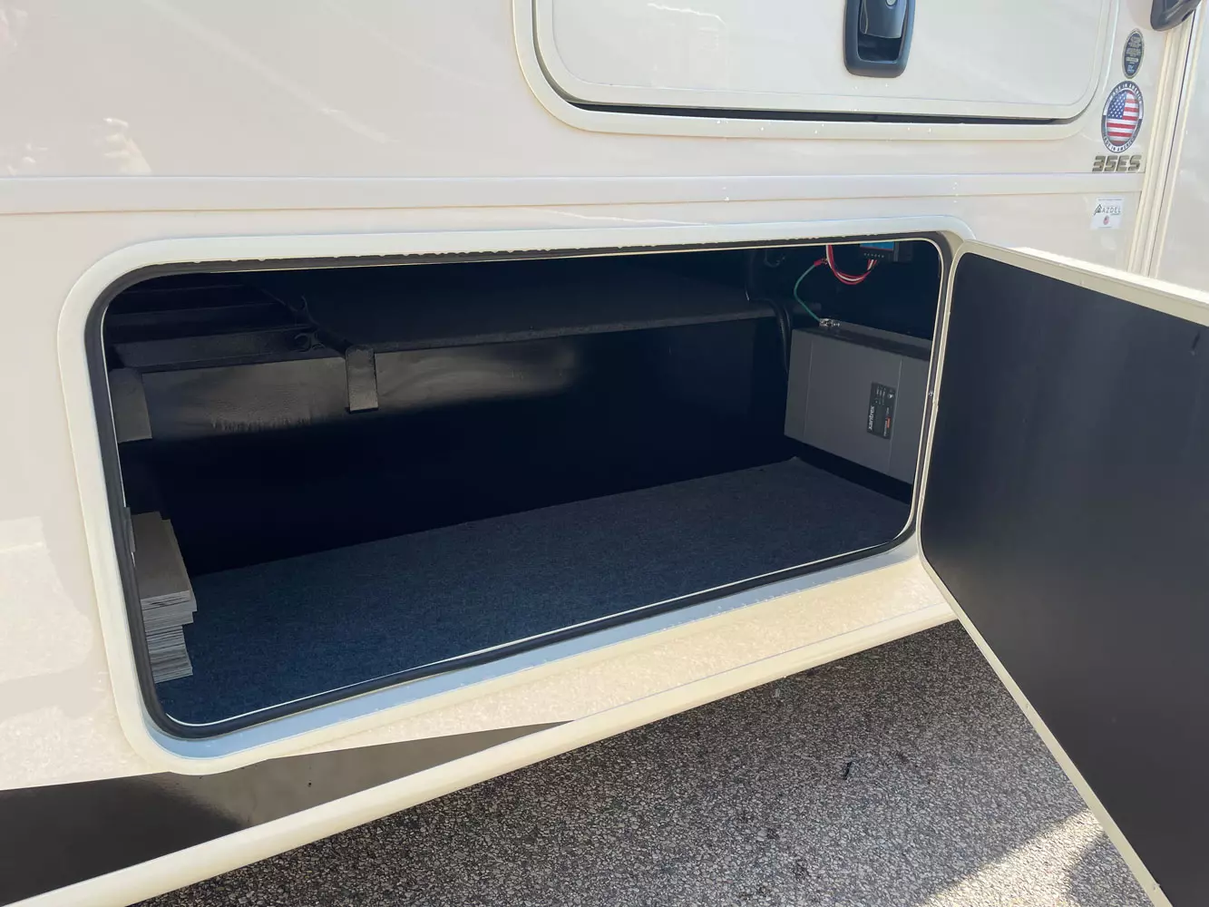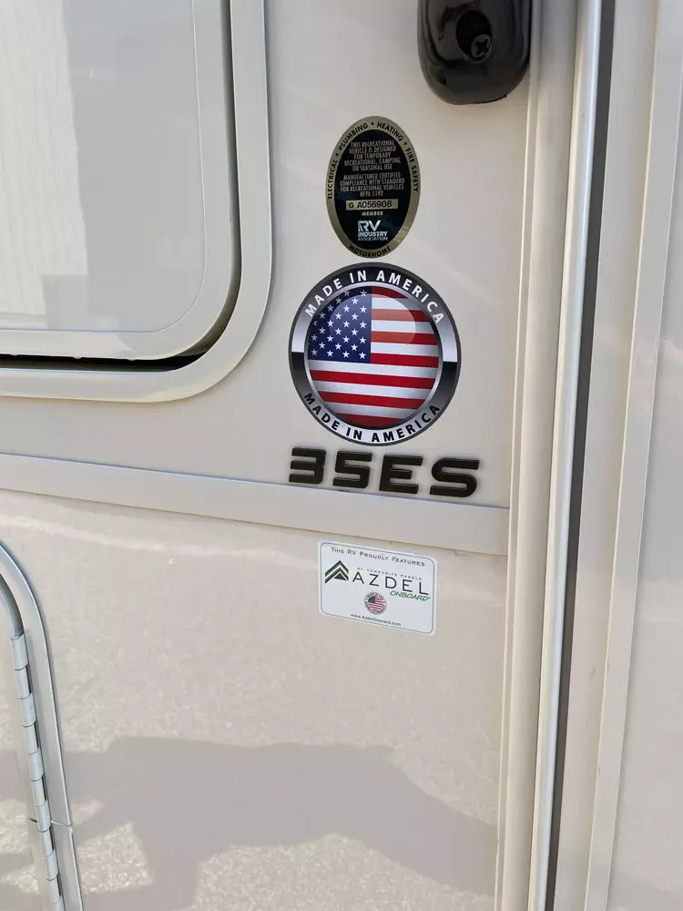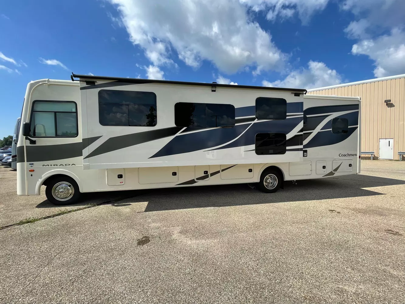 The Mirada 35ES has 2 slide outs located 1 on the off-door side and 1 door side; 1 entry door. Interior layout from front to back; front cockpit with drop down front bunk and computer work station on the door side; door side kitchen with farm sink near entry, microwave above stovetop and fridge; next to LED TV and fireplace; off-door side 42 inch by 70 inch dinette next to 68 inch sofa with bed; door side half bathroom with toilet and sink; off-door side bunk, office and wardrobe; rear bedroom with 72 inch by 76 inch foot facing king bed with overhead cabinet and CPAP station, off-door LED TV with storage and dresser and wardrobe and washer and dryer prep; rear second bathroom with door side 48 inch by 35 inch shower with toilet, sink and linen storage; Optional power theater seating. Exterior door side LED TV.