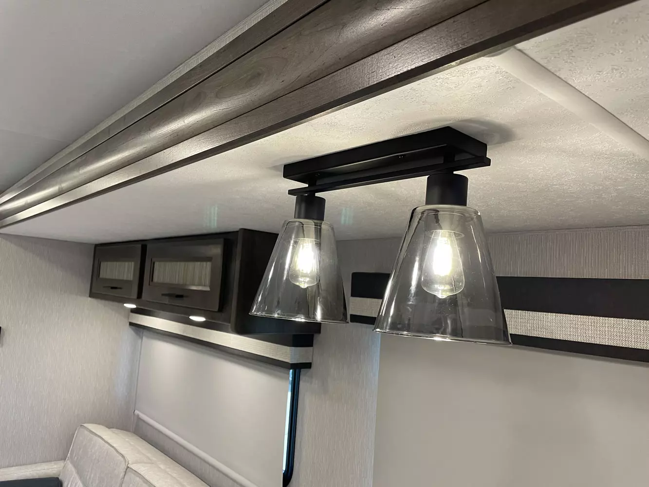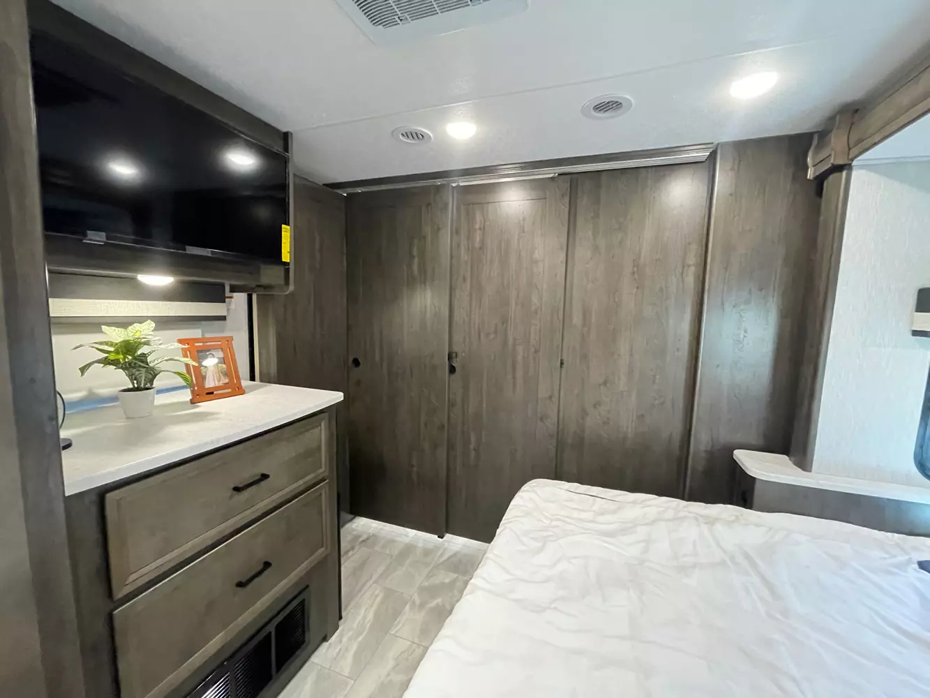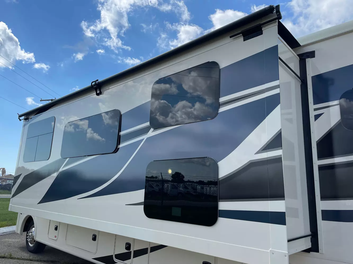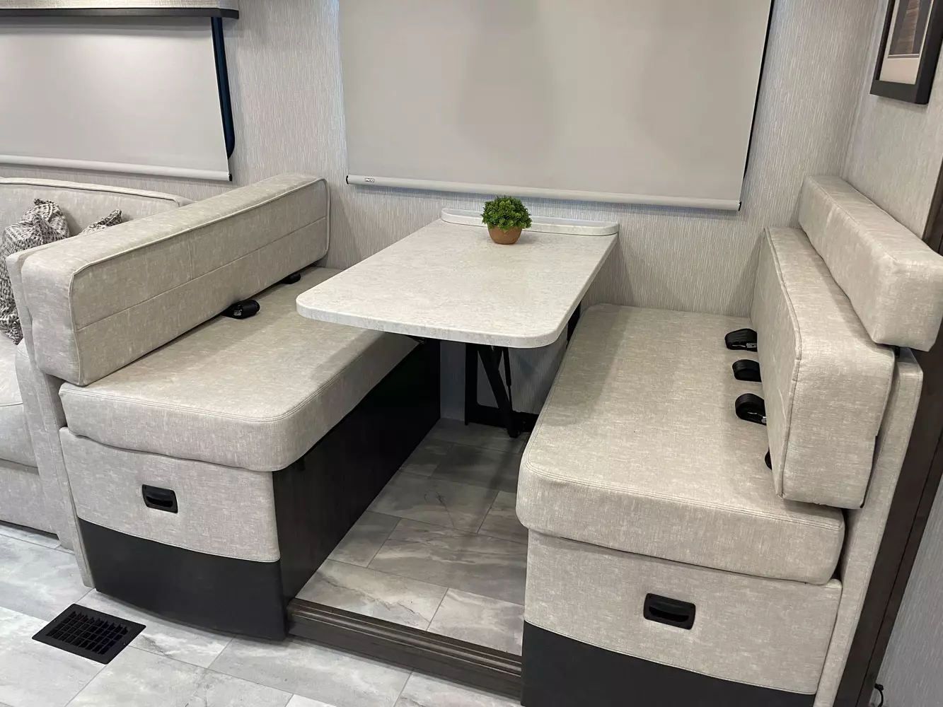 The Mirada 35ES has 2 slide outs located 1 on the off-door side and 1 door side; 1 entry door. Interior layout from front to back; front cockpit with drop down front bunk and computer work station on the door side; door side kitchen with farm sink near entry, microwave above stovetop and fridge; next to LED TV and fireplace; off-door side 42 inch by 70 inch dinette next to 68 inch sofa with bed; door side half bathroom with toilet and sink; off-door side bunk, office and wardrobe; rear bedroom with 72 inch by 76 inch foot facing king bed with overhead cabinet and CPAP station, off-door LED TV with storage and dresser and wardrobe and washer and dryer prep; rear second bathroom with door side 48 inch by 35 inch shower with toilet, sink and linen storage; Optional power theater seating. Exterior door side LED TV.