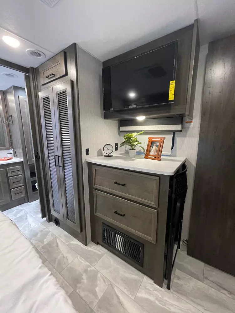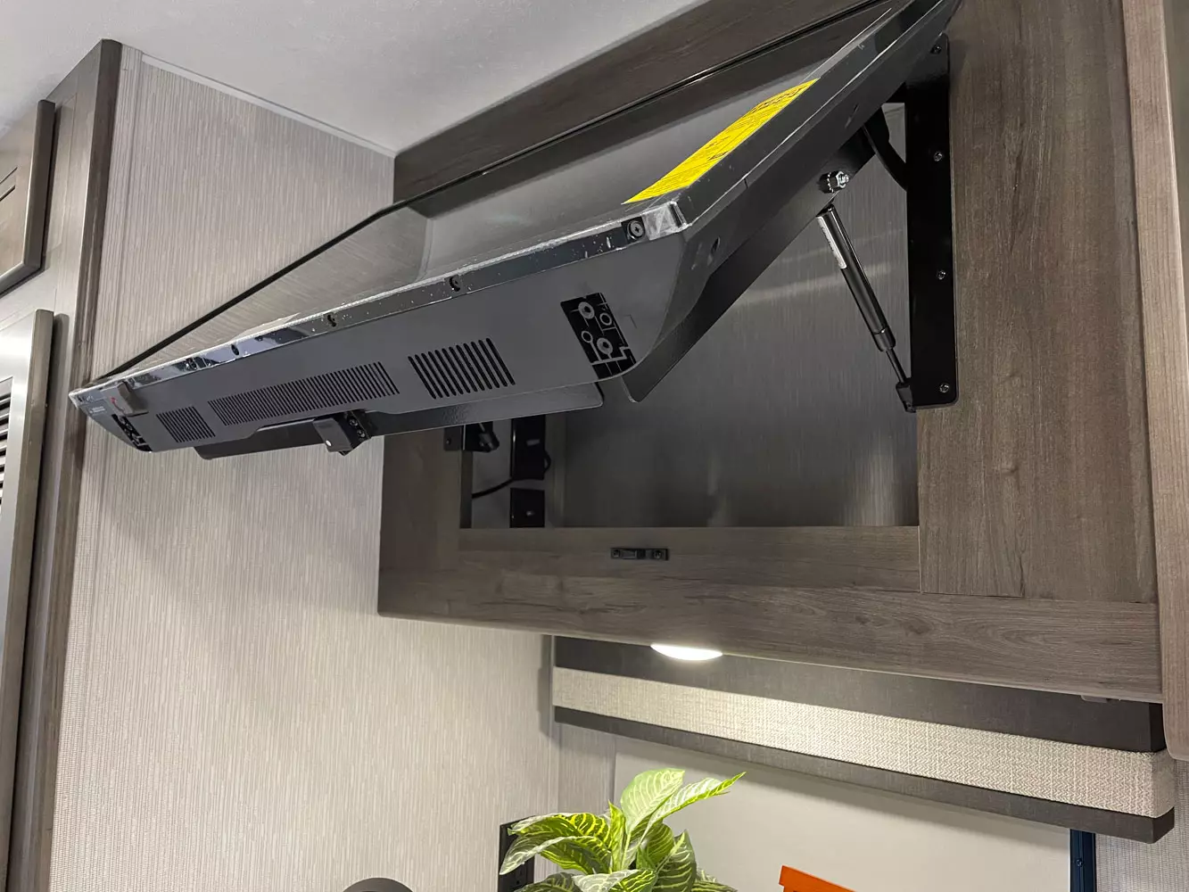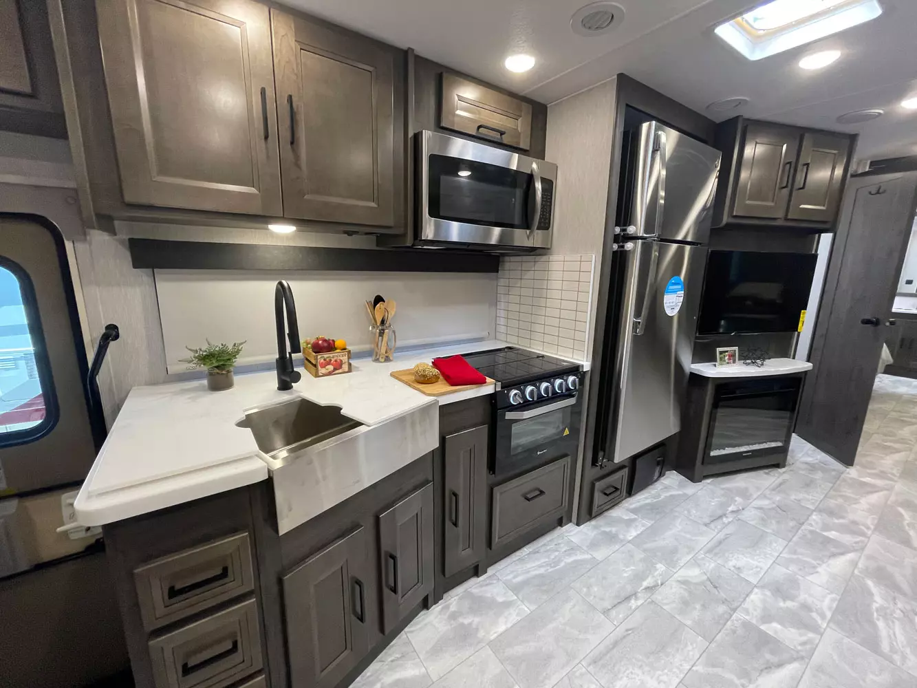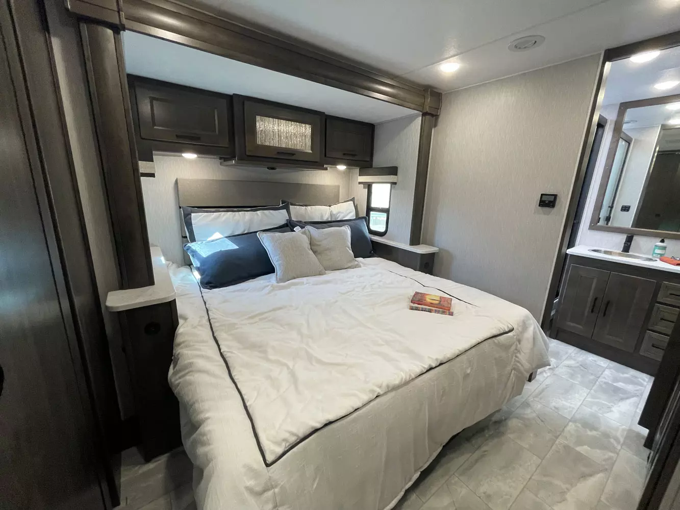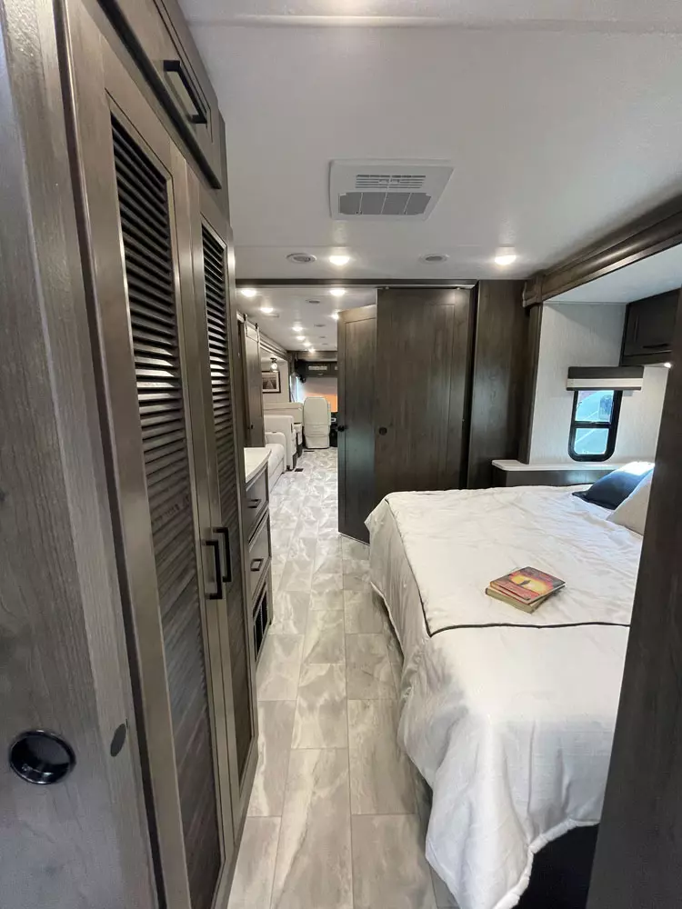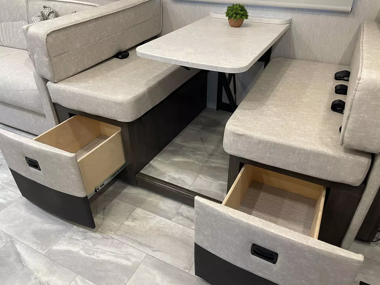 The Mirada 35ES has 2 slide outs located 1 on the off-door side and 1 door side; 1 entry door. Interior layout from front to back; front cockpit with drop down front bunk and computer work station on the door side; door side kitchen with farm sink near entry, microwave above stovetop and fridge; next to LED TV and fireplace; off-door side 42 inch by 70 inch dinette next to 68 inch sofa with bed; door side half bathroom with toilet and sink; off-door side bunk, office and wardrobe; rear bedroom with 72 inch by 76 inch foot facing king bed with overhead cabinet and CPAP station, off-door LED TV with storage and dresser and wardrobe and washer and dryer prep; rear second bathroom with door side 48 inch by 35 inch shower with toilet, sink and linen storage; Optional power theater seating. Exterior door side LED TV.