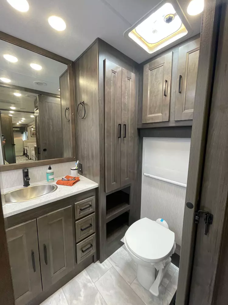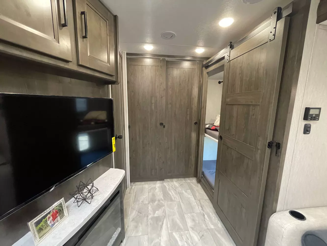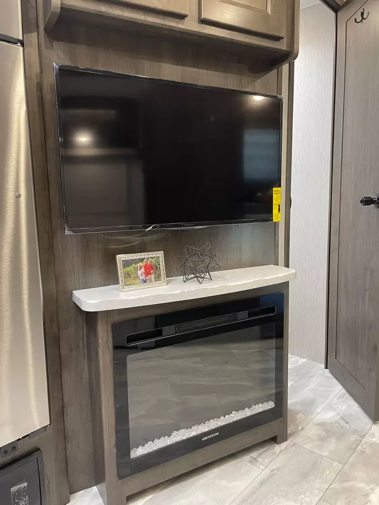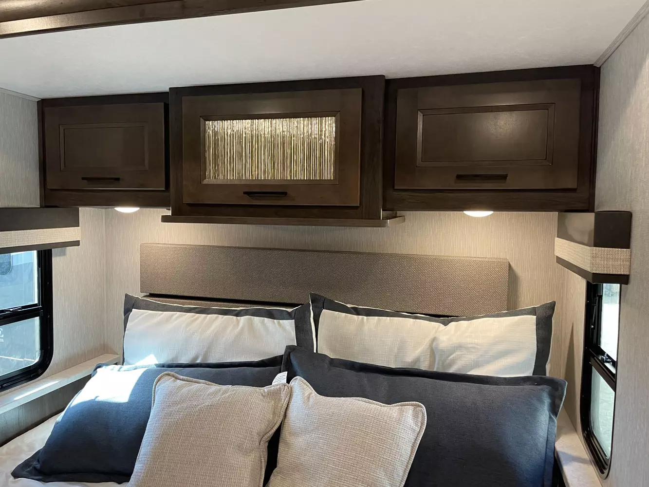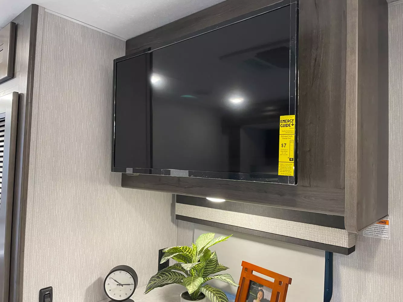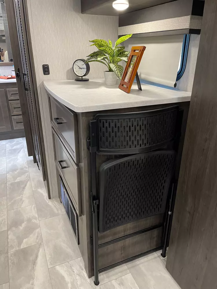 The Mirada 35ES has 2 slide outs located 1 on the off-door side and 1 door side; 1 entry door. Interior layout from front to back; front cockpit with drop down front bunk and computer work station on the door side; door side kitchen with farm sink near entry, microwave above stovetop and fridge; next to LED TV and fireplace; off-door side 42 inch by 70 inch dinette next to 68 inch sofa with bed; door side half bathroom with toilet and sink; off-door side bunk, office and wardrobe; rear bedroom with 72 inch by 76 inch foot facing king bed with overhead cabinet and CPAP station, off-door LED TV with storage and dresser and wardrobe and washer and dryer prep; rear second bathroom with door side 48 inch by 35 inch shower with toilet, sink and linen storage; Optional power theater seating. Exterior door side LED TV.