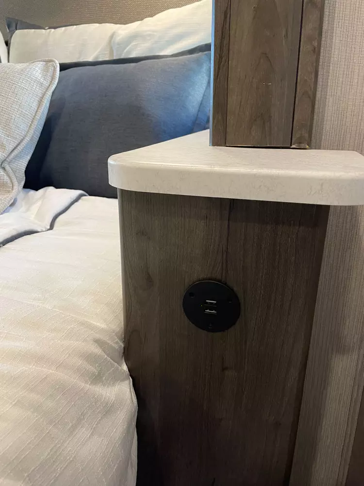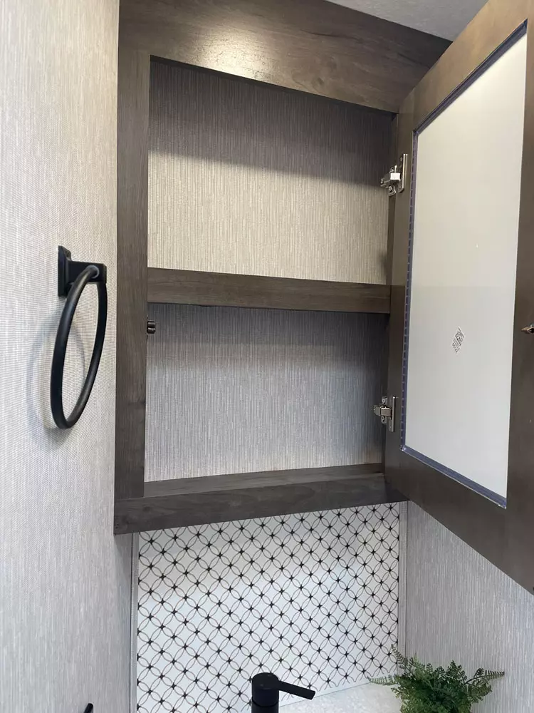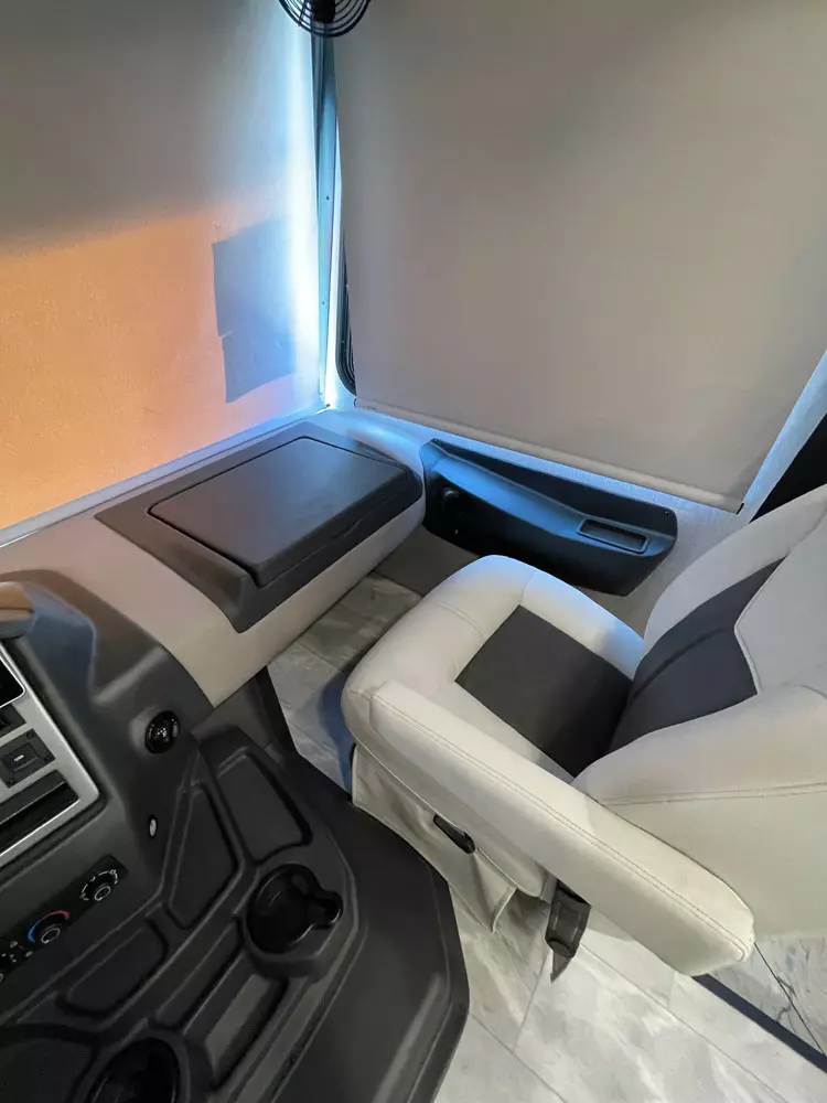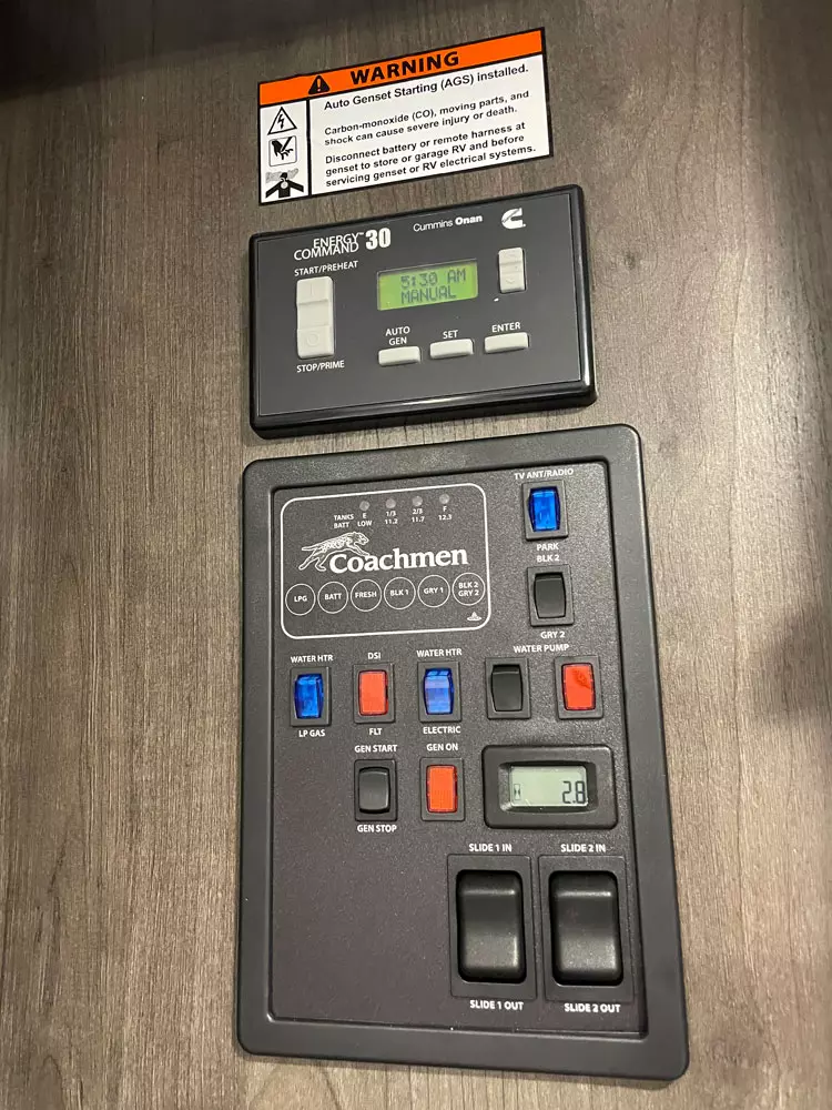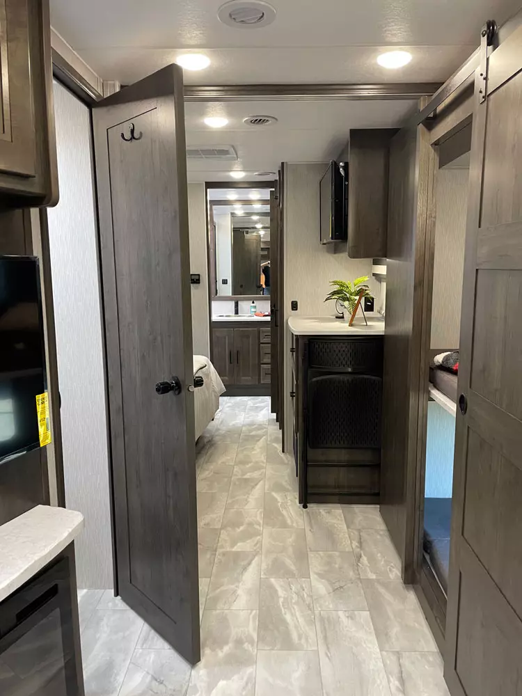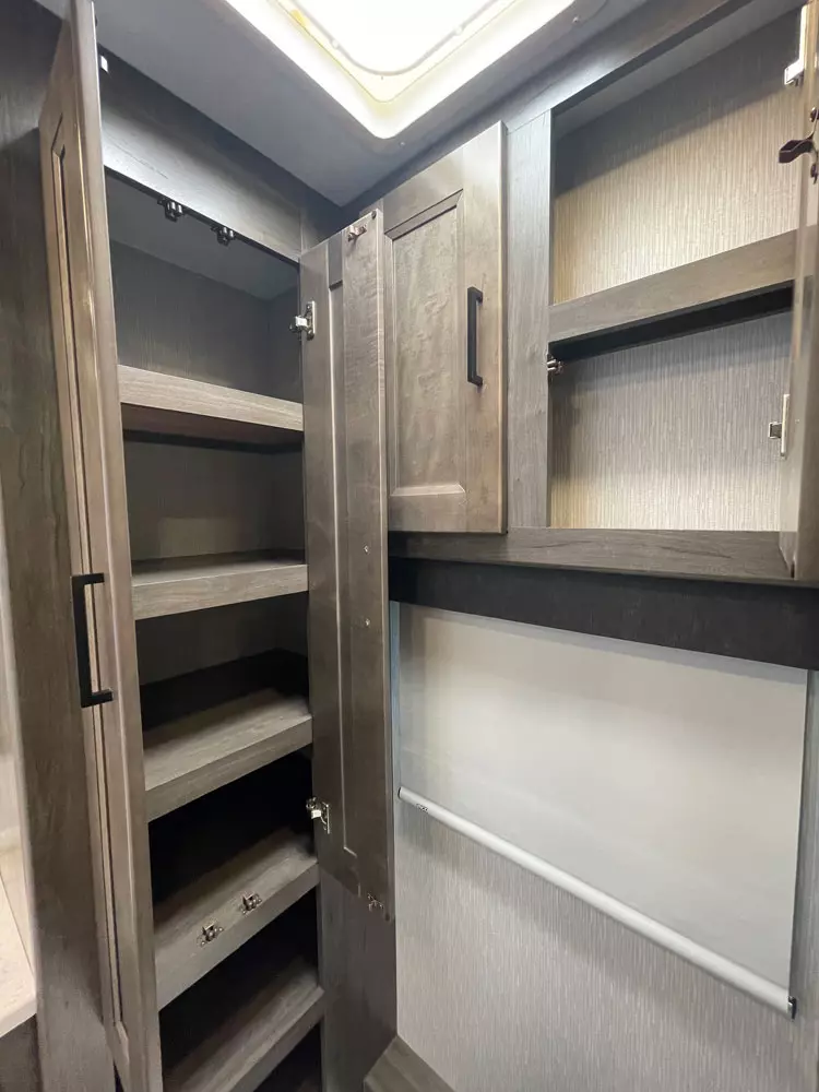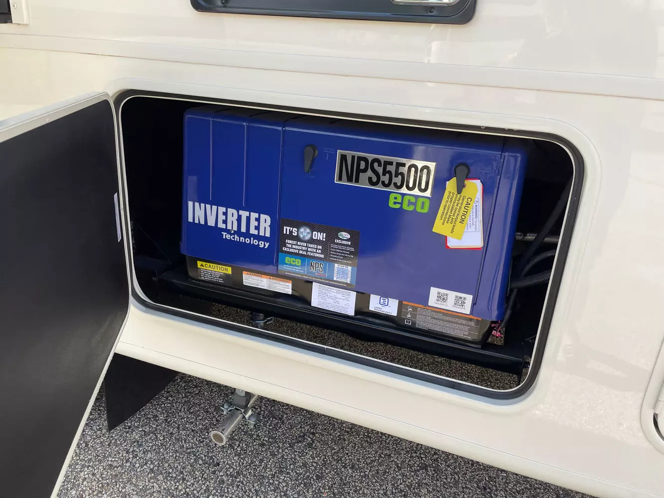 The Mirada 35ES has 2 slide outs located 1 on the off-door side and 1 door side; 1 entry door. Interior layout from front to back; front cockpit with drop down front bunk and computer work station on the door side; door side kitchen with farm sink near entry, microwave above stovetop and fridge; next to LED TV and fireplace; off-door side 42 inch by 70 inch dinette next to 68 inch sofa with bed; door side half bathroom with toilet and sink; off-door side bunk, office and wardrobe; rear bedroom with 72 inch by 76 inch foot facing king bed with overhead cabinet and CPAP station, off-door LED TV with storage and dresser and wardrobe and washer and dryer prep; rear second bathroom with door side 48 inch by 35 inch shower with toilet, sink and linen storage; Optional power theater seating. Exterior door side LED TV.