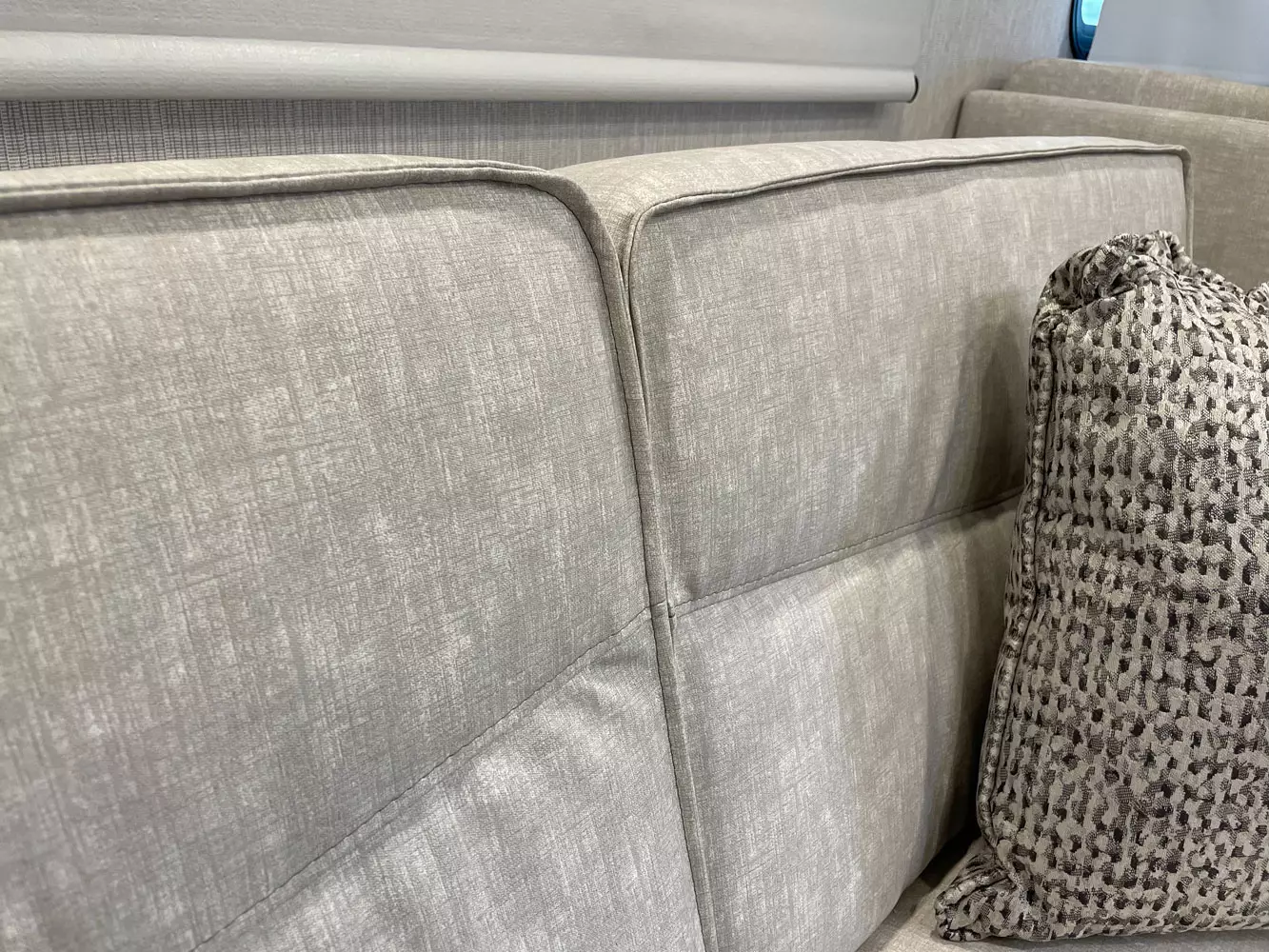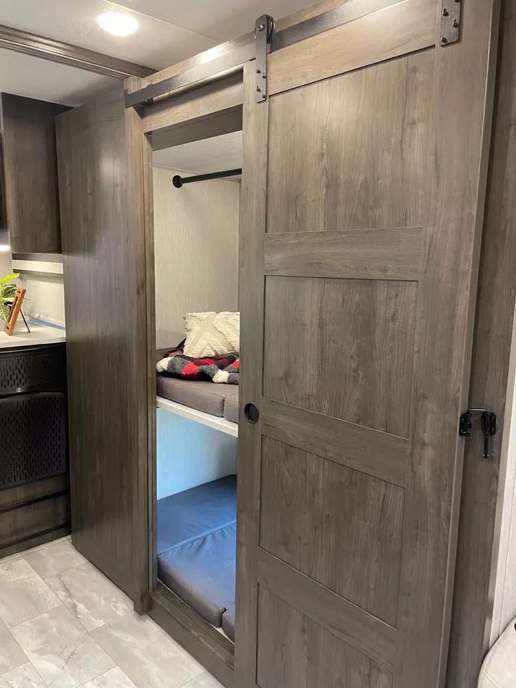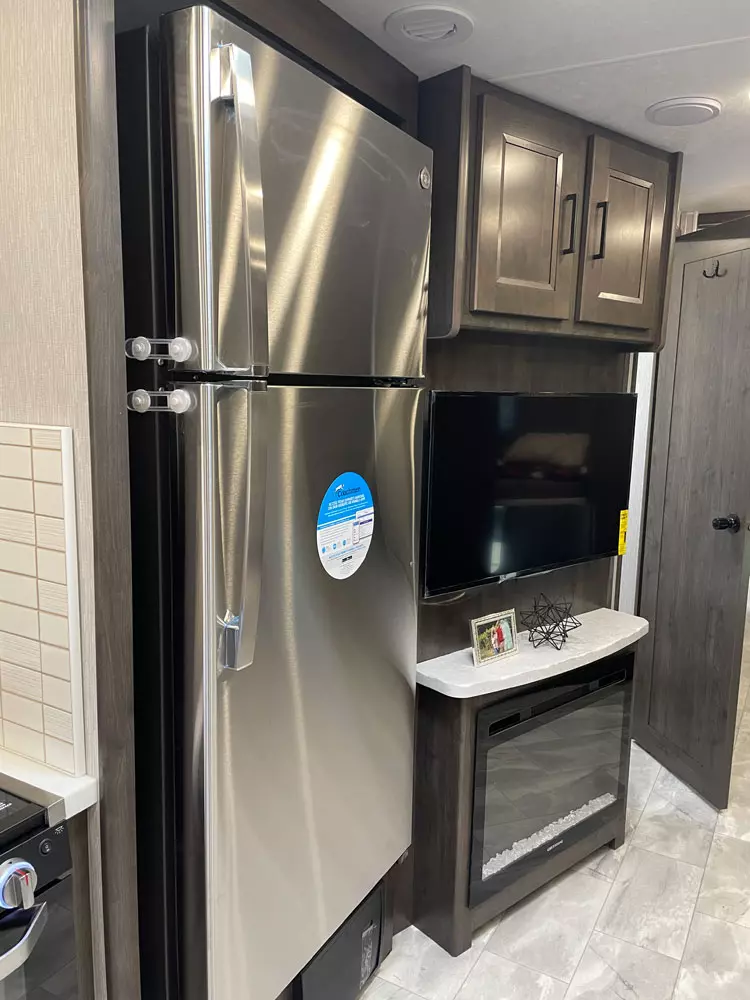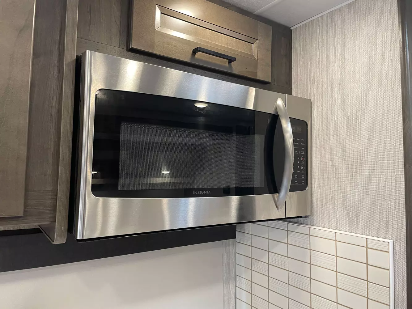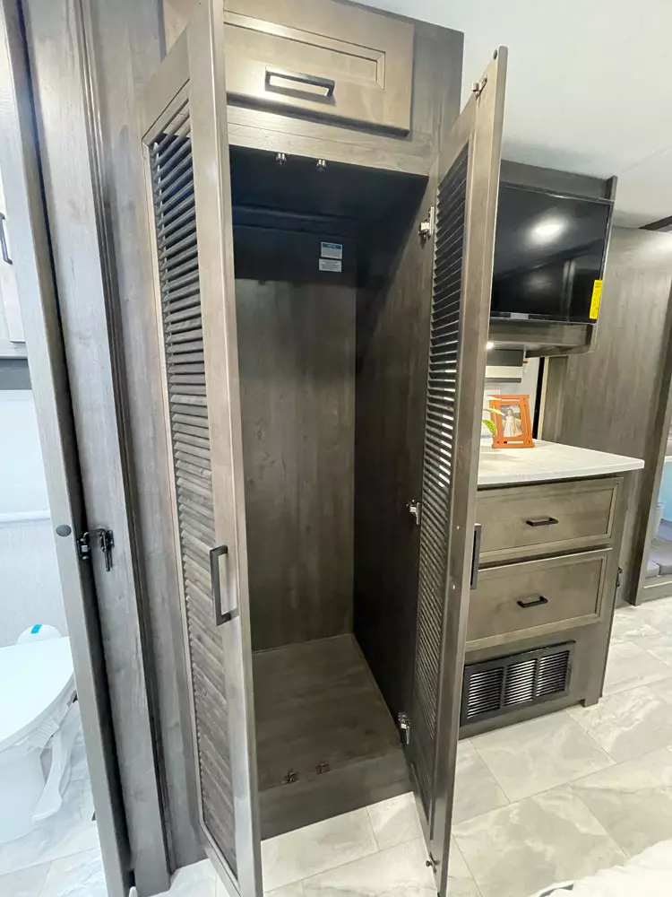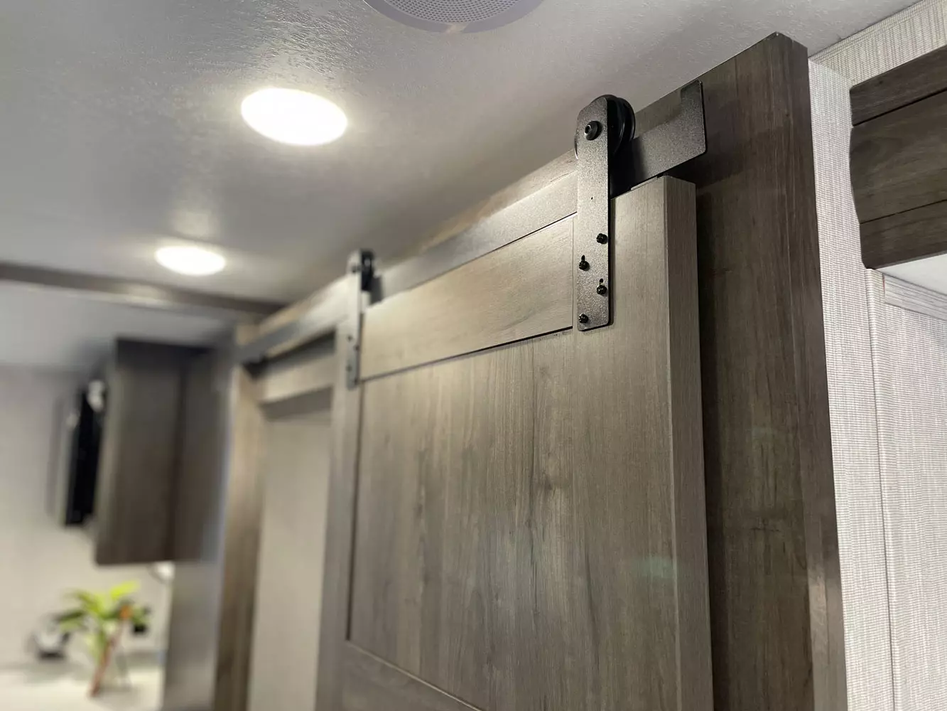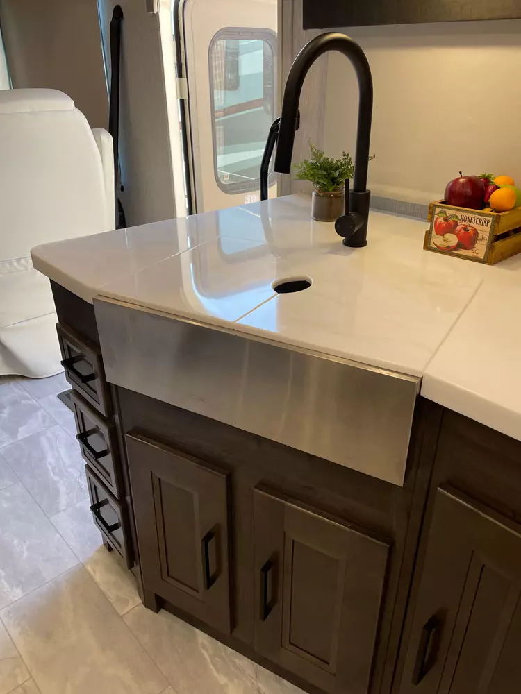 The Mirada 35ES has 2 slide outs located 1 on the off-door side and 1 door side; 1 entry door. Interior layout from front to back; front cockpit with drop down front bunk and computer work station on the door side; door side kitchen with farm sink near entry, microwave above stovetop and fridge; next to LED TV and fireplace; off-door side 42 inch by 70 inch dinette next to 68 inch sofa with bed; door side half bathroom with toilet and sink; off-door side bunk, office and wardrobe; rear bedroom with 72 inch by 76 inch foot facing king bed with overhead cabinet and CPAP station, off-door LED TV with storage and dresser and wardrobe and washer and dryer prep; rear second bathroom with door side 48 inch by 35 inch shower with toilet, sink and linen storage; Optional power theater seating. Exterior door side LED TV.