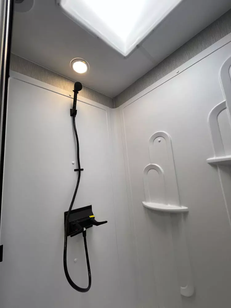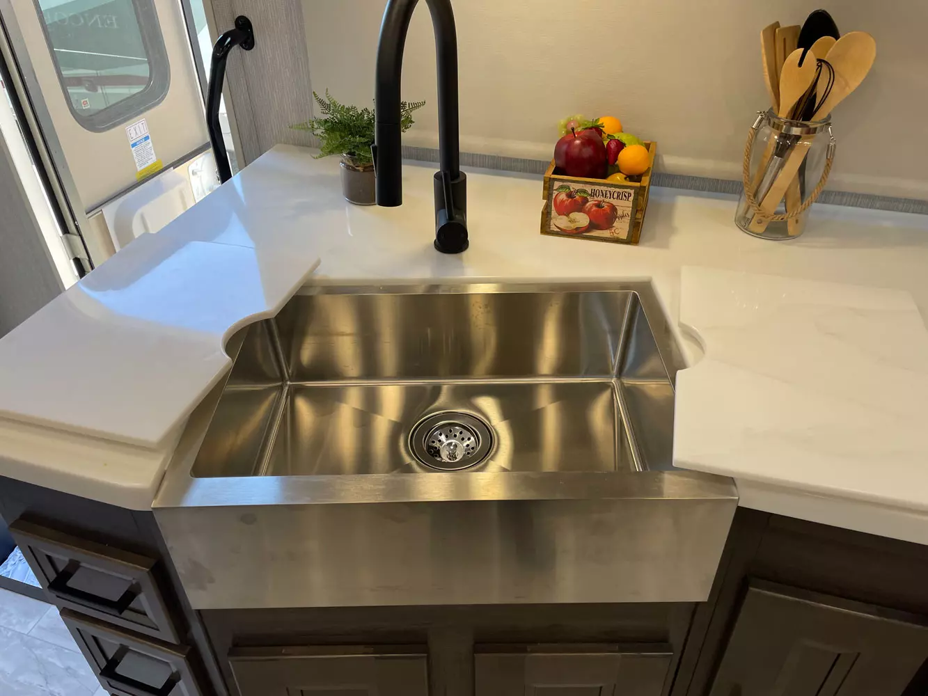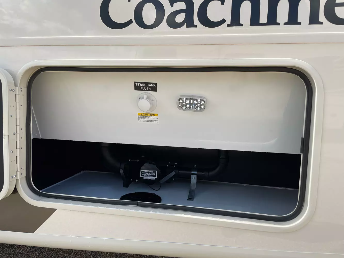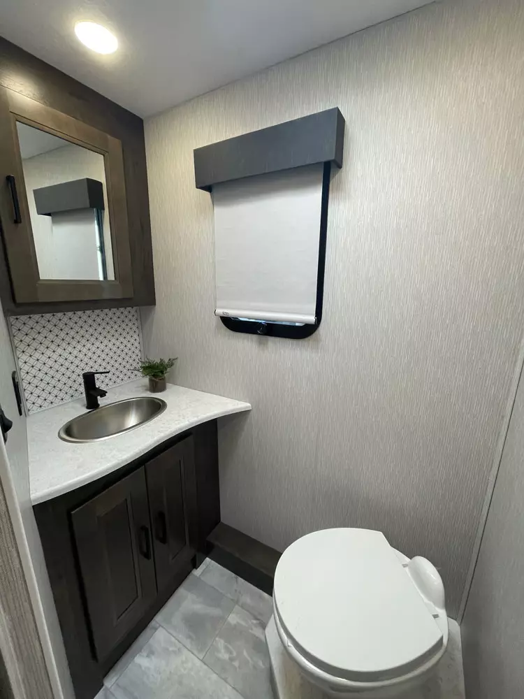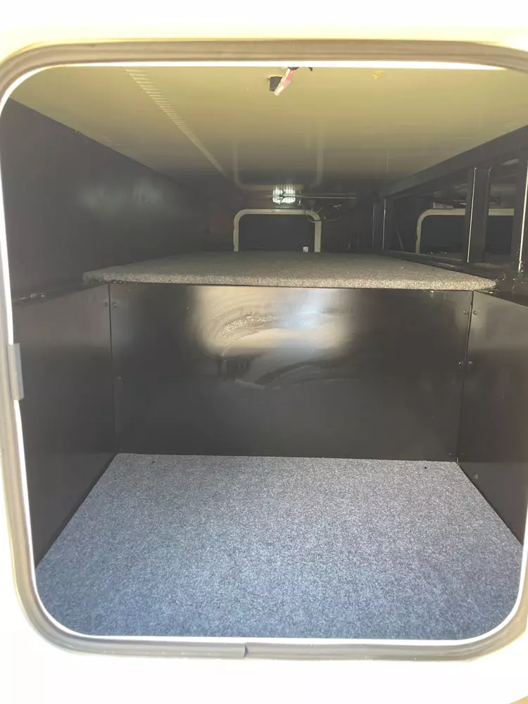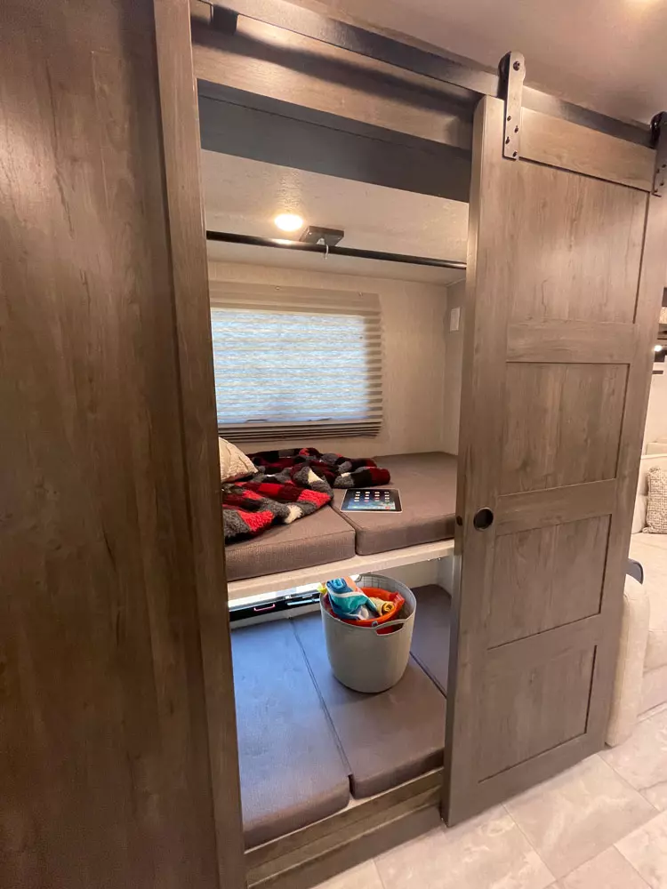 The Mirada 35ES has 2 slide outs located 1 on the off-door side and 1 door side; 1 entry door. Interior layout from front to back; front cockpit with drop down front bunk and computer work station on the door side; door side kitchen with farm sink near entry, microwave above stovetop and fridge; next to LED TV and fireplace; off-door side 42 inch by 70 inch dinette next to 68 inch sofa with bed; door side half bathroom with toilet and sink; off-door side bunk, office and wardrobe; rear bedroom with 72 inch by 76 inch foot facing king bed with overhead cabinet and CPAP station, off-door LED TV with storage and dresser and wardrobe and washer and dryer prep; rear second bathroom with door side 48 inch by 35 inch shower with toilet, sink and linen storage; Optional power theater seating. Exterior door side LED TV.