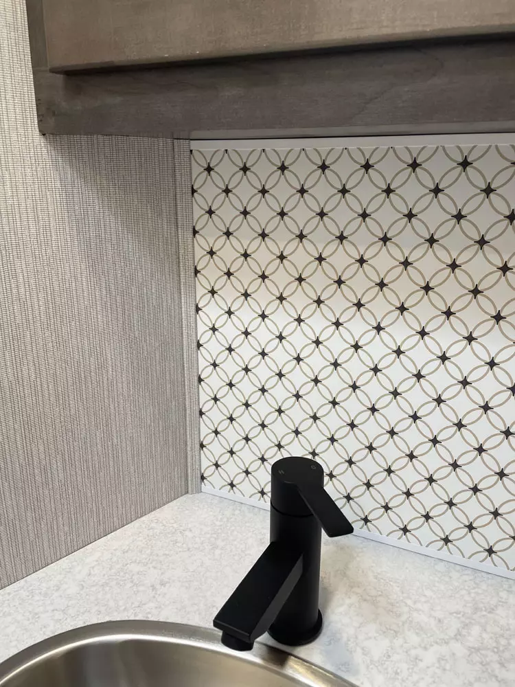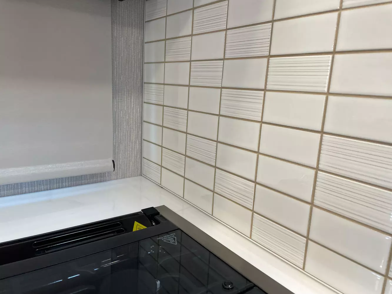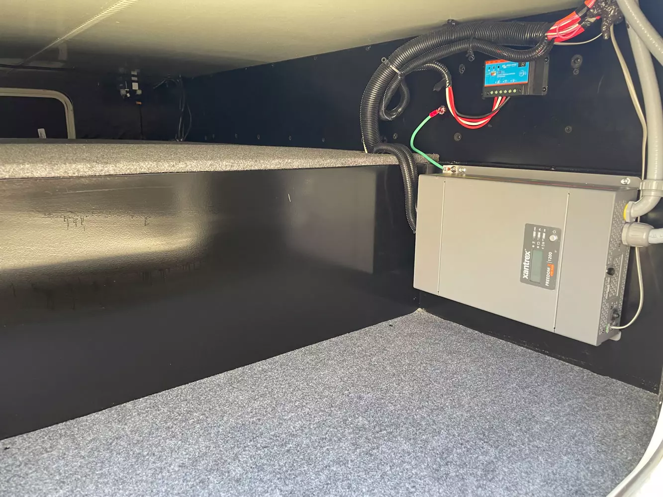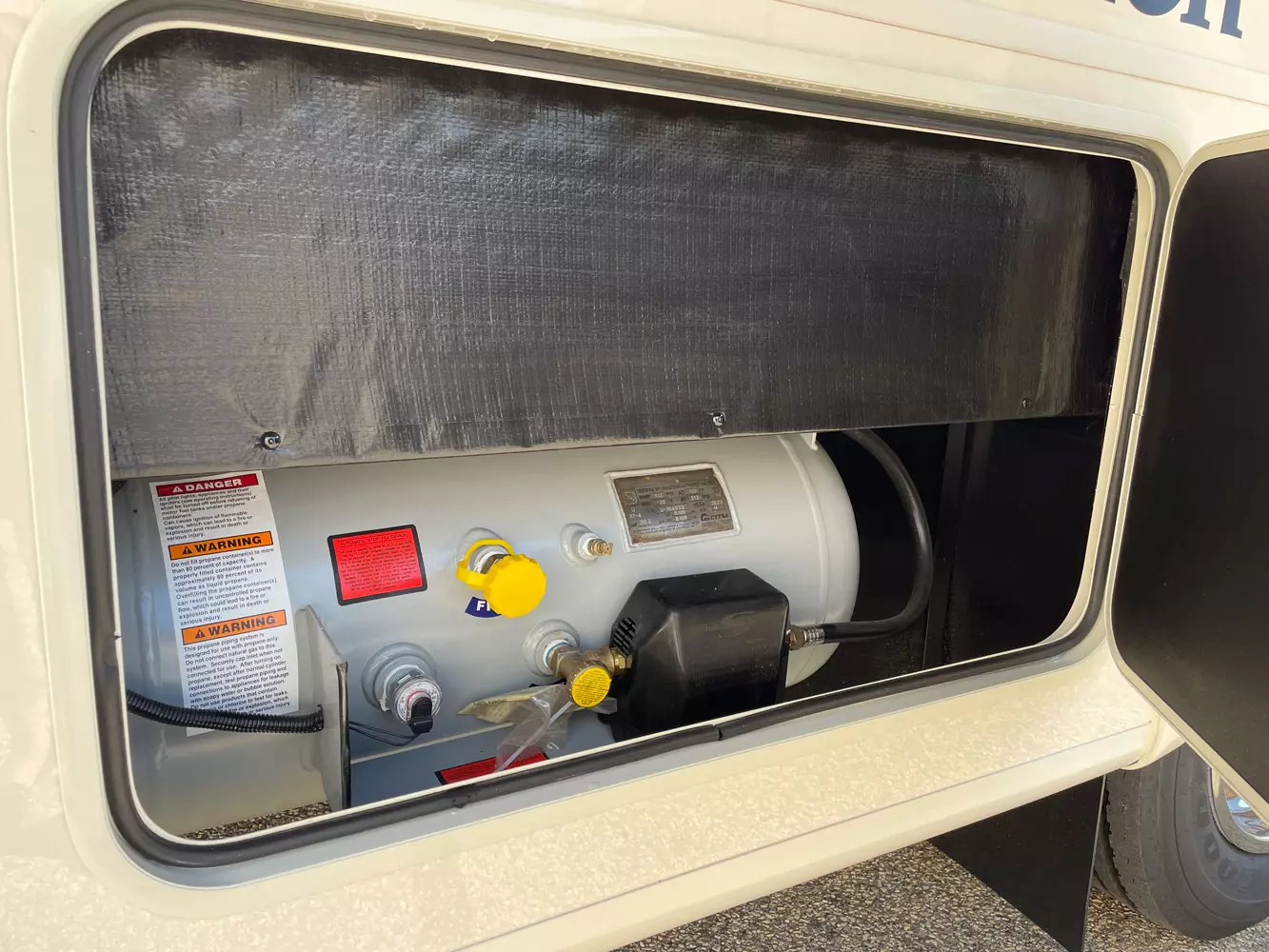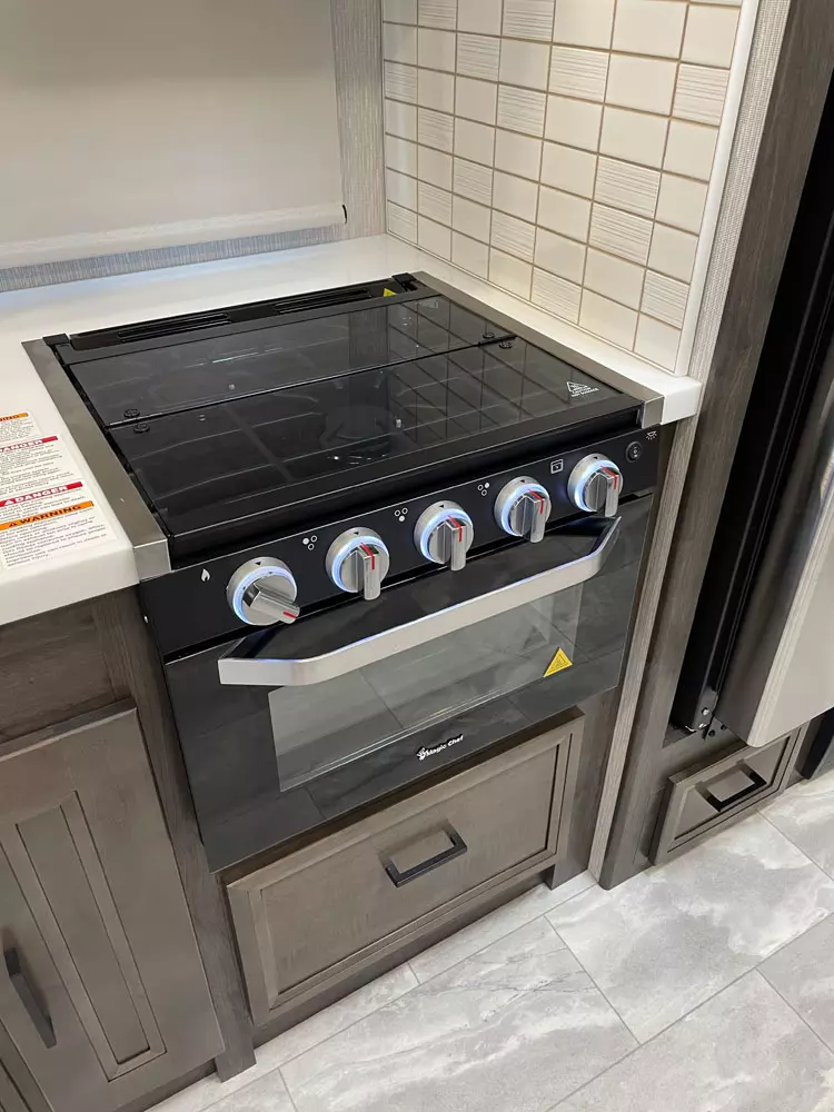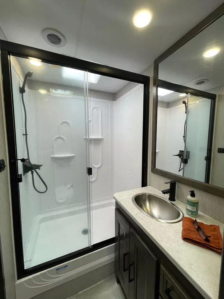 The Mirada 35ES has 2 slide outs located 1 on the off-door side and 1 door side; 1 entry door. Interior layout from front to back; front cockpit with drop down front bunk and computer work station on the door side; door side kitchen with farm sink near entry, microwave above stovetop and fridge; next to LED TV and fireplace; off-door side 42 inch by 70 inch dinette next to 68 inch sofa with bed; door side half bathroom with toilet and sink; off-door side bunk, office and wardrobe; rear bedroom with 72 inch by 76 inch foot facing king bed with overhead cabinet and CPAP station, off-door LED TV with storage and dresser and wardrobe and washer and dryer prep; rear second bathroom with door side 48 inch by 35 inch shower with toilet, sink and linen storage; Optional power theater seating. Exterior door side LED TV.