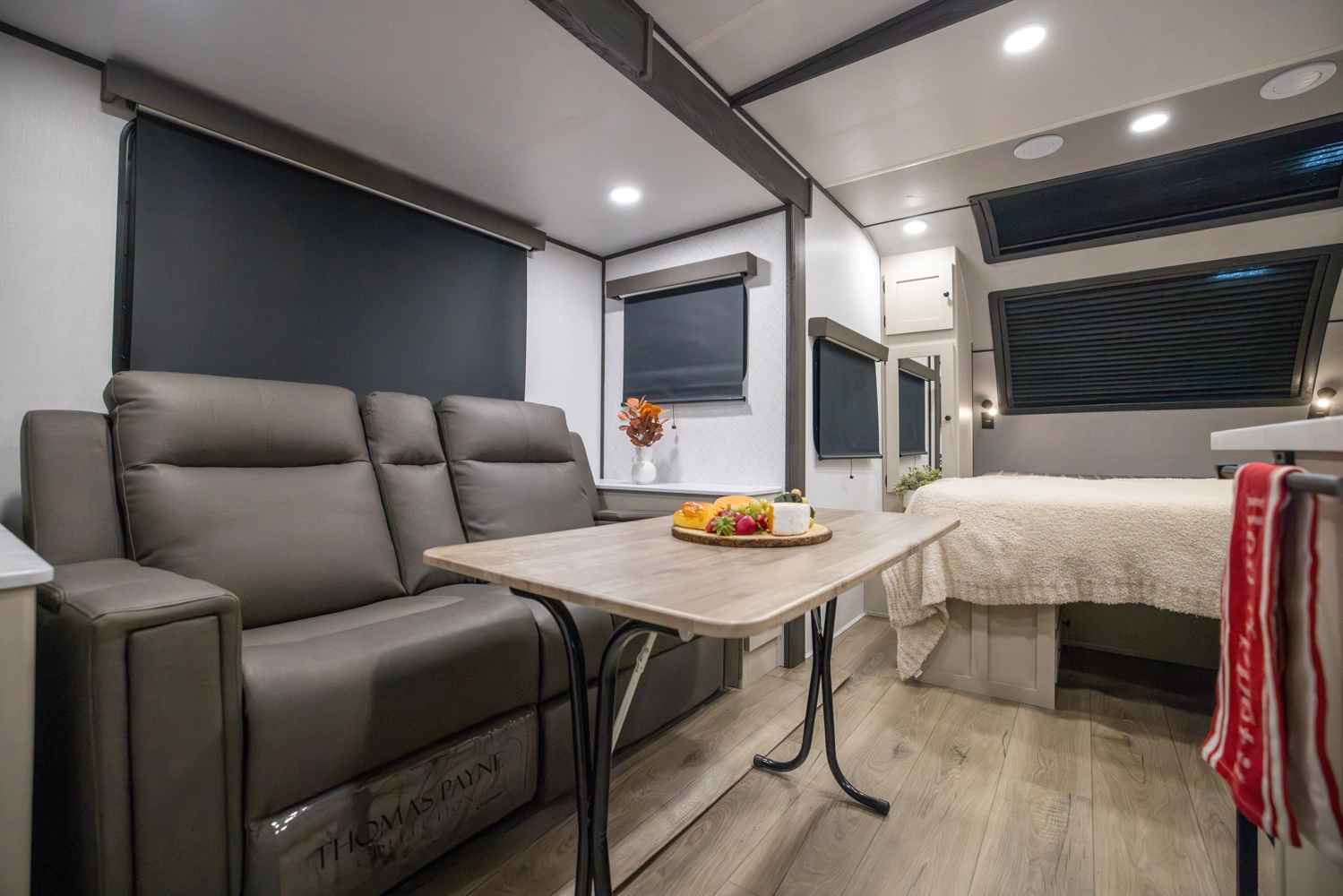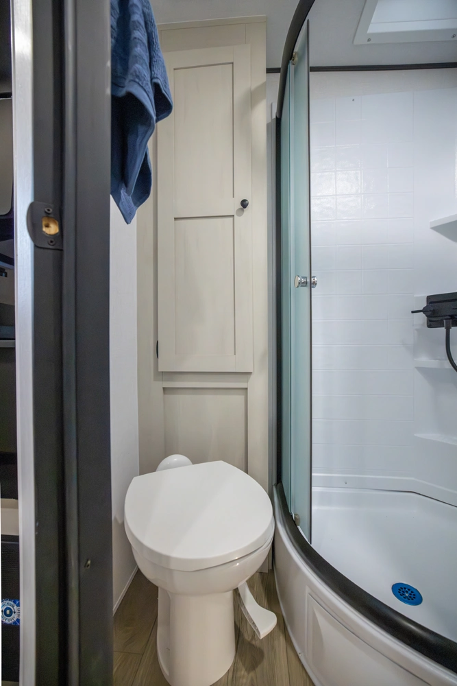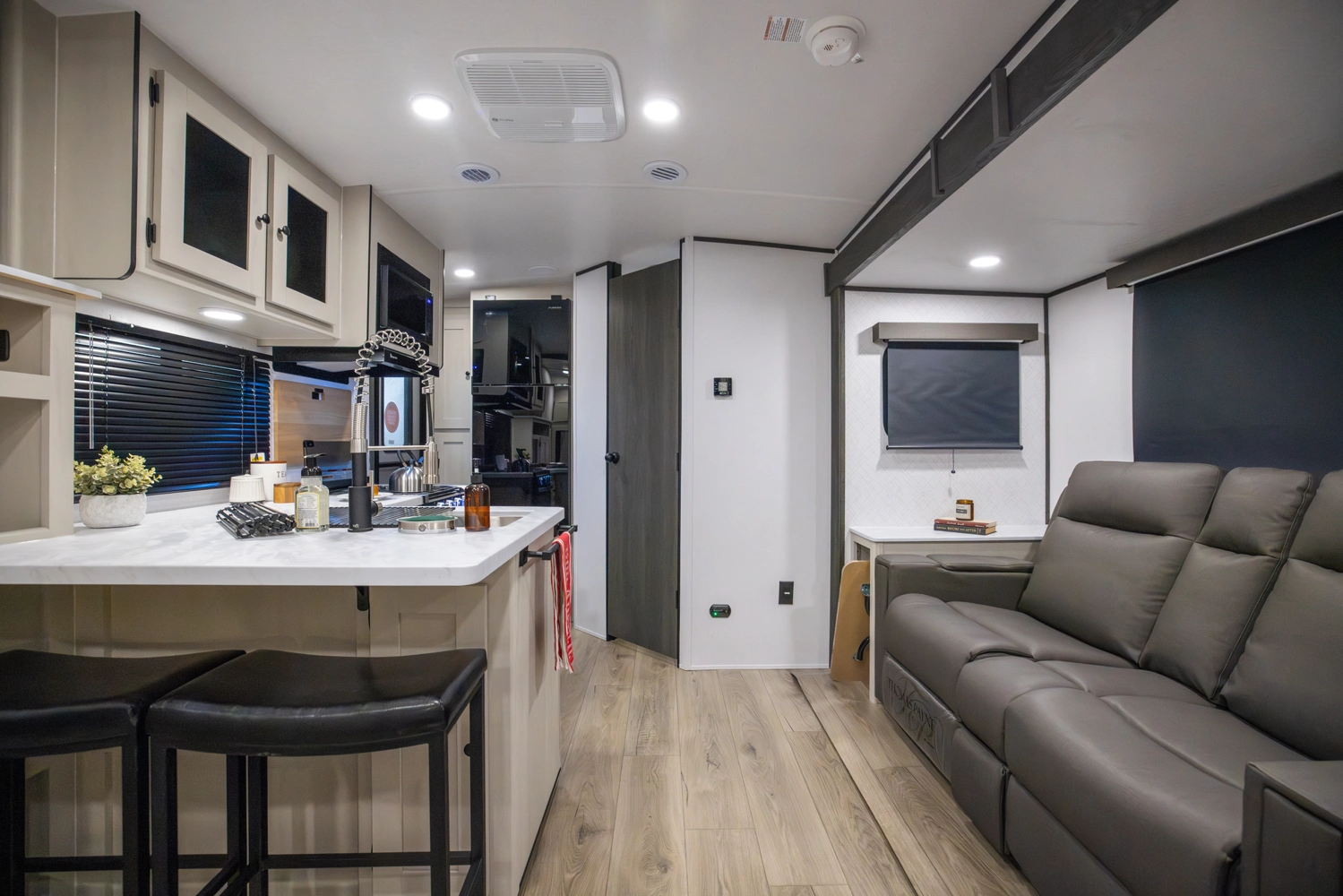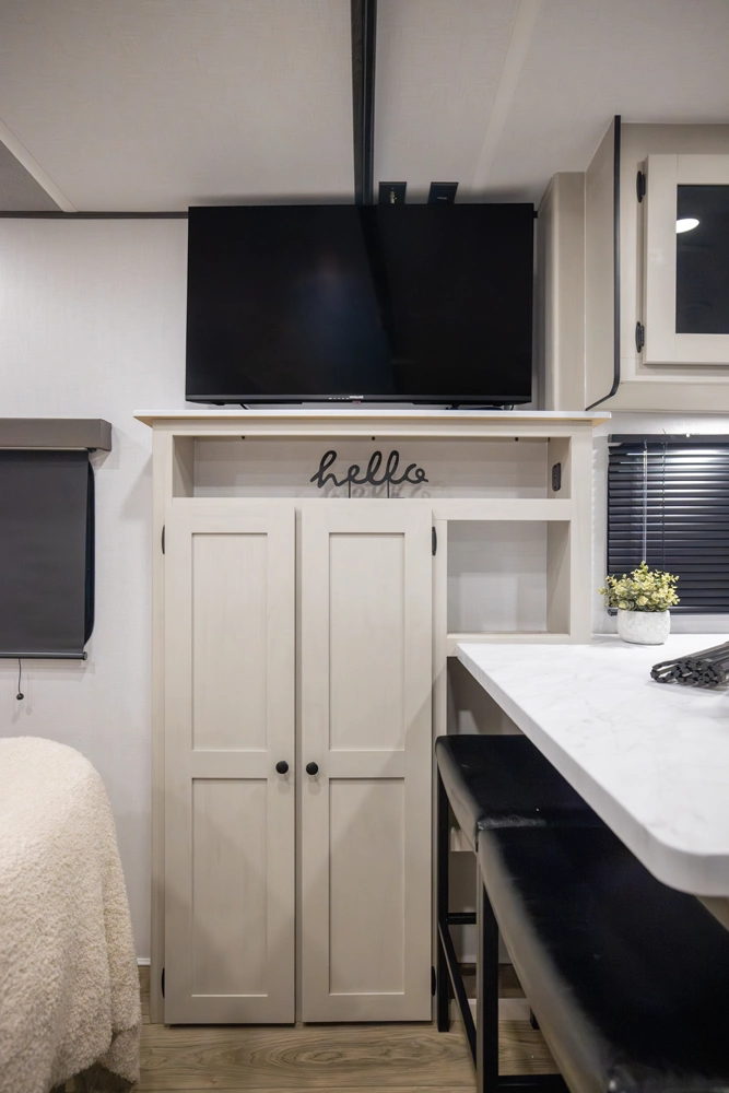 The perfect couple’s floorplan features a rear bathroom, L-Shaped kitchen counter top, an entertainment center with a sofa or theater seating, and our famous Max Bed Storage!