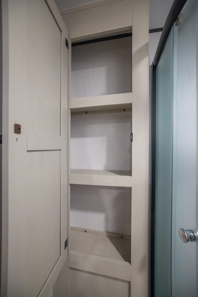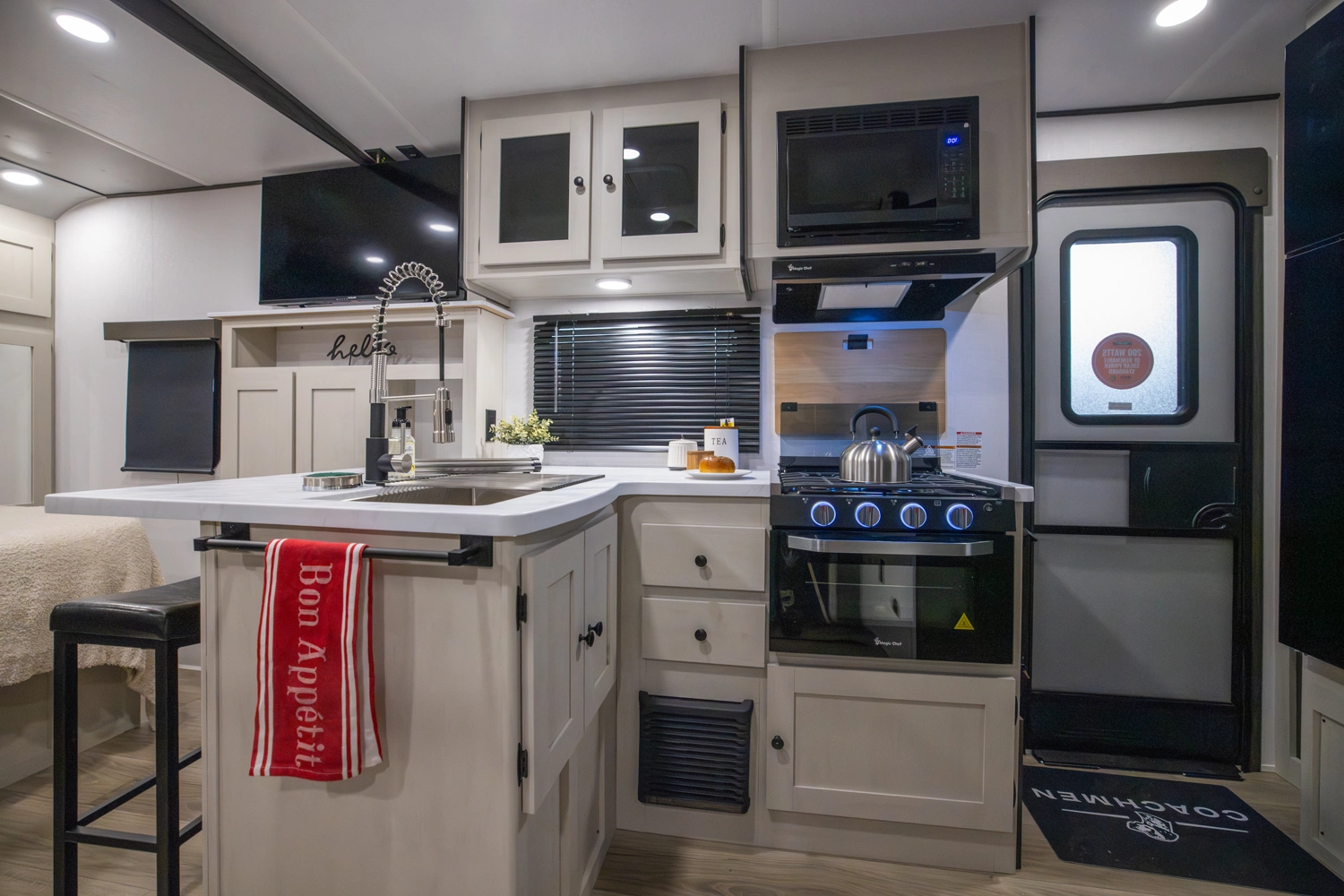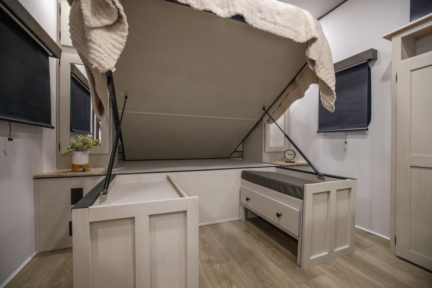 The perfect couple’s floorplan features a rear bathroom, L-Shaped kitchen counter top, an entertainment center with a sofa or theater seating, and our famous Max Bed Storage!