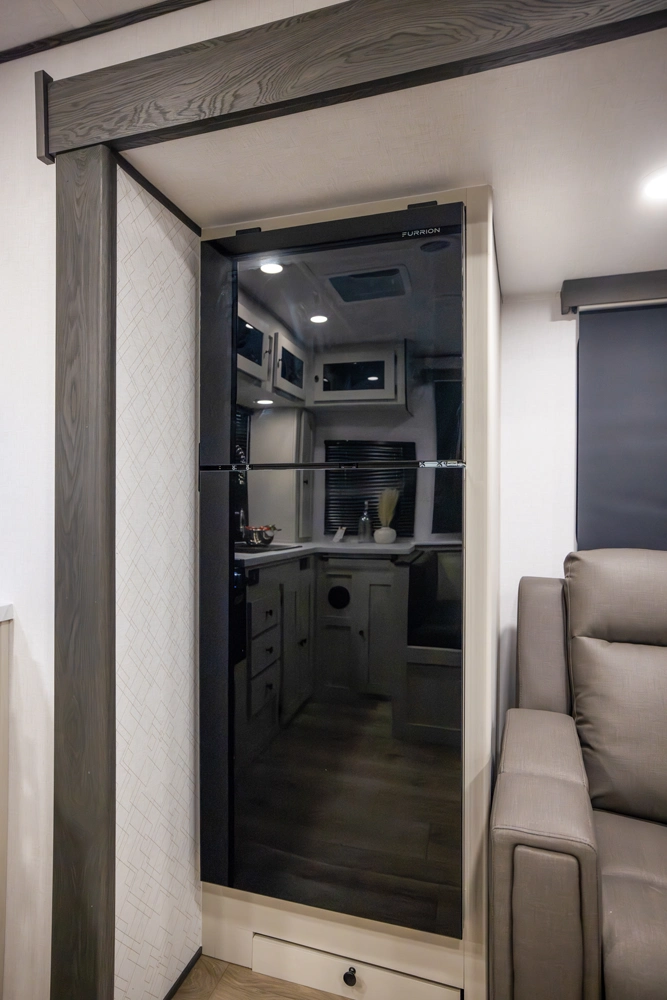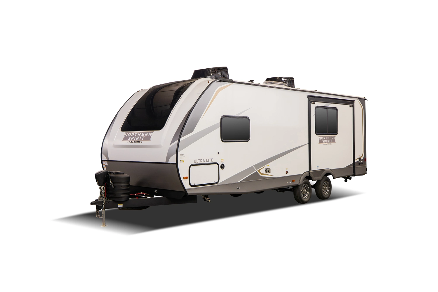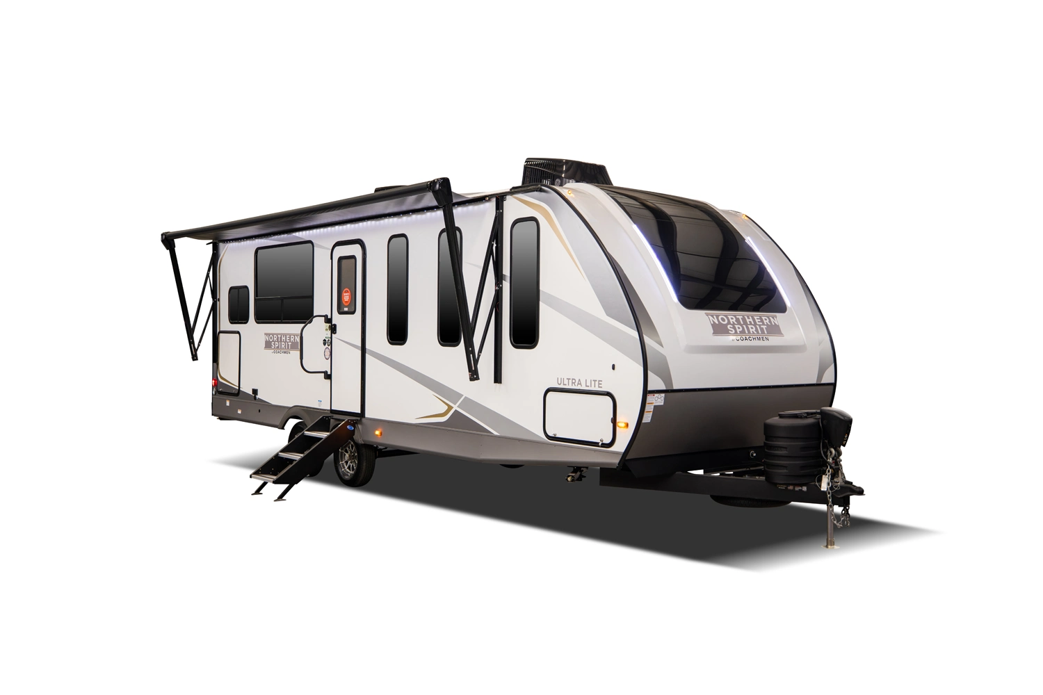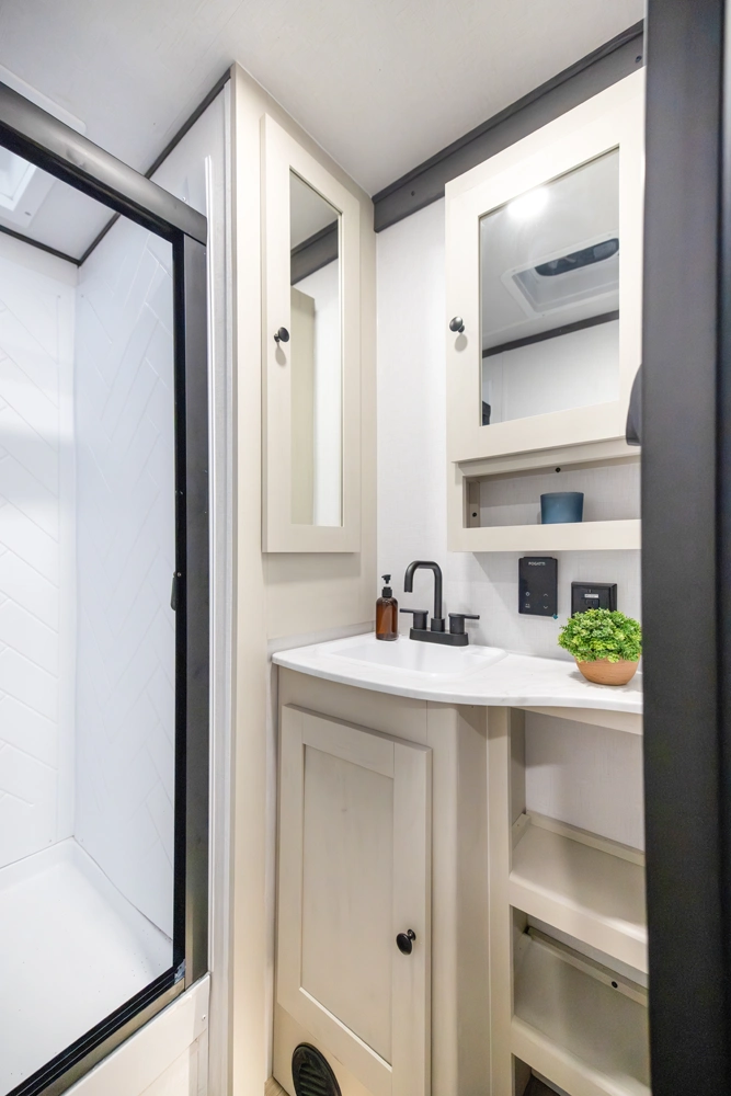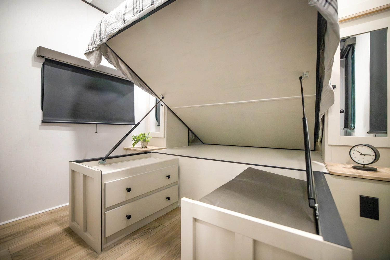 This couples coach comes in under 30 feet and right at 6000 lb. The living space includes a 50” TV on a televator directly across from your seating area. Tons of counter space, a floor to ceiling pantry, booth dinette, and an abundance of windows on the camp side make this a very popular couples coach.