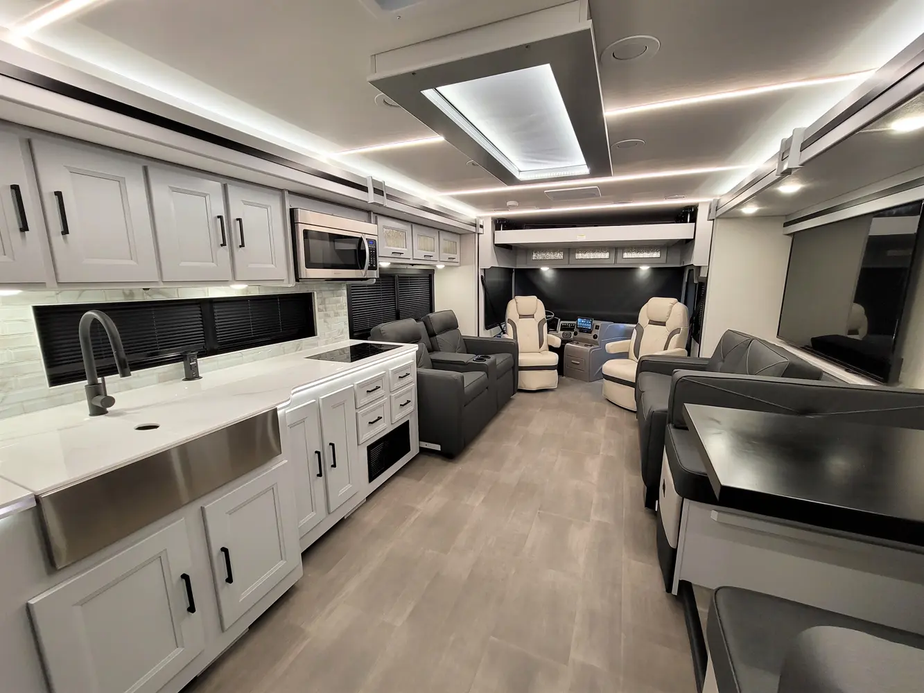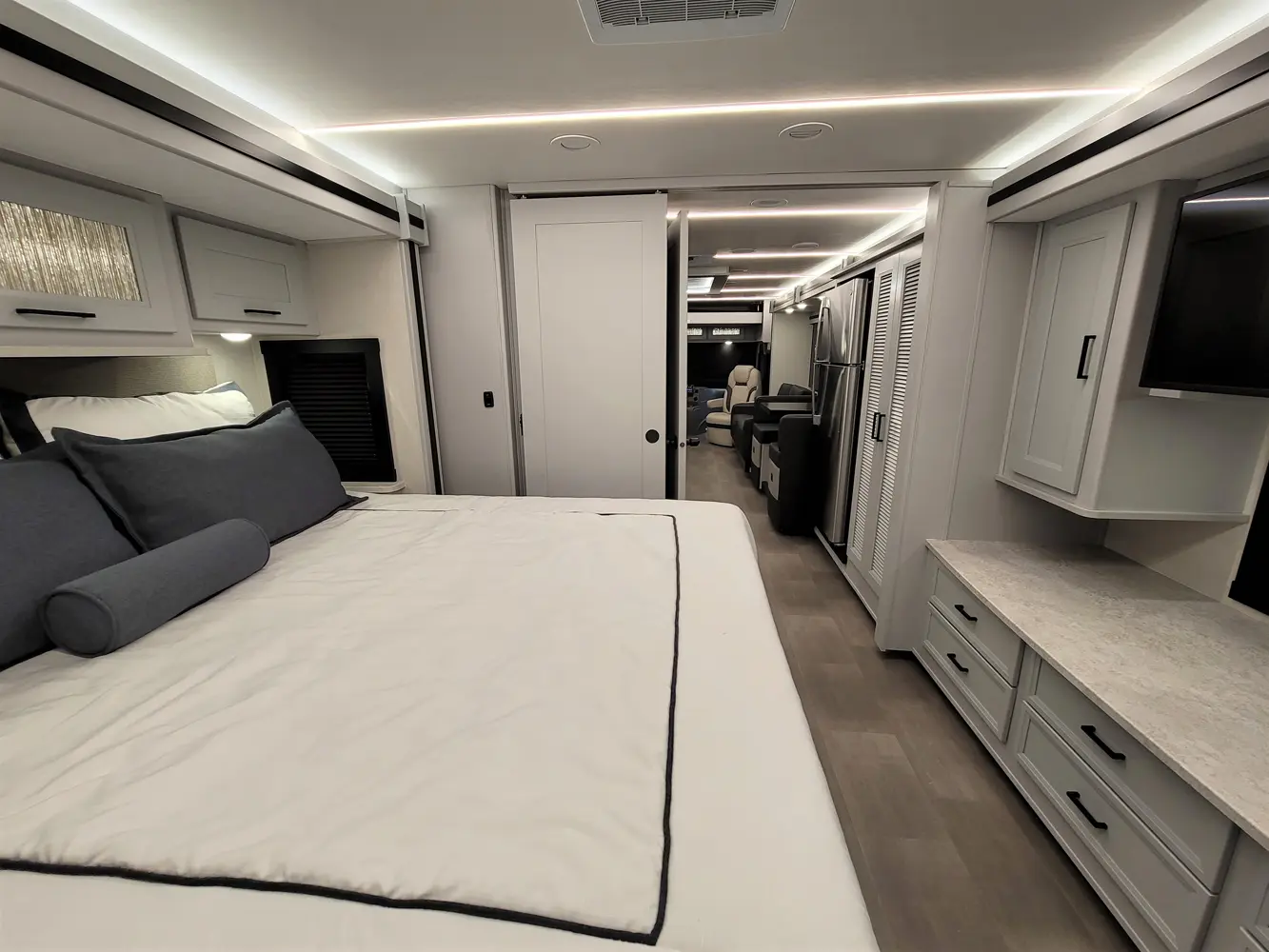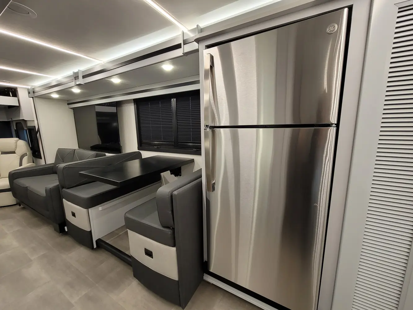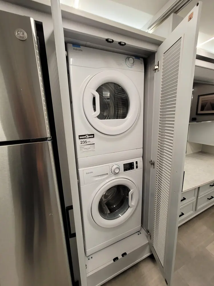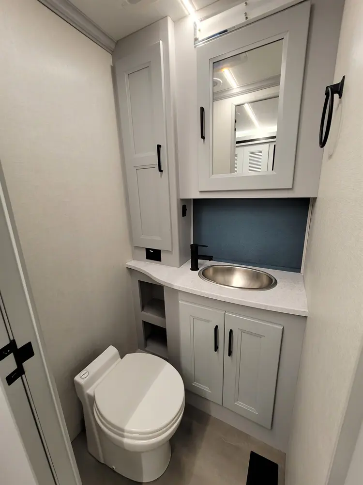 The Sportscoach RD 411TS is a powerful 41-foot diesel pusher designed for long-haul adventure. Its raised-rail Freightliner chassis, 360 hp Cummins engine, and air ride suspension deliver a smooth and confident ride over mountains or long highways. Inside, triple slides maximize space and include theater seating, a drop-down bunk, a king bed, and premium finishes like hardwood cabinets and solid-surface galley counters. This layout supports fully stocked road trips.