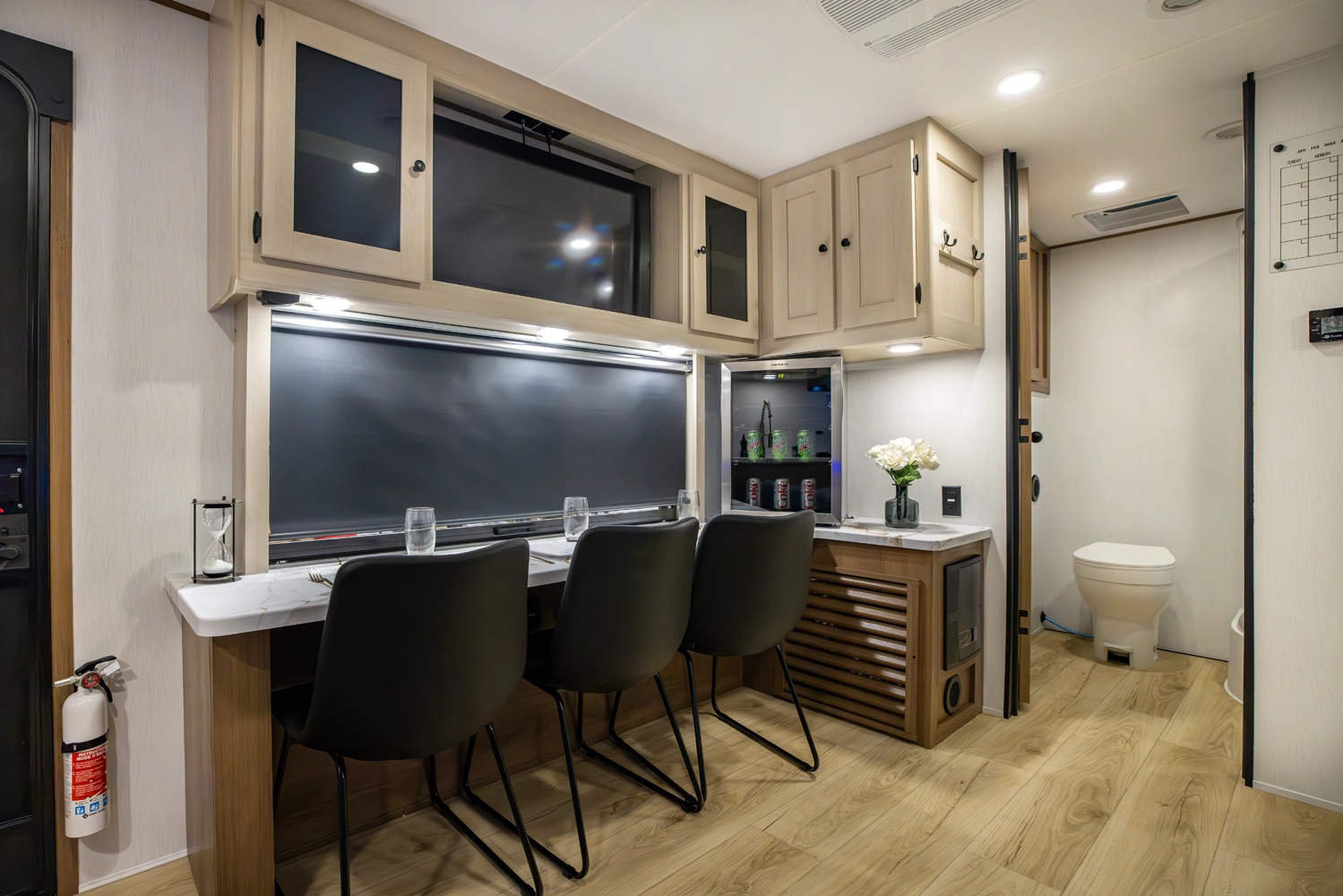 • Large Oversized Booth or U-Shaped Dinette w/ Sliding Door Storage Access (Select Models Only)