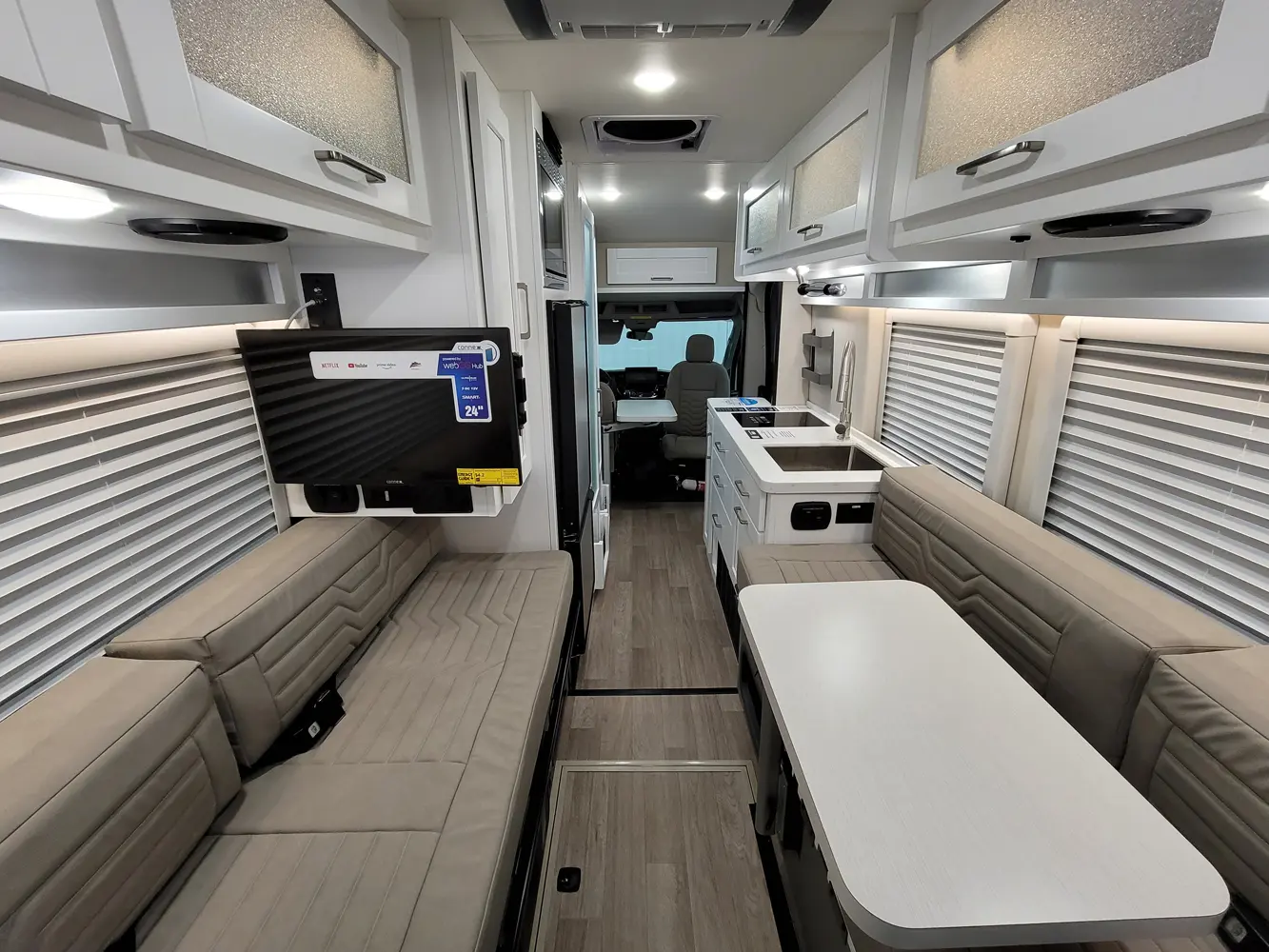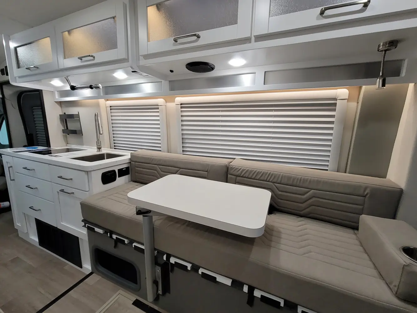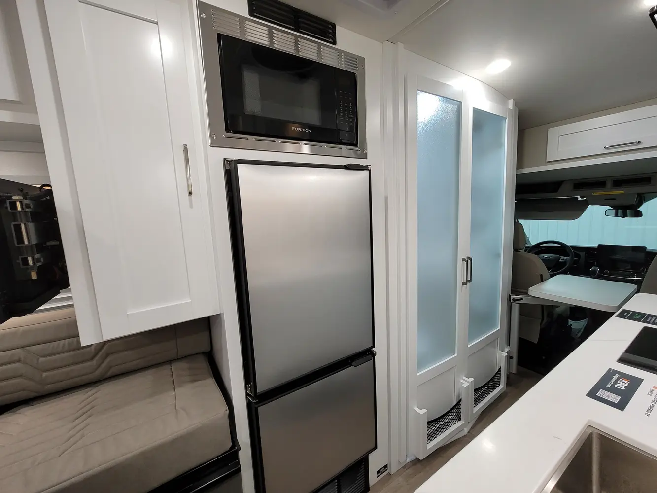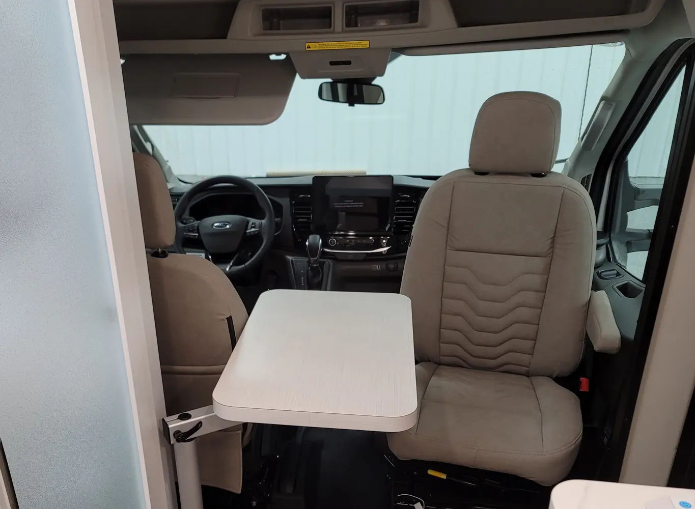 The Beyond 22D  has 0 slideouts and 1 entry door and rear doors. Interior layout from front to back; lagun table; door side Galley kitchen with LP cooktop and sink near entry; off door wet bath with toilet, convection microwave and refrigerator and wardrobe next to jump seat with overhead cabinets; door side 23 inch by 76 inch sofa with overhead cabinets; off-door side 23 inch by 76 inch sofa with overhead cabinets; lagun table; 68 inch by 76 inch bed from sofas