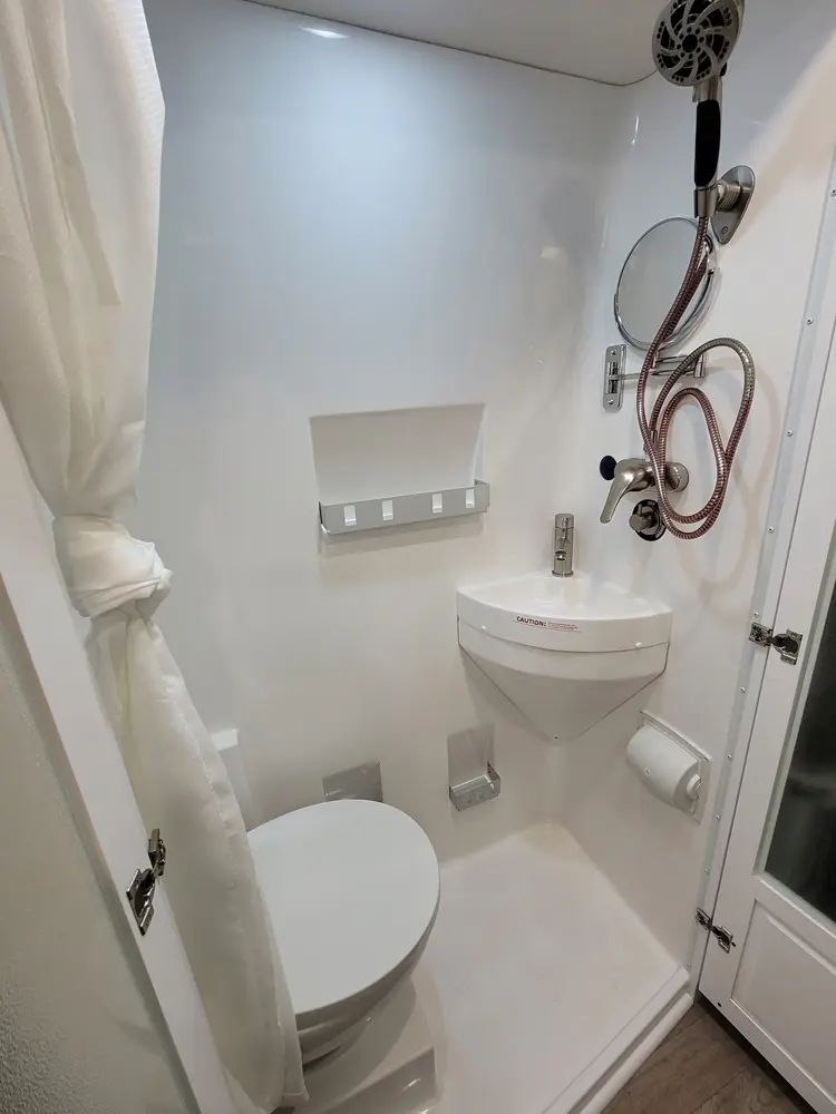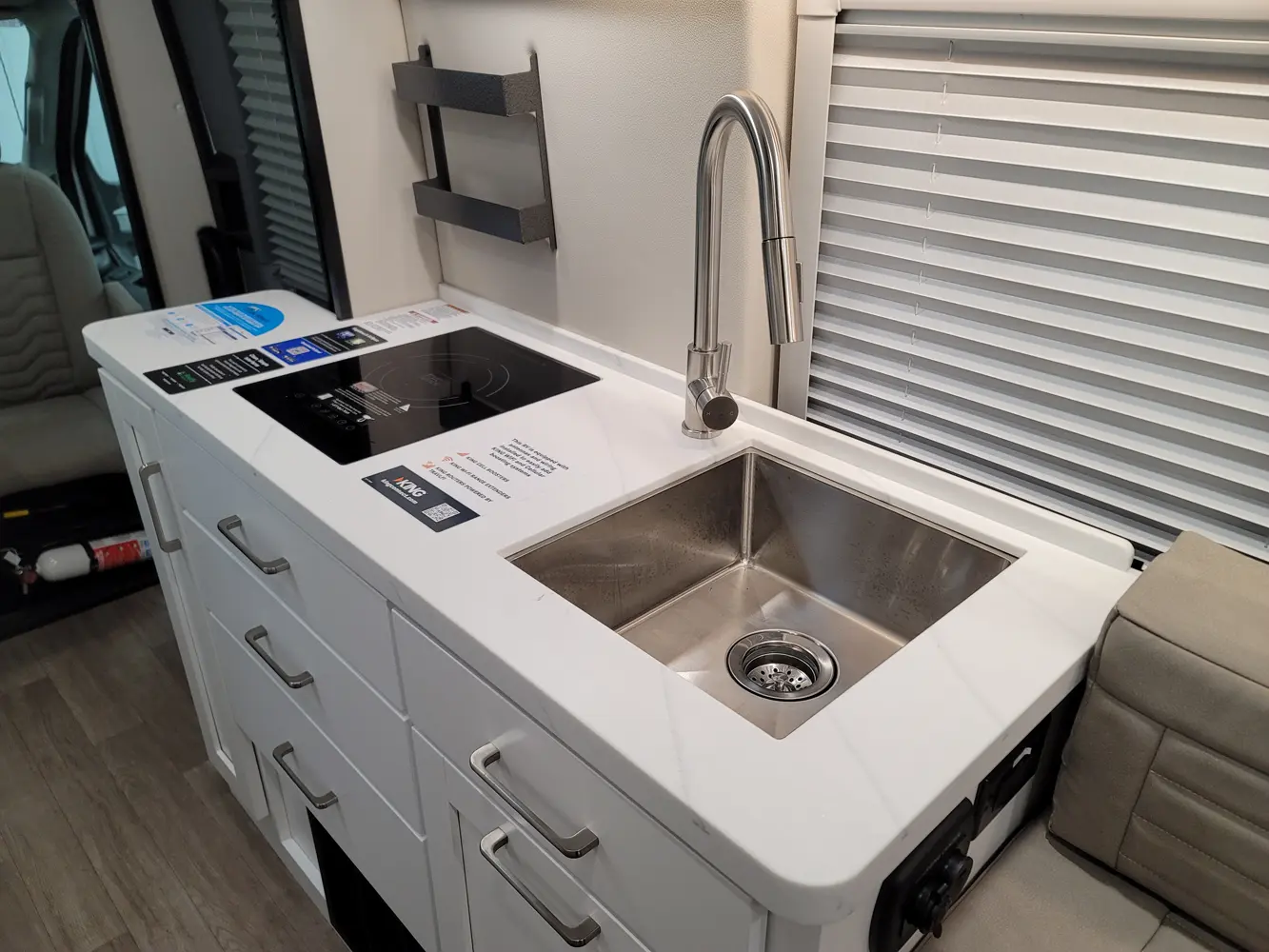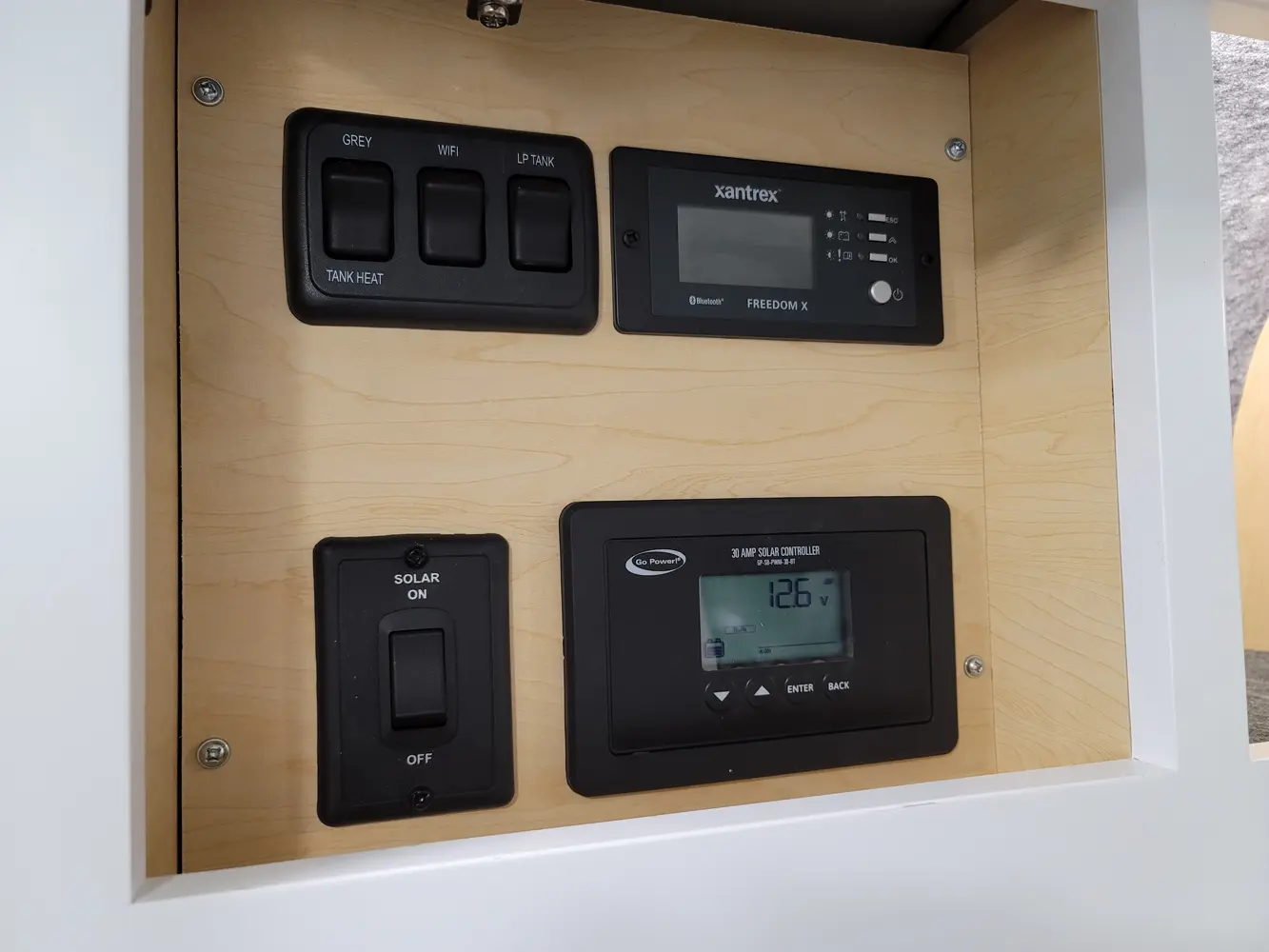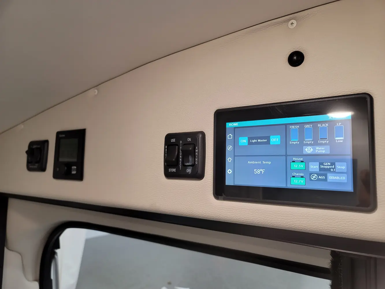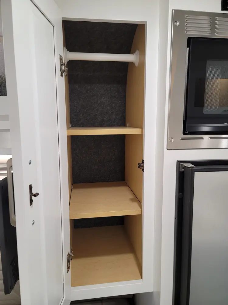 The Beyond 22D  has 0 slideouts and 1 entry door and rear doors. Interior layout from front to back; lagun table; door side Galley kitchen with LP cooktop and sink near entry; off door wet bath with toilet, convection microwave and refrigerator and wardrobe next to jump seat with overhead cabinets; door side 23 inch by 76 inch sofa with overhead cabinets; off-door side 23 inch by 76 inch sofa with overhead cabinets; lagun table; 68 inch by 76 inch bed from sofas