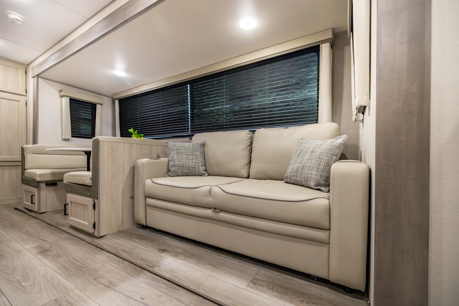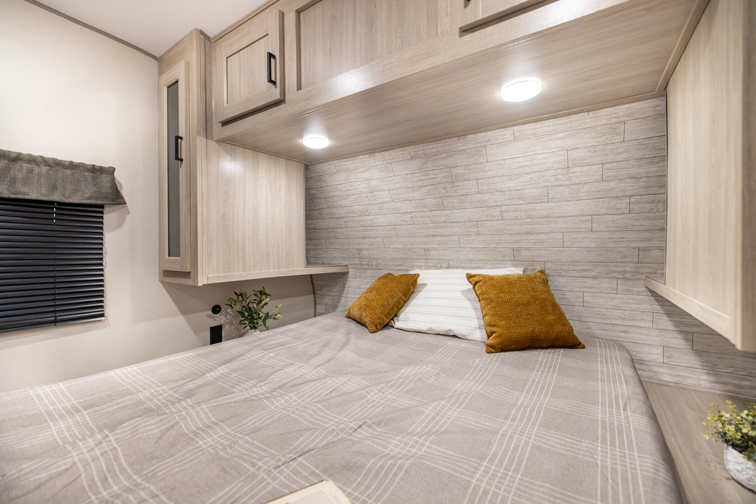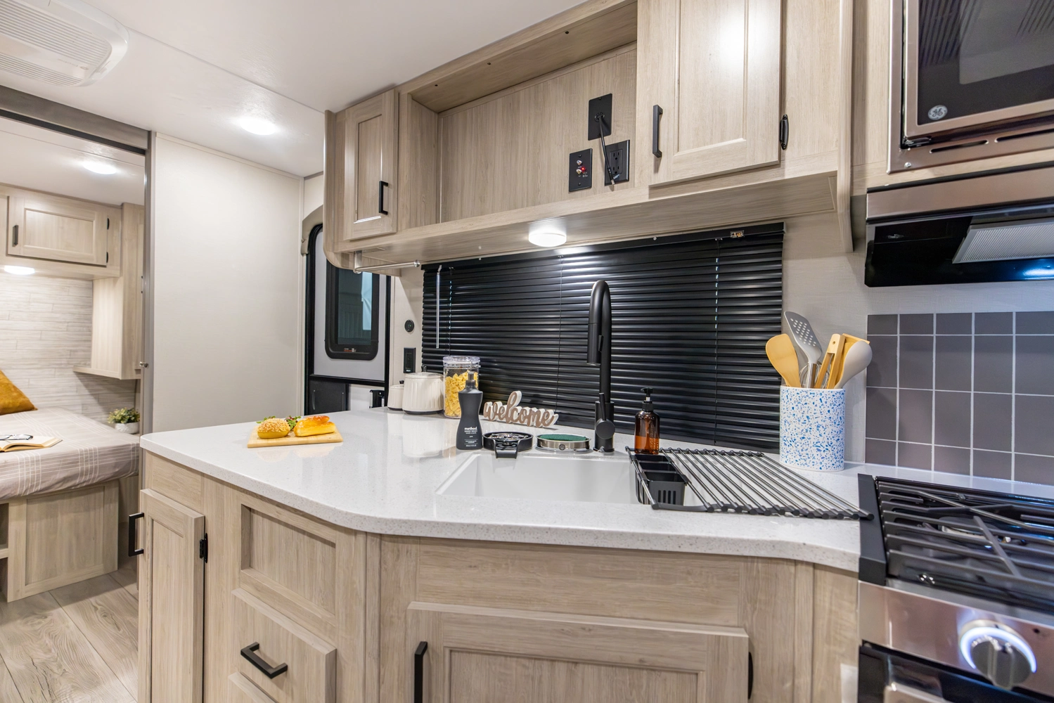 The popular 243RBS is the ideal couple’s coach! This floorplan boasts a full-size super slide with both a dinette and sofa, a spacious rear bathroom with a walk-in shower, extra-large pantry/wardrobe storage, a breakfast bar and private bedroom. The half-ton friendly towing weight and under 30’ real length makes this camper perfect for cross country travel or local weekend getaways!
