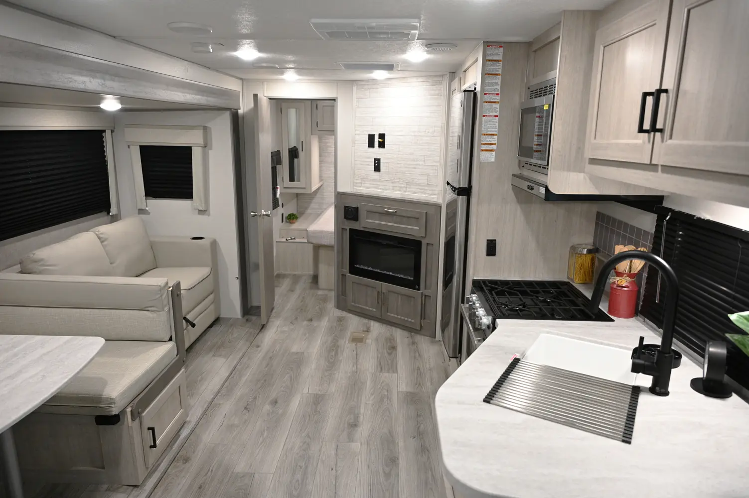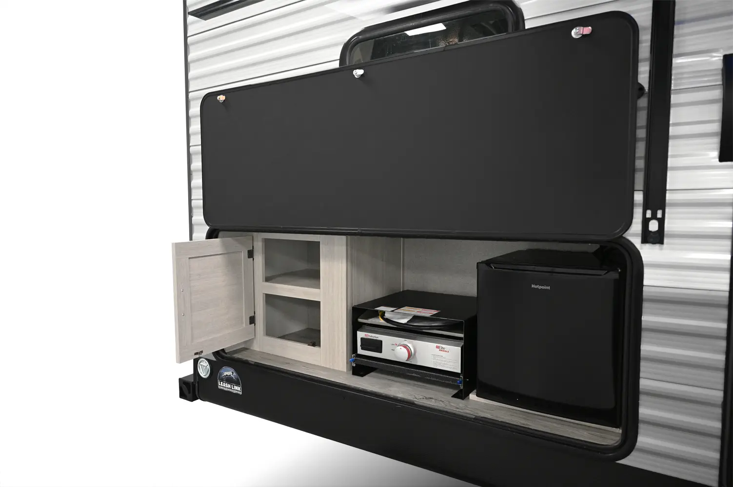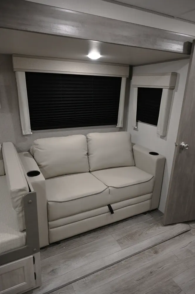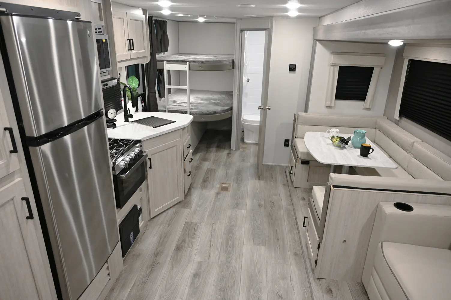 The 263BHS is a classic family bunk house floorplan. Plenty of sleeping is provided by a queen bed in the private master bedroom, two spacious double-over-double bunk beds, as well as our extra-large U-shaped dinette and jiffy bed sofa. Well thought-out features including the easy view angled entertainment center, generous kitchen pantry and standard outside camp kitchen. Additional storage spaces include the under-bunk cubby and floor-to-ceiling closet in the master bedroom.