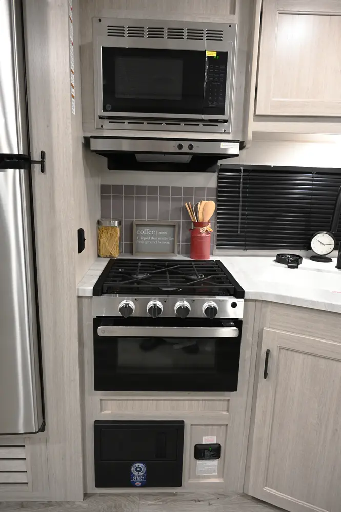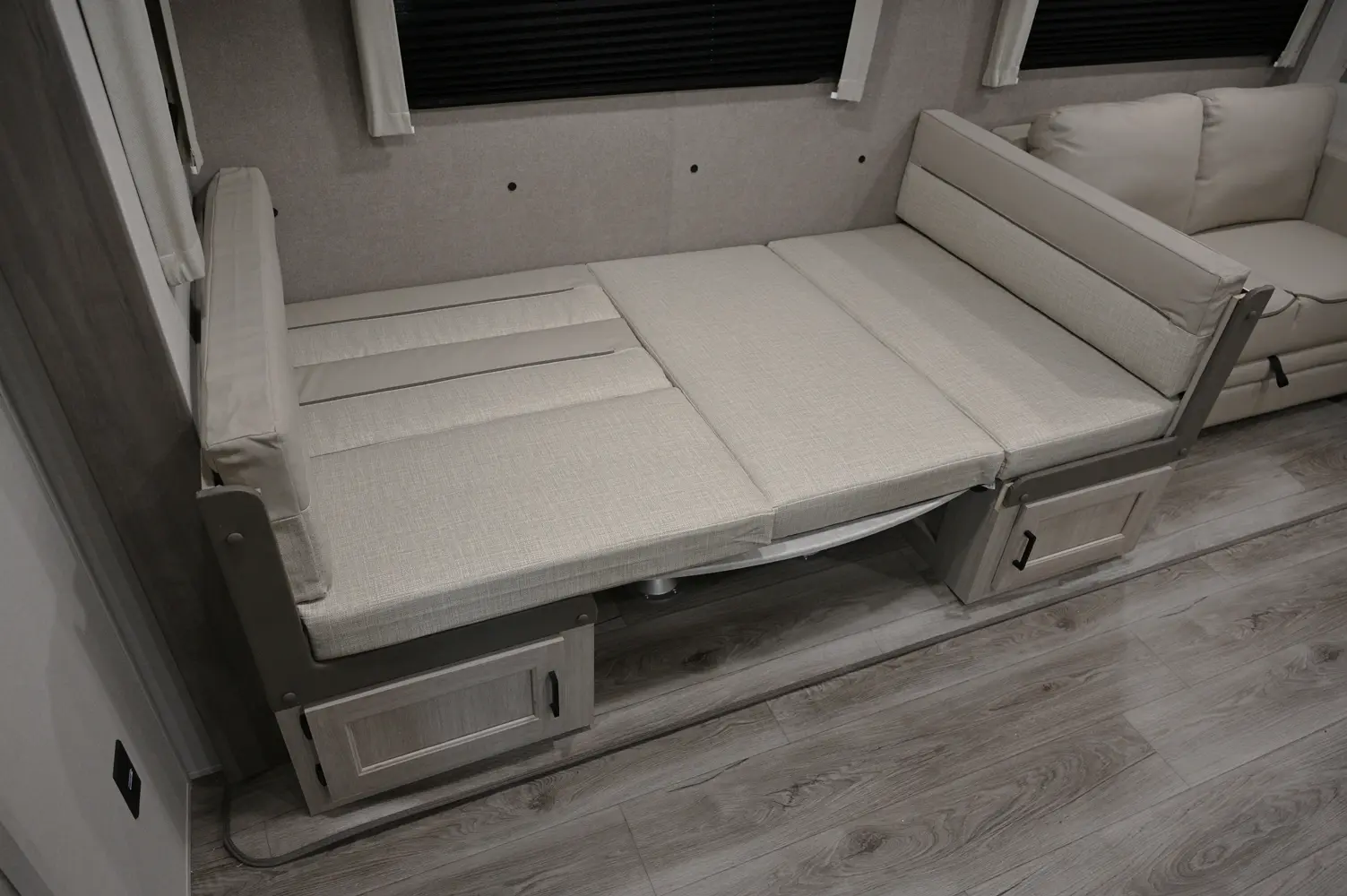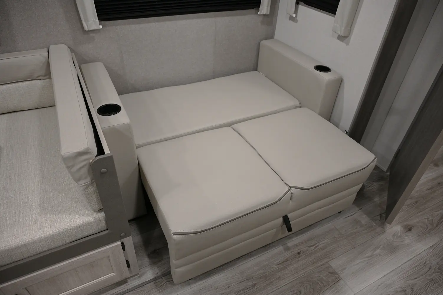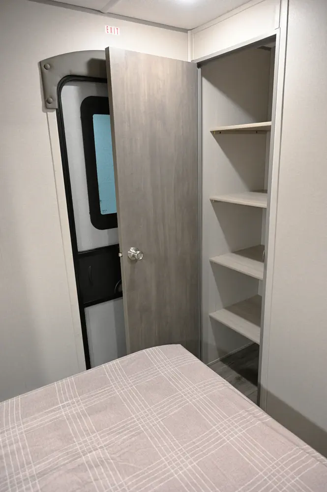 The 263BHS is a classic family bunk house floorplan. Plenty of sleeping is provided by a queen bed in the private master bedroom, two spacious double-over-double bunk beds, as well as our extra-large U-shaped dinette and jiffy bed sofa. Well thought-out features including the easy view angled entertainment center, generous kitchen pantry and standard outside camp kitchen. Additional storage spaces include the under-bunk cubby and floor-to-ceiling closet in the master bedroom.