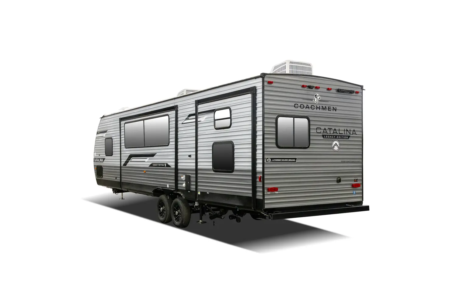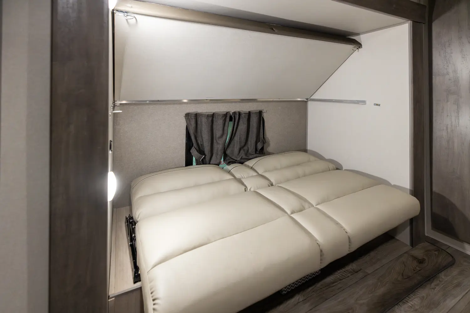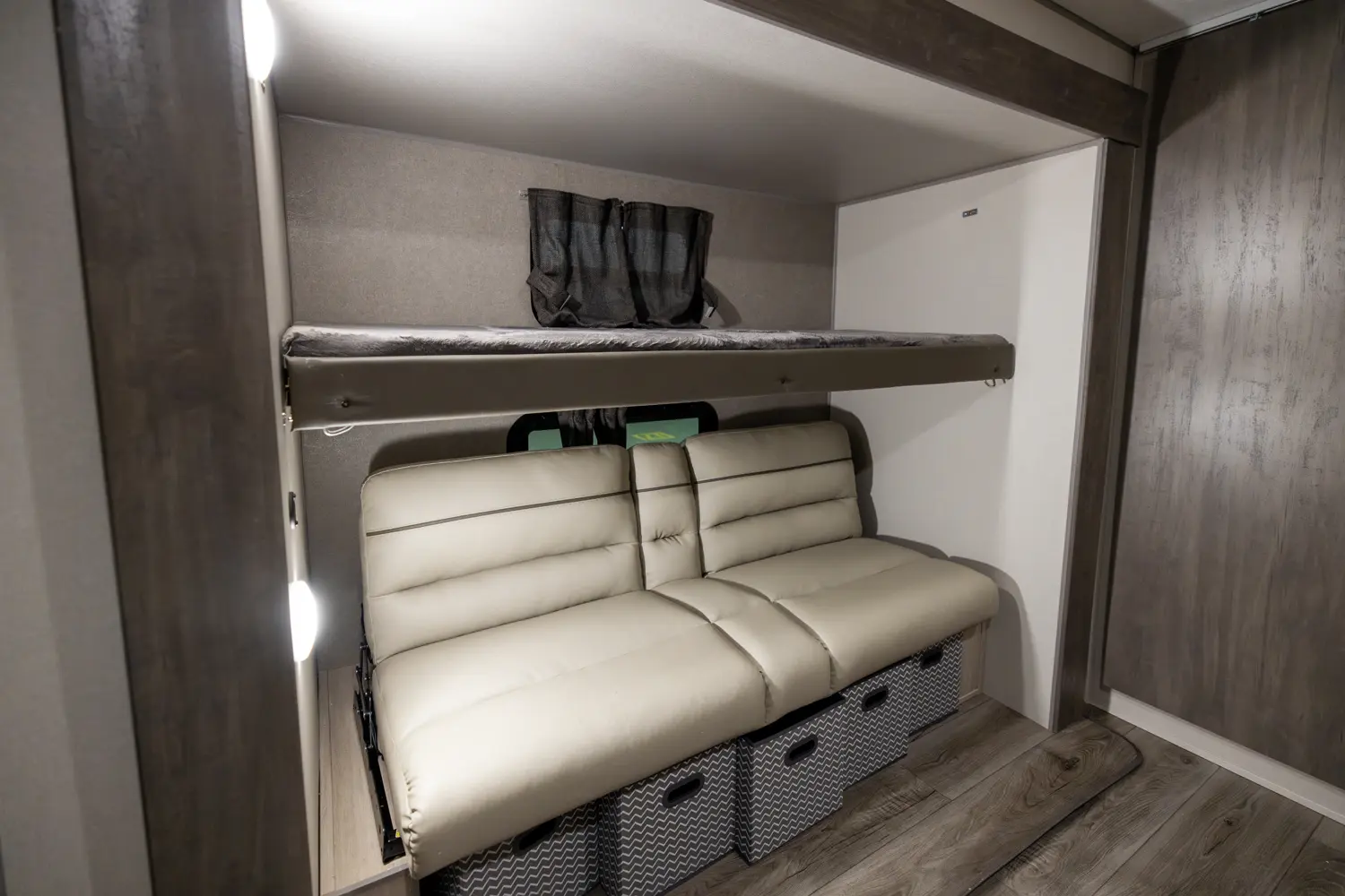 The 323BHDSCK is the ideal bunkhouse floorplan for families of all sizes! The bunk room is furnished with a double size loft bed, a single bunk that can be stowed for more room, the versatile COA cube lounge futon, its own ent. center, and abundant storage. The living room provides a large U-shape dinette and substantial pantry to meet the needs of any family. On the outside our standard large camp kitchen includes a griddle, dorm style refrigerator, sink, plus storage cabinets and drawers.