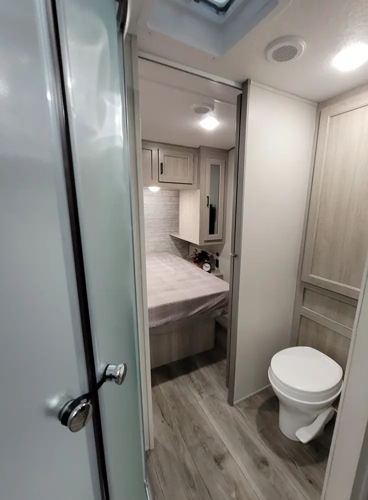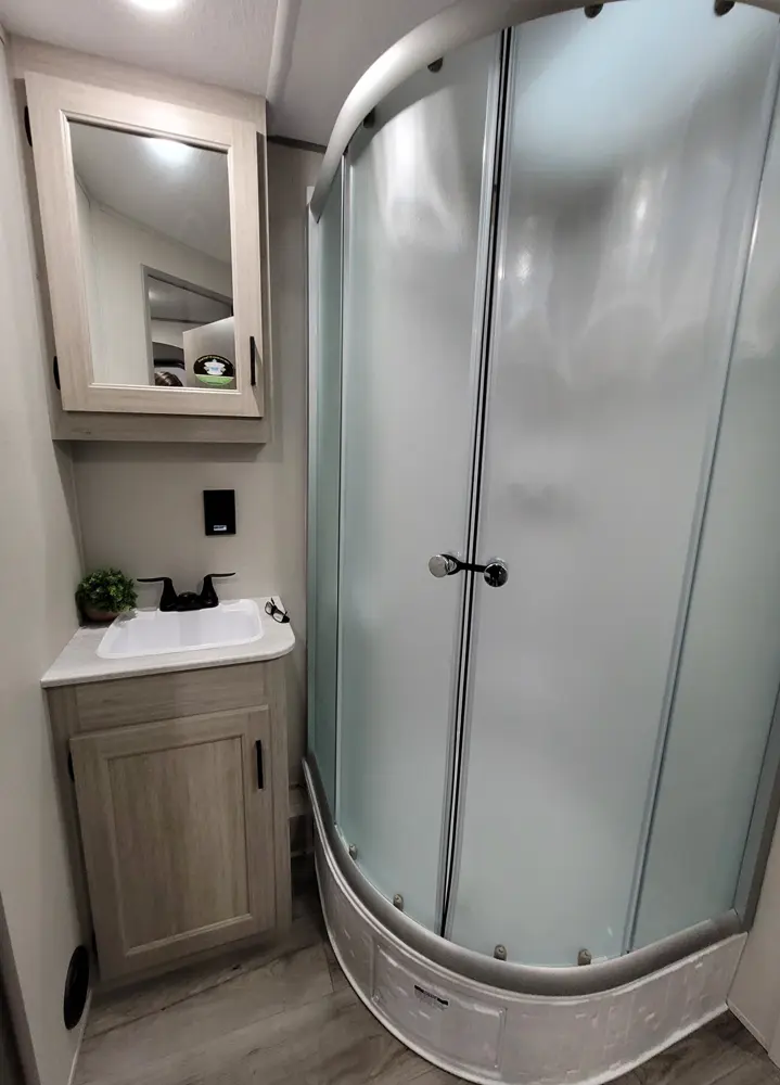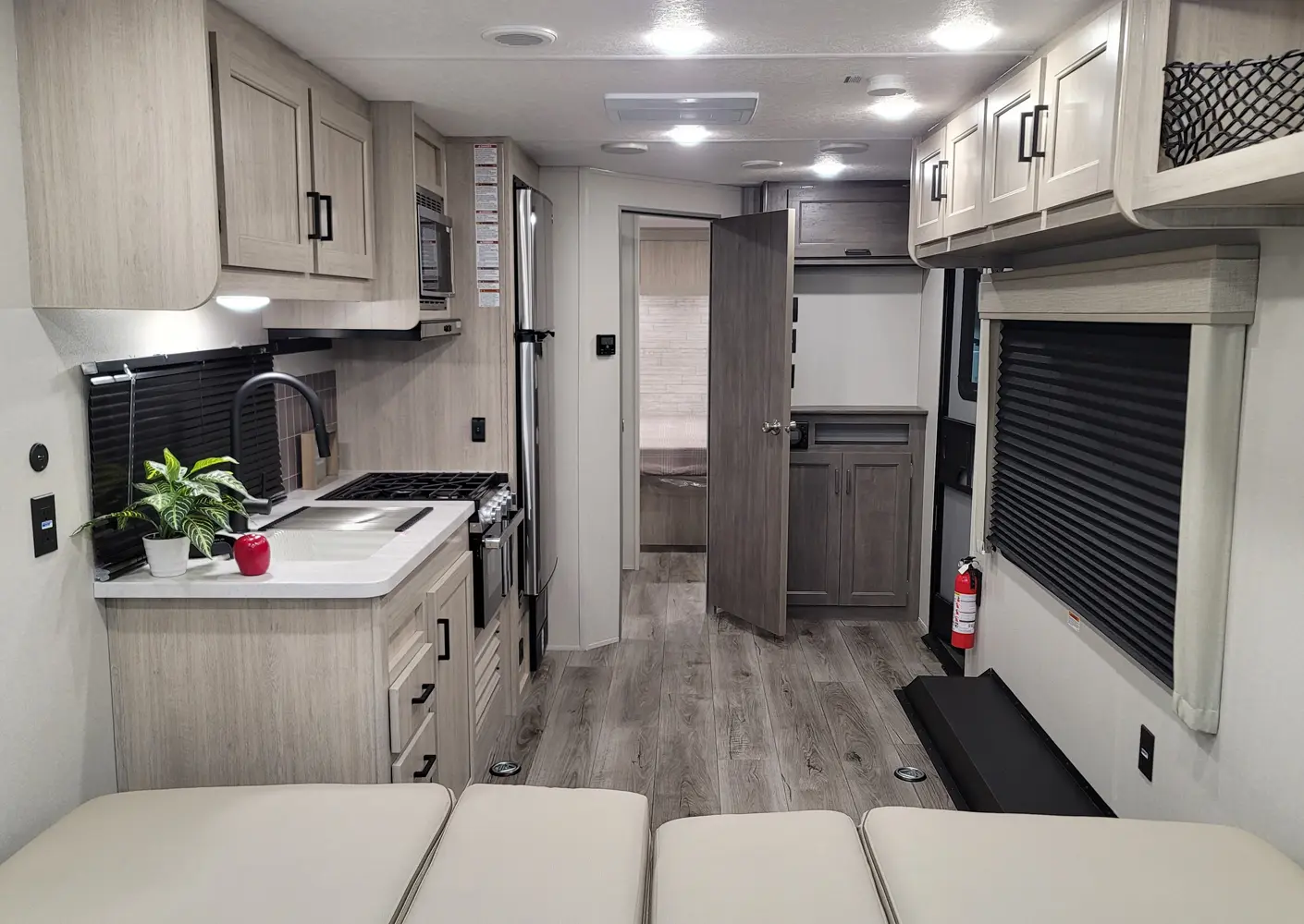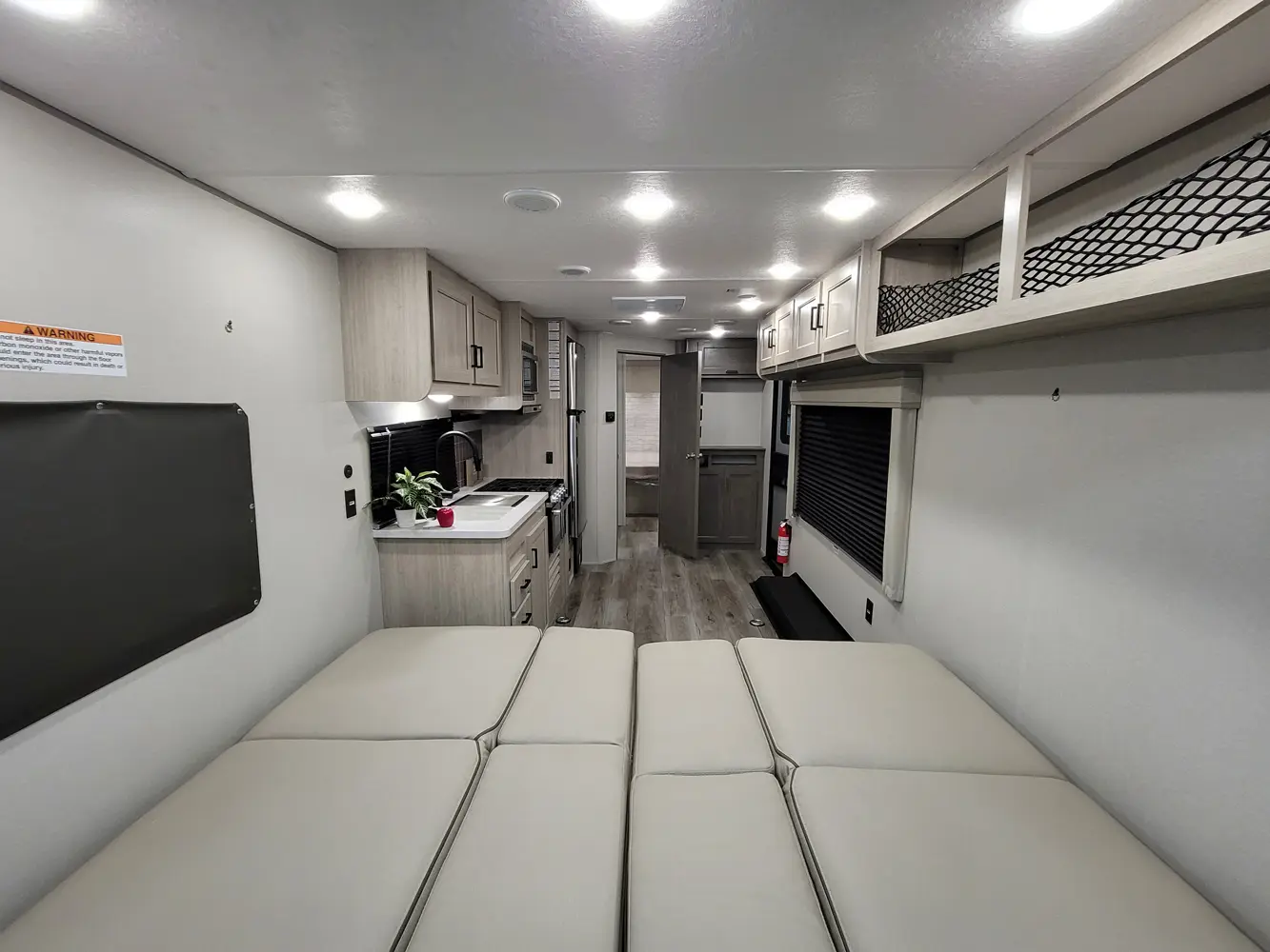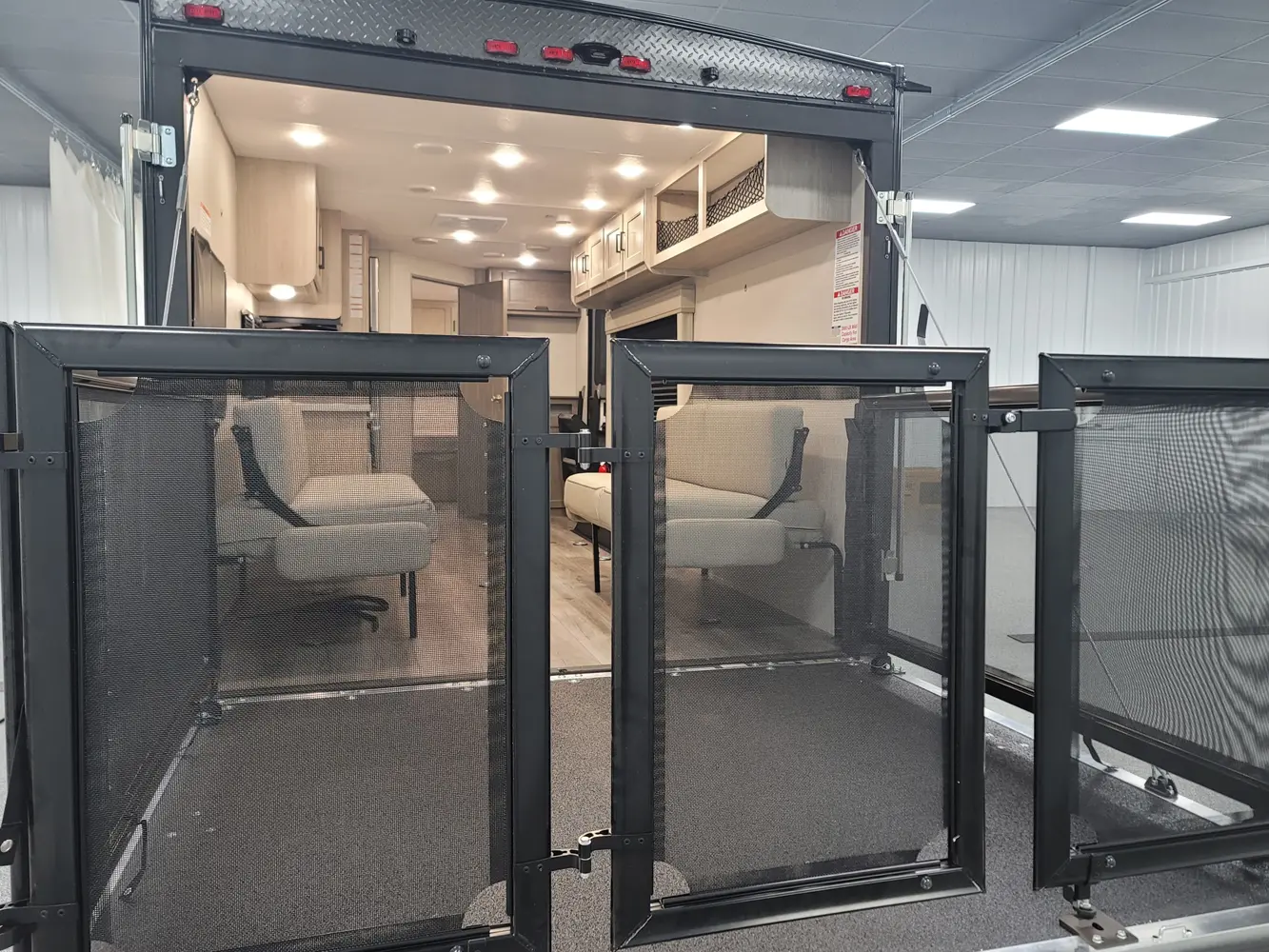 The 26TH has no slide outs and one entry door. Exterior features include a 15 foot awning, heavy-duty table, outside shower, front storage, and rear ramp door. Interior layout front to back: front queen bed with overhead cabinet and wardrobe on each side; pass through full bathroom with medicine cabinet and linen closet; entertainment center along inner wall and entry door; off-door side refrigerator, microwave, overhead cabinet, cooktop and sink; rear opposing fold down sofas with overhead cabinet on door side from rear to door. Optional party deck available on rear ramp door. Optional recliners available. Garage Dimensions: 6 foot 4 inches from rear to kitchen counter; 11 foot 6 inches from rear to refrigerator; 5 foot 11 inches between fold down sofas; 5 foot from kitchen counter to door side wall; 5 foot 2 inches from door side sofa to entry door; 11 inches folded up sofas.