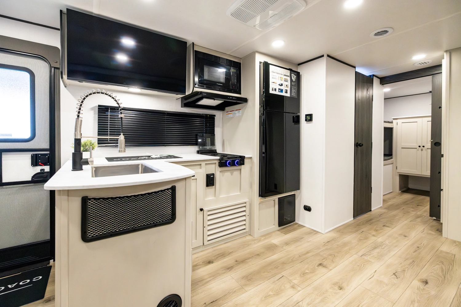 The 29BH is perfect for families looking for their next adventure. The private bunk room features both quad bunks as well as washer dryer prep. The living area includes a booth dinette and sofa in the super slide, a large pantry, an L shaped countertop and a 40” TV that comes standard.