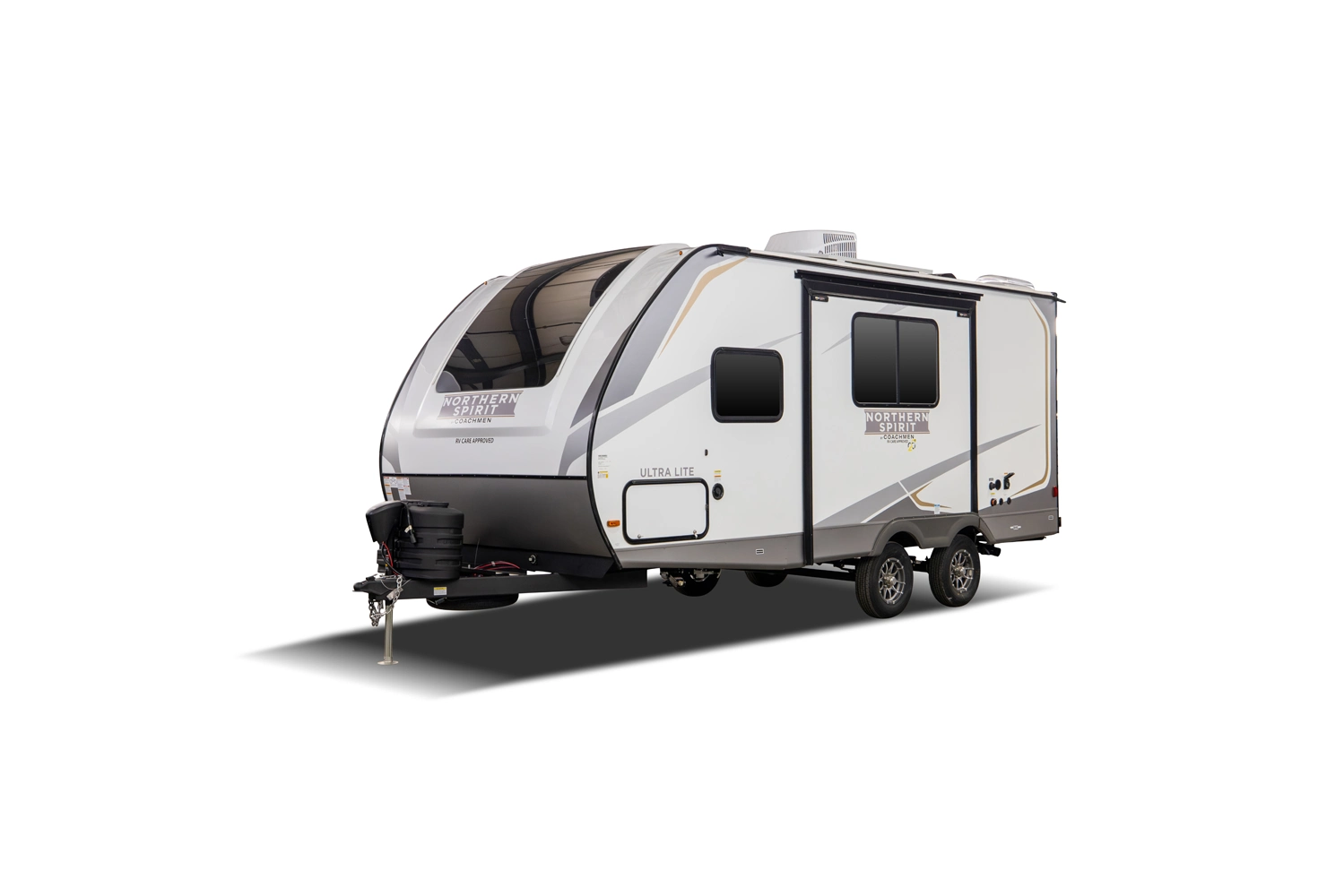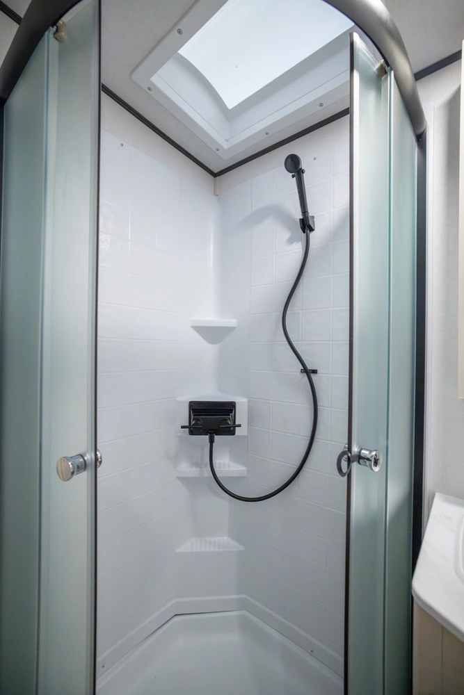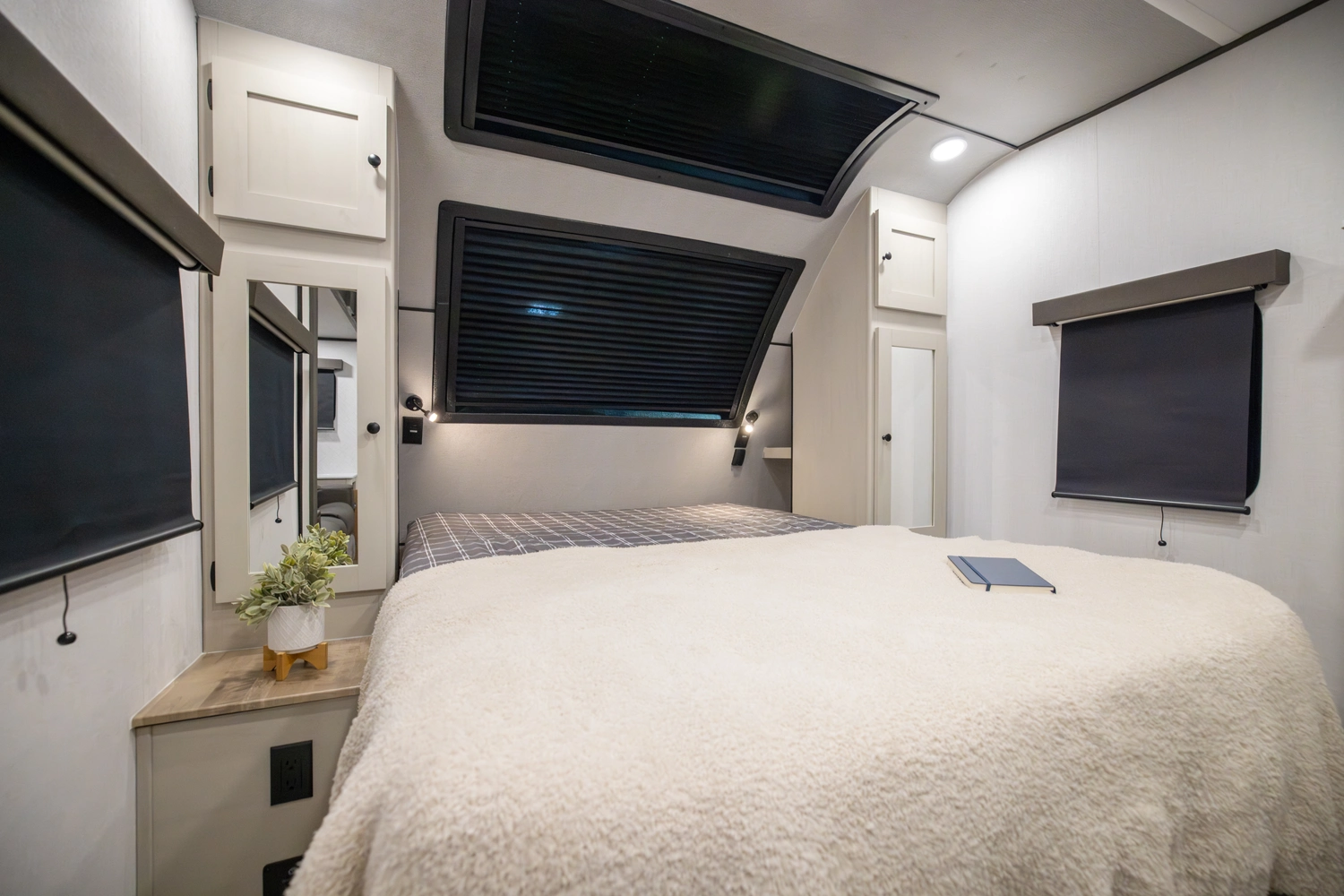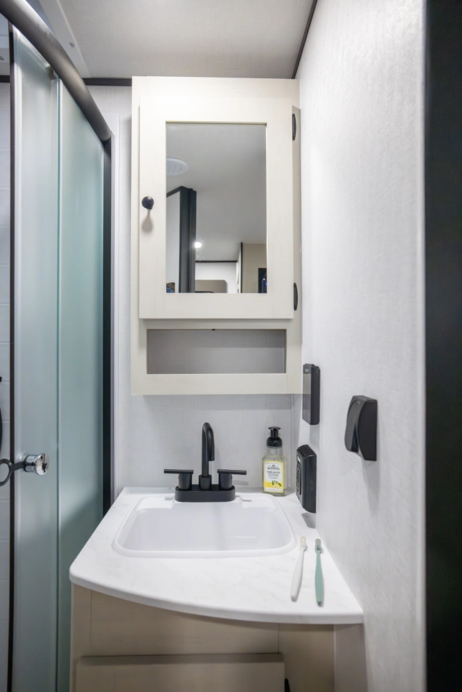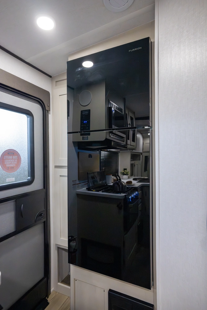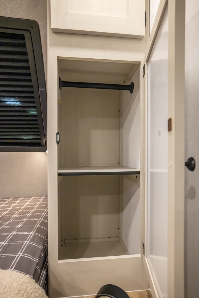 The perfect couple’s floorplan features a rear bathroom, L-Shaped kitchen counter top, an entertainment center with a sofa or theater seating, and our famous Max Bed Storage!